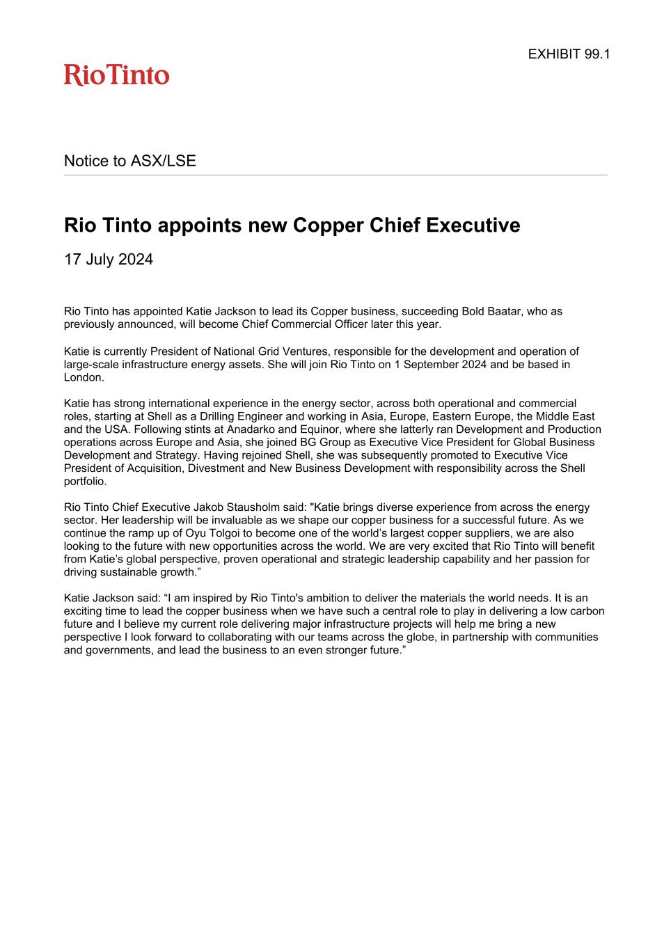 Notice to ASX/LSE Rio Tinto appoints new Copper Chief Executive 17 July 2024 Rio Tinto has appointed Katie Jackson to lead its Copper business, succeeding Bold Baatar, who as previously announced, will become Chief Commercial Officer later this year. Katie is currently President of National Grid Ventures, responsible for the development and operation of large-scale infrastructure energy assets. She will join Rio Tinto on 1 September 2024 and be based in London. Katie has strong international experience in the energy sector, across both operational and commercial roles, starting at Shell as a Drilling Engineer and working in Asia, Europe, Eastern Europe, the Middle East and the USA. Following stints at Anadarko and Equinor, where she latterly ran Development and Production operations across Europe and Asia, she joined BG Group as Executive Vice President for Global Business Development and Strategy. Having rejoined Shell, she was subsequently promoted to Executive Vice President of Acquisition, Divestment and New Business Development with responsibility across the Shell portfolio. Rio Tinto Chief Executive Jakob Stausholm said: "Katie brings diverse experience from across the energy sector. Her leadership will be invaluable as we shape our copper business for a successful future. As we continue the ramp up of Oyu Tolgoi to become one of the world’s largest copper suppliers, we are also looking to the future with new opportunities across the world. We are very excited that Rio Tinto will benefit from Katie’s global perspective, proven operational and strategic leadership capability and her passion for driving sustainable growth.” Katie Jackson said: “I am inspired by Rio Tinto's ambition to deliver the materials the world needs. It is an exciting time to lead the copper business when we have such a central role to play in delivering a low carbon future and I believe my current role delivering major infrastructure projects will help me bring a new perspective I look forward to collaborating with our teams across the globe, in partnership with communities and governments, and lead the business to an even stronger future.” EXHIBIT 99.1
