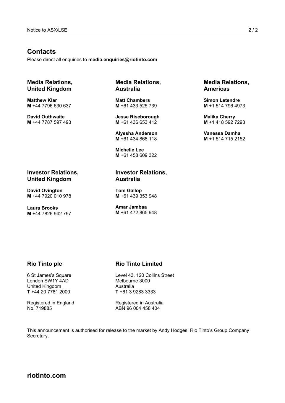 Notice to ASX/LSE 2 / 2 Contacts Please direct all enquiries to media.enquiries@riotinto.com Media Relations, United Kingdom Matthew Klar M +44 7796 630 637 David Outhwaite M +44 7787 597 493 Media Relations, Australia Matt Chambers M +61 433 525 739 Jesse Riseborough M +61 436 653 412 Alyesha Anderson M +61 434 868 118 Michelle Lee M +61 458 609 322 Media Relations, Americas Simon Letendre M +1 514 796 4973 Malika Cherry M +1 418 592 7293 Vanessa Damha M +1 514 715 2152 Investor Relations, United Kingdom David Ovington M +44 7920 010 978 Laura Brooks M +44 7826 942 797 Investor Relations, Australia Tom Gallop M +61 439 353 948 Amar Jambaa M +61 472 865 948 Rio Tinto plc 6 St James’s Square London SW1Y 4AD United Kingdom T +44 20 7781 2000 Registered in England No. 719885 Rio Tinto Limited Level 43, 120 Collins Street Melbourne 3000 Australia T +61 3 9283 3333 Registered in Australia ABN 96 004 458 404 This announcement is authorised for release to the market by Andy Hodges, Rio Tinto’s Group Company Secretary. riotinto.com