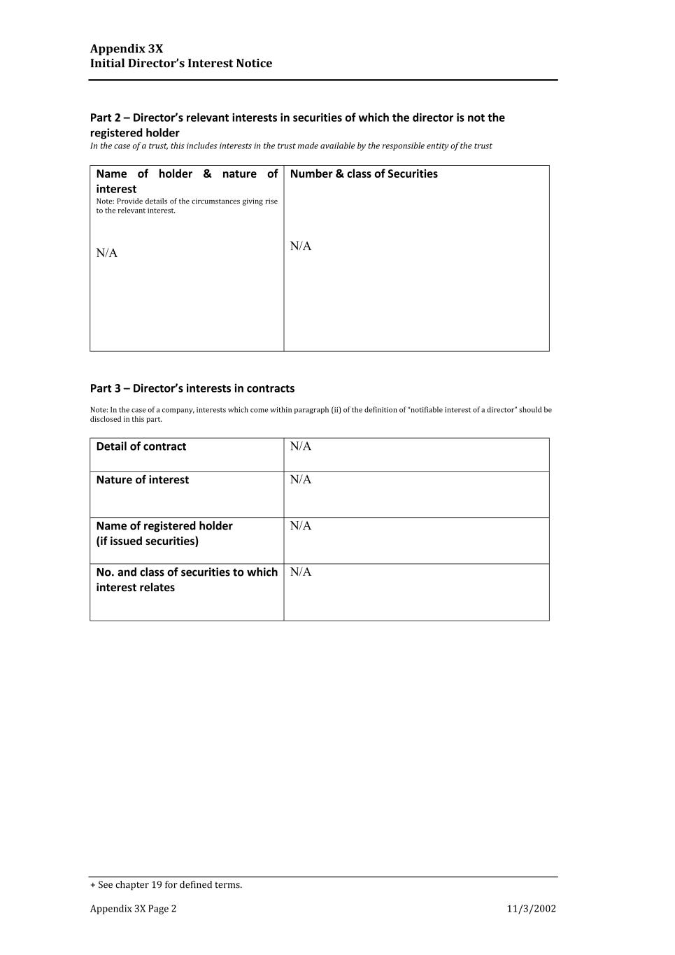 Appendix 3X Initial Director’s Interest Notice + See chapter 19 for defined terms. Appendix 3X Page 2 11/3/2002 Part 2 – Director’s relevant interests in securities of which the director is not the registered holder In the case of a trust, this includes interests in the trust made available by the responsible entity of the trust Name of holder & nature of interest Note: Provide details of the circumstances giving rise to the relevant interest. N/A Number & class of Securities N/A Part 3 – Director’s interests in contracts Note: In the case of a company, interests which come within paragraph (ii) of the definition of “notifiable interest of a director” should be disclosed in this part. Detail of contract N/A Nature of interest N/A Name of registered holder (if issued securities) N/A No. and class of securities to which interest relates N/A