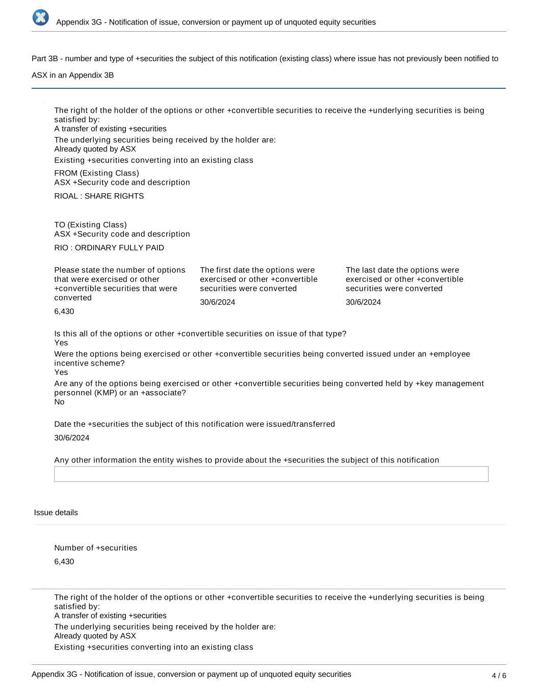 Appendix 3G - Notification of issue, conversion or payment up of unquoted equity securities Appendix 3G - Notification of issue, conversion or payment up of unquoted equity securities 4 / 6 Part 3B - number and type of +securities the subject of this notification (existing class) where issue has not previously been notified to ASX in an Appendix 3B The right of the holder of the options or other +convertible securities to receive the +underlying securities is being satisfied by: The underlying securities being received by the holder are: Existing +securities converting into an existing class FROM (Existing Class) ASX +Security code and description RIOAL : SHARE RIGHTS TO (Existing Class) ASX +Security code and description RIO : ORDINARY FULLY PAID Please state the number of options that were exercised or other +convertible securities that were converted 6,430 The first date the options were exercised or other +convertible securities were converted 30/6/2024 The last date the options were exercised or other +convertible securities were converted 30/6/2024 Is this all of the options or other +convertible securities on issue of that type? Were the options being exercised or other +convertible securities being converted issued under an +employee incentive scheme? Are any of the options being exercised or other +convertible securities being converted held by +key management personnel (KMP) or an +associate? Date the +securities the subject of this notification were issued/transferred 30/6/2024 Any other information the entity wishes to provide about the +securities the subject of this notification Issue details Number of +securities 6,430 The right of the holder of the options or other +convertible securities to receive the +underlying securities is being satisfied by: The underlying securities being received by the holder are: Existing +securities converting into an existing class FROM (Existing Class) Already quoted by ASX A transfer of existing +securities No Yes Yes Already quoted by ASX A transfer of existing +securities