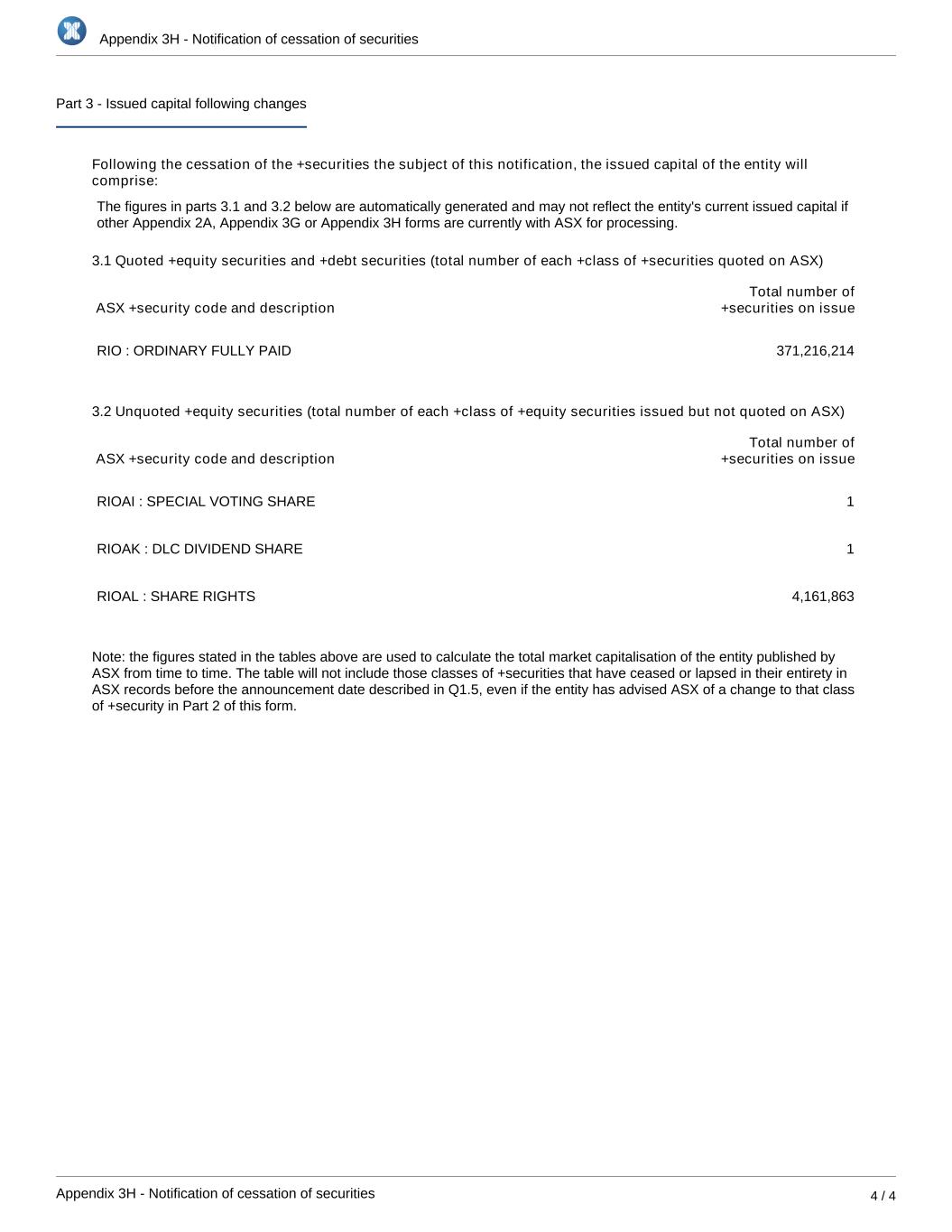 Appendix 3H - Notification of cessation of securities Appendix 3H - Notification of cessation of securities 4 / 4 Part 3 - Issued capital following changes Following the cessation of the +securities the subject of this notification, the issued capital of the entity will comprise: The figures in parts 3.1 and 3.2 below are automatically generated and may not reflect the entity's current issued capital if other Appendix 2A, Appendix 3G or Appendix 3H forms are currently with ASX for processing. 3.1 Quoted +equity securities and +debt securities (total number of each +class of +securities quoted on ASX) ASX +security code and description Total number of +securities on issue RIO : ORDINARY FULLY PAID 371,216,214 3.2 Unquoted +equity securities (total number of each +class of +equity securities issued but not quoted on ASX) ASX +security code and description Total number of +securities on issue RIOAI : SPECIAL VOTING SHARE 1 RIOAK : DLC DIVIDEND SHARE 1 RIOAL : SHARE RIGHTS 4,161,863 Note: the figures stated in the tables above are used to calculate the total market capitalisation of the entity published by ASX from time to time. The table will not include those classes of +securities that have ceased or lapsed in their entirety in ASX records before the announcement date described in Q1.5, even if the entity has advised ASX of a change to that class of +security in Part 2 of this form.