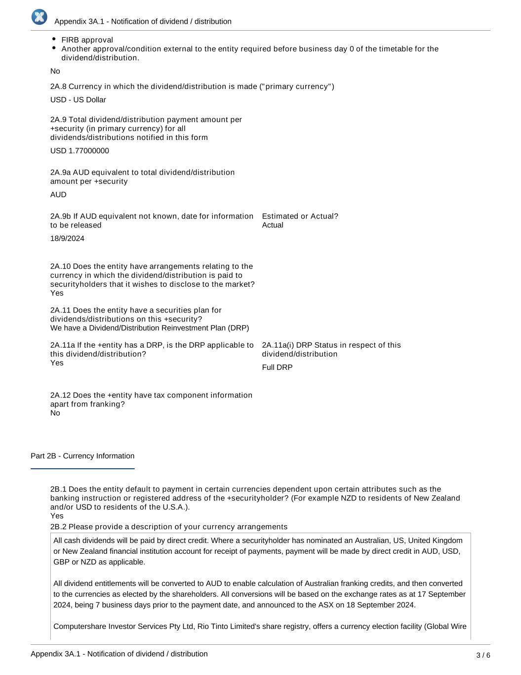 Appendix 3A.1 - Notification of dividend / distribution Appendix 3A.1 - Notification of dividend / distribution 3 / 6 FIRB approval Another approval/condition external to the entity required before business day 0 of the timetable for the dividend/distribution. 2A.8 Currency in which the dividend/distribution is made ("primary currency") USD - US Dollar 2A.9 Total dividend/distribution payment amount per +security (in primary currency) for all dividends/distributions notified in this form USD 1.77000000 2A.9a AUD equivalent to total dividend/distribution amount per +security AUD 2A.9b If AUD equivalent not known, date for information to be released 18/9/2024 Estimated or Actual? 2A.10 Does the entity have arrangements relating to the currency in which the dividend/distribution is paid to securityholders that it wishes to disclose to the market? 2A.11 Does the entity have a securities plan for dividends/distributions on this +security? 2A.11a If the +entity has a DRP, is the DRP applicable to this dividend/distribution? 2A.11a(i) DRP Status in respect of this dividend/distribution Full DRP 2A.12 Does the +entity have tax component information apart from franking? Part 2B - Currency Information 2B.1 Does the entity default to payment in certain currencies dependent upon certain attributes such as the banking instruction or registered address of the +securityholder? (For example NZD to residents of New Zealand and/or USD to residents of the U.S.A.). 2B.2 Please provide a description of your currency arrangements All cash dividends will be paid by direct credit. Where a securityholder has nominated an Australian, US, United Kingdom or New Zealand financial institution account for receipt of payments, payment will be made by direct credit in AUD, USD, GBP or NZD as applicable. All dividend entitlements will be converted to AUD to enable calculation of Australian franking credits, and then converted to the currencies as elected by the shareholders. All conversions will be based on the exchange rates as at 17 September 2024, being 7 business days prior to the payment date, and announced to the ASX on 18 September 2024. Computershare Investor Services Pty Ltd, Rio Tinto Limited's share registry, offers a currency election facility (Global Wire Yes No Yes We have a Dividend/Distribution Reinvestment Plan (DRP) Yes Actual No