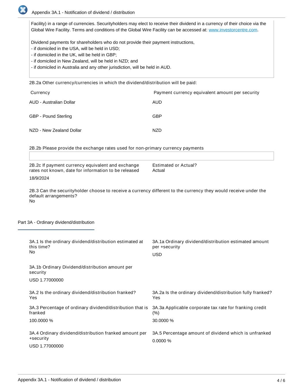Appendix 3A.1 - Notification of dividend / distribution Appendix 3A.1 - Notification of dividend / distribution 4 / 6 Facility) in a range of currencies. Securityholders may elect to receive their dividend in a currency of their choice via the Global Wire Facility. Terms and conditions of the Global Wire Facility can be accessed at: .www.investorcentre.com Dividend payments for shareholders who do not provide their payment instructions, - if domiciled in the USA, will be held in USD; - if domiciled in the UK, will be held in GBP; - if domiciled in New Zealand, will be held in NZD; and - if domiciled in Australia and any other jurisdiction, will be held in AUD. 2B.2a Other currency/currencies in which the dividend/distribution will be paid: Currency Payment currency equivalent amount per security AUD - Australian Dollar AUD GBP - Pound Sterling GBP NZD - New Zealand Dollar NZD 2B.2b Please provide the exchange rates used for non-primary currency payments 2B.2c If payment currency equivalent and exchange rates not known, date for information to be released 18/9/2024 Estimated or Actual? 2B.3 Can the securityholder choose to receive a currency different to the currency they would receive under the default arrangements? Part 3A - Ordinary dividend/distribution 3A.1 Is the ordinary dividend/distribution estimated at this time? 3A.1a Ordinary dividend/distribution estimated amount per +security USD 3A.1b Ordinary Dividend/distribution amount per security USD 1.77000000 3A.2 Is the ordinary dividend/distribution franked? 3A.2a Is the ordinary dividend/distribution fully franked? 3A.3 Percentage of ordinary dividend/distribution that is franked 100.0000 % 3A.3a Applicable corporate tax rate for franking credit (%) 30.0000 % 3A.4 Ordinary dividend/distribution franked amount per +security USD 1.77000000 3A.5 Percentage amount of dividend which is unfranked 0.0000 % YesYes No No Actual