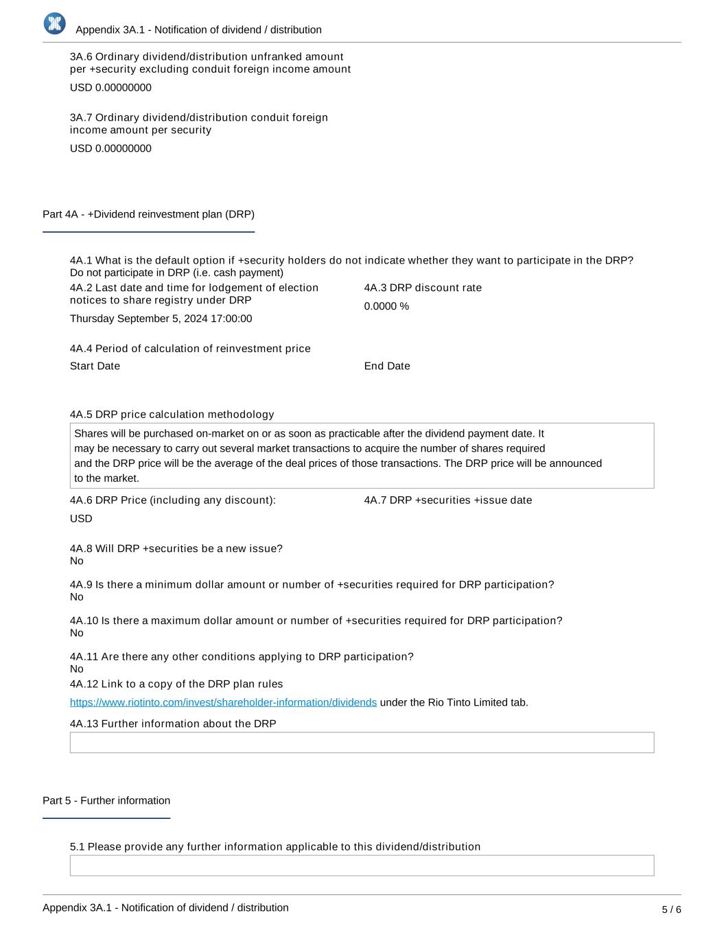 Appendix 3A.1 - Notification of dividend / distribution Appendix 3A.1 - Notification of dividend / distribution 5 / 6 3A.6 Ordinary dividend/distribution unfranked amount per +security excluding conduit foreign income amount USD 0.00000000 3A.7 Ordinary dividend/distribution conduit foreign income amount per security USD 0.00000000 Part 4A - +Dividend reinvestment plan (DRP) 4A.1 What is the default option if +security holders do not indicate whether they want to participate in the DRP? 4A.2 Last date and time for lodgement of election notices to share registry under DRP Thursday September 5, 2024 17:00:00 4A.3 DRP discount rate 0.0000 % 4A.4 Period of calculation of reinvestment price Start Date   End Date   4A.5 DRP price calculation methodology Shares will be purchased on-market on or as soon as practicable after the dividend payment date. It may be necessary to carry out several market transactions to acquire the number of shares required and the DRP price will be the average of the deal prices of those transactions. The DRP price will be announced to the market. 4A.6 DRP Price (including any discount): USD 4A.7 DRP +securities +issue date   4A.8 Will DRP +securities be a new issue? 4A.9 Is there a minimum dollar amount or number of +securities required for DRP participation? 4A.10 Is there a maximum dollar amount or number of +securities required for DRP participation? 4A.11 Are there any other conditions applying to DRP participation? 4A.12 Link to a copy of the DRP plan rules under the Rio Tinto Limited tab.https://www.riotinto.com/invest/shareholder-information/dividends 4A.13 Further information about the DRP Part 5 - Further information 5.1 Please provide any further information applicable to this dividend/distribution 5.2 Additional information for inclusion in the Announcement Summary No No No No Do not participate in DRP (i.e. cash payment)