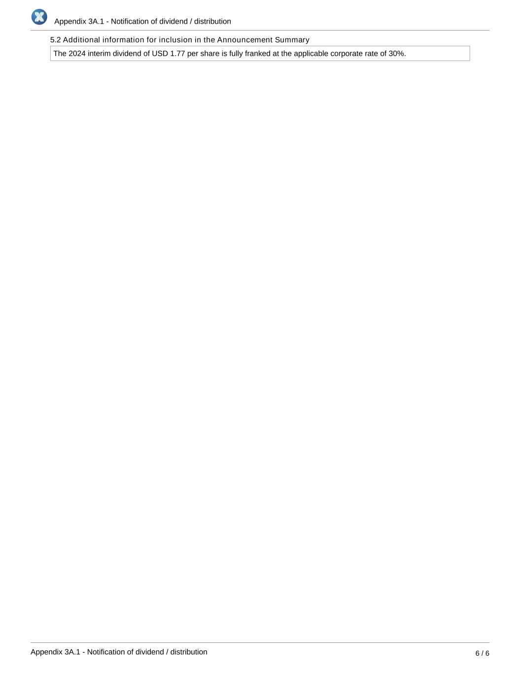 Appendix 3A.1 - Notification of dividend / distribution Appendix 3A.1 - Notification of dividend / distribution 6 / 6 5.2 Additional information for inclusion in the Announcement Summary The 2024 interim dividend of USD 1.77 per share is fully franked at the applicable corporate rate of 30%.