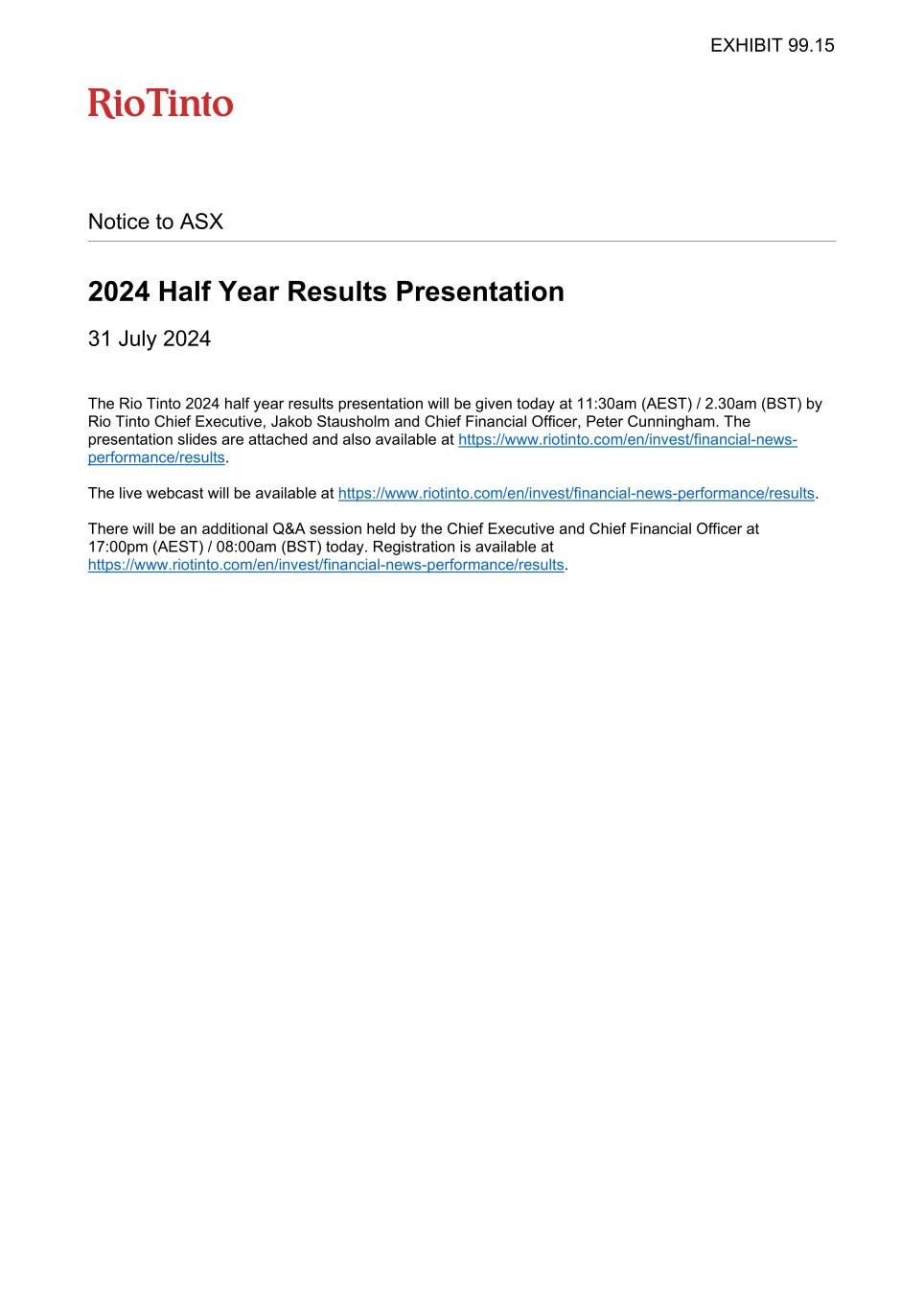 Notice to ASX 2024 Half Year Results Presentation 31 July 2024 The Rio Tinto 2024 half year results presentation will be given today at 11:30am (AEST) / 2.30am (BST) by Rio Tinto Chief Executive, Jakob Stausholm and Chief Financial Officer, Peter Cunningham. The presentation slides are attached and also available at https://www.riotinto.com/en/invest/financial-news- performance/results. The live webcast will be available at https://www.riotinto.com/en/invest/financial-news-performance/results. There will be an additional Q&A session held by the Chief Executive and Chief Financial Officer at 17:00pm (AEST) / 08:00am (BST) today. Registration is available at https://www.riotinto.com/en/invest/financial-news-performance/results. EXHIBIT 99.15