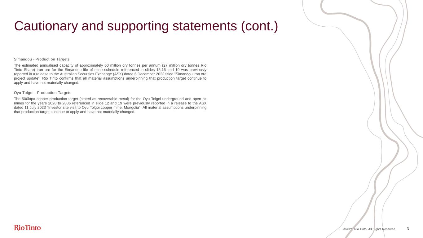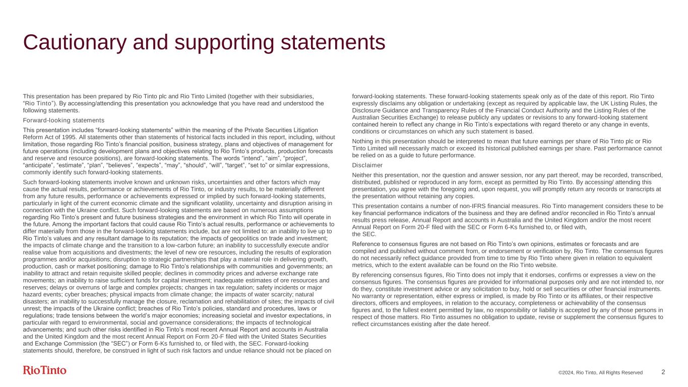 ©2024, Rio Tinto, All Rights Reserved 2 Cautionary and supporting statements This presentation has been prepared by Rio Tinto plc and Rio Tinto Limited (together with their subsidiaries, “Rio Tinto”). By accessing/attending this presentation you acknowledge that you have read and understood the following statements. Forward-looking statements This presentation includes “forward-looking statements” within the meaning of the Private Securities Litigation Reform Act of 1995. All statements other than statements of historical facts included in this report, including, without limitation, those regarding Rio Tinto’s financial position, business strategy, plans and objectives of management for future operations (including development plans and objectives relating to Rio Tinto’s products, production forecasts and reserve and resource positions), are forward-looking statements. The words “intend”, “aim”, “project”, “anticipate”, “estimate”, “plan”, “believes”, “expects”, “may”, “should”, “will”, “target”, “set to” or similar expressions, commonly identify such forward-looking statements. Such forward-looking statements involve known and unknown risks, uncertainties and other factors which may cause the actual results, performance or achievements of Rio Tinto, or industry results, to be materially different from any future results, performance or achievements expressed or implied by such forward-looking statements, particularly in light of the current economic climate and the significant volatility, uncertainty and disruption arising in connection with the Ukraine conflict. Such forward-looking statements are based on numerous assumptions regarding Rio Tinto’s present and future business strategies and the environment in which Rio Tinto will operate in the future. Among the important factors that could cause Rio Tinto’s actual results, performance or achievements to differ materially from those in the forward-looking statements include, but are not limited to: an inability to live up to Rio Tinto’s values and any resultant damage to its reputation; the impacts of geopolitics on trade and investment; the impacts of climate change and the transition to a low-carbon future; an inability to successfully execute and/or realise value from acquisitions and divestments; the level of new ore resources, including the results of exploration programmes and/or acquisitions; disruption to strategic partnerships that play a material role in delivering growth, production, cash or market positioning; damage to Rio Tinto’s relationships with communities and governments; an inability to attract and retain requisite skilled people; declines in commodity prices and adverse exchange rate movements; an inability to raise sufficient funds for capital investment; inadequate estimates of ore resources and reserves; delays or overruns of large and complex projects; changes in tax regulation; safety incidents or major hazard events; cyber breaches; physical impacts from climate change; the impacts of water scarcity; natural disasters; an inability to successfully manage the closure, reclamation and rehabilitation of sites; the impacts of civil unrest; the impacts of the Ukraine conflict; breaches of Rio Tinto’s policies, standard and procedures, laws or regulations; trade tensions between the world’s major economies; increasing societal and investor expectations, in particular with regard to environmental, social and governance considerations; the impacts of technological advancements; and such other risks identified in Rio Tinto’s most recent Annual Report and accounts in Australia and the United Kingdom and the most recent Annual Report on Form 20-F filed with the United States Securities and Exchange Commission (the “SEC”) or Form 6-Ks furnished to, or filed with, the SEC. Forward-looking statements should, therefore, be construed in light of such risk factors and undue reliance should not be placed on forward-looking statements. These forward-looking statements speak only as of the date of this report. Rio Tinto expressly disclaims any obligation or undertaking (except as required by applicable law, the UK Listing Rules, the Disclosure Guidance and Transparency Rules of the Financial Conduct Authority and the Listing Rules of the Australian Securities Exchange) to release publicly any updates or revisions to any forward-looking statement contained herein to reflect any change in Rio Tinto’s expectations with regard thereto or any change in events, conditions or circumstances on which any such statement is based. Nothing in this presentation should be interpreted to mean that future earnings per share of Rio Tinto plc or Rio Tinto Limited will necessarily match or exceed its historical published earnings per share. Past performance cannot be relied on as a guide to future performance. Disclaimer Neither this presentation, nor the question and answer session, nor any part thereof, may be recorded, transcribed, distributed, published or reproduced in any form, except as permitted by Rio Tinto. By accessing/ attending this presentation, you agree with the foregoing and, upon request, you will promptly return any records or transcripts at the presentation without retaining any copies. This presentation contains a number of non-IFRS financial measures. Rio Tinto management considers these to be key financial performance indicators of the business and they are defined and/or reconciled in Rio Tinto’s annual results press release, Annual Report and accounts in Australia and the United Kingdom and/or the most recent Annual Report on Form 20-F filed with the SEC or Form 6-Ks furnished to, or filed with, the SEC. Reference to consensus figures are not based on Rio Tinto’s own opinions, estimates or forecasts and are compiled and published without comment from, or endorsement or verification by, Rio Tinto. The consensus figures do not necessaril
