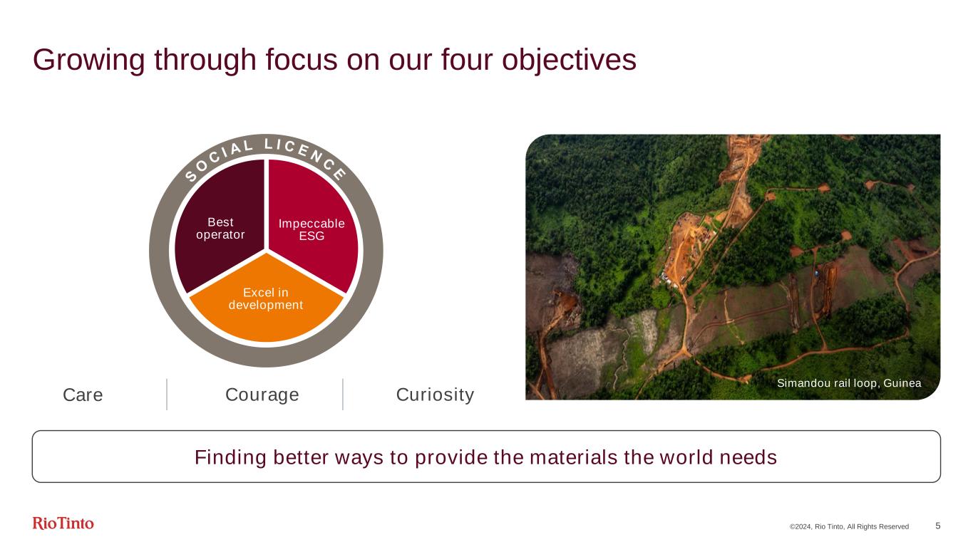 ©2024, Rio Tinto, All Rights Reserved 5 Growing through focus on our four objectives Care Courage Curiosity Excel in development Best operator Impeccable ESG S O C I A L L I C E N C E Finding better ways to provide the materials the world needs Simandou rail loop, Guinea