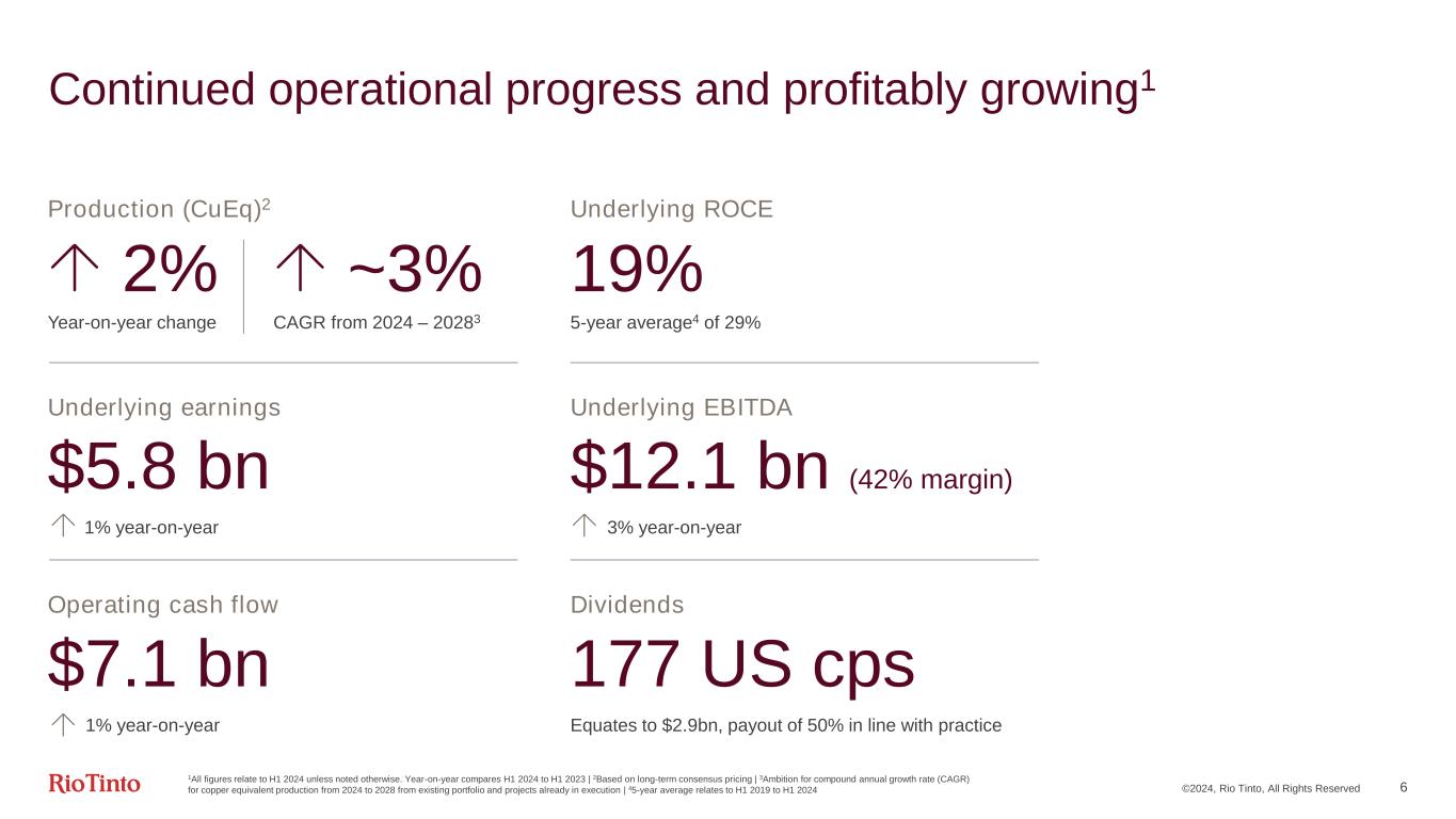 $7.1 bn 1% year-on-year ©2024, Rio Tinto, All Rights Reserved 6 Continued operational progress and profitably growing1 1All figures relate to H1 2024 unless noted otherwise. Year-on-year compares H1 2024 to H1 2023 | 2Based on long-term consensus pricing | 3Ambition for compound annual growth rate (CAGR) for copper equivalent production from 2024 to 2028 from existing portfolio and projects already in execution | 45-year average relates to H1 2019 to H1 2024 Underlying ROCE Dividends 177 US cps Equates to $2.9bn, payout of 50% in line with practice Underlying earnings $5.8 bn 1% year-on-year Operating cash flow Production (CuEq)2 2% Year-on-year change Underlying EBITDA ~3% CAGR from 2024 – 20283 19% 5-year average4 of 29% $12.1 bn (42% margin) 3% year-on-year