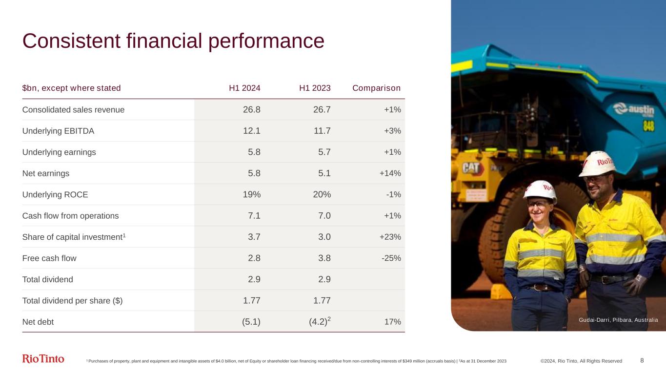 ©2024, Rio Tinto, All Rights Reserved 8 Consistent financial performance $bn, except where stated H1 2024 H1 2023 Comparison Consolidated sales revenue 26.8 26.7 +1% Underlying EBITDA 12.1 11.7 +3% Underlying earnings 5.8 5.7 +1% Net earnings 5.8 5.1 +14% Underlying ROCE 19% 20% -1% Cash flow from operations 7.1 7.0 +1% Share of capital investment1 3.7 3.0 +23% Free cash flow 2.8 3.8 -25% Total dividend 2.9 2.9 Total dividend per share ($) 1.77 1.77 Net debt (5.1) (4.2)2 17% Gudai-Darri, Pilbara, Australia 1 Purchases of property, plant and equipment and intangible assets of $4.0 billion, net of Equity or shareholder loan financing received/due from non-controlling interests of $349 million (accruals basis) | 2As at 31 December 2023
