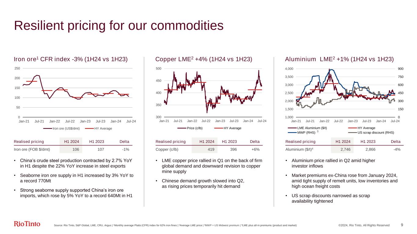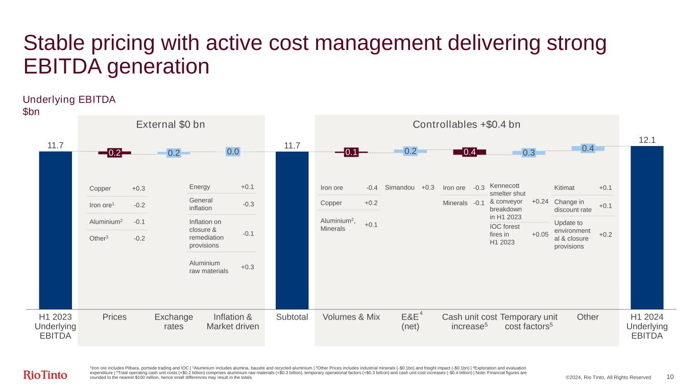 ©2024, Rio Tinto, All Rights Reserved 9 Resilient pricing for our commodities Realised pricing H1 2024 H1 2023 Delta Iron ore (FOB $/dmt) 106 107 -1% Source: Rio Tinto, S&P Global, LME, CRU, Argus | 1Monthly average Platts (CFR) index for 62% iron fines | 2Average LME price | 3MWP = US Midwest premium | 4LME plus all-in premiums (product and market) • China’s crude steel production contracted by 2.7% YoY in H1 despite the 22% YoY increase in steel exports • Seaborne iron ore supply in H1 increased by 3% YoY to a record 770Mt • Strong seaborne supply supported China’s iron ore imports, which rose by 5% YoY to a record 640Mt in H1 0 50 100 150 200 250 Jan-21 Jul-21 Jan-22 Jul-22 Jan-23 Jul-23 Jan-24 Jul-24 Iron ore (US$/dmt) HY Average 300 350 400 450 500 Jan-21 Jul-21 Jan-22 Jul-22 Jan-23 Jul-23 Jan-24 Jul-24 Price (c/lb) HY Average 0 150 300 450 600 750 900 1,000 1,500 2,000 2,500 3,000 3,500 4,000 Jan-21 Jul-21 Jan-22 Jul-22 Jan-23 Jul-23 Jan-24 Jul-24 LME Aluminium ($/t) HY Average MWP (RHS) US scrap discount (RHS) Iron ore1 CFR index -3% (1H24 vs 1H23) Copper LME2 +4% (1H24 vs 1H23) Aluminium LME2 +1% (1H24 vs 1H23) Realised pricing H1 2024 H1 2023 Delta Copper (c/lb) 419 396 +6% • LME copper price rallied in Q1 on the back of firm global demand and downward revision to copper mine supply • Chinese demand growth slowed into Q2, as rising prices temporarily hit demand Realised pricing H1 2024 H1 2023 Delta Aluminium ($/t)4 2,746 2,866 -4% • Aluminium price rallied in Q2 amid higher investor inflows • Market premiums ex-China rose from January 2024, amid tight supply of remelt units, low inventories and high ocean freight costs • US scrap discounts narrowed as scrap availability tightened 3