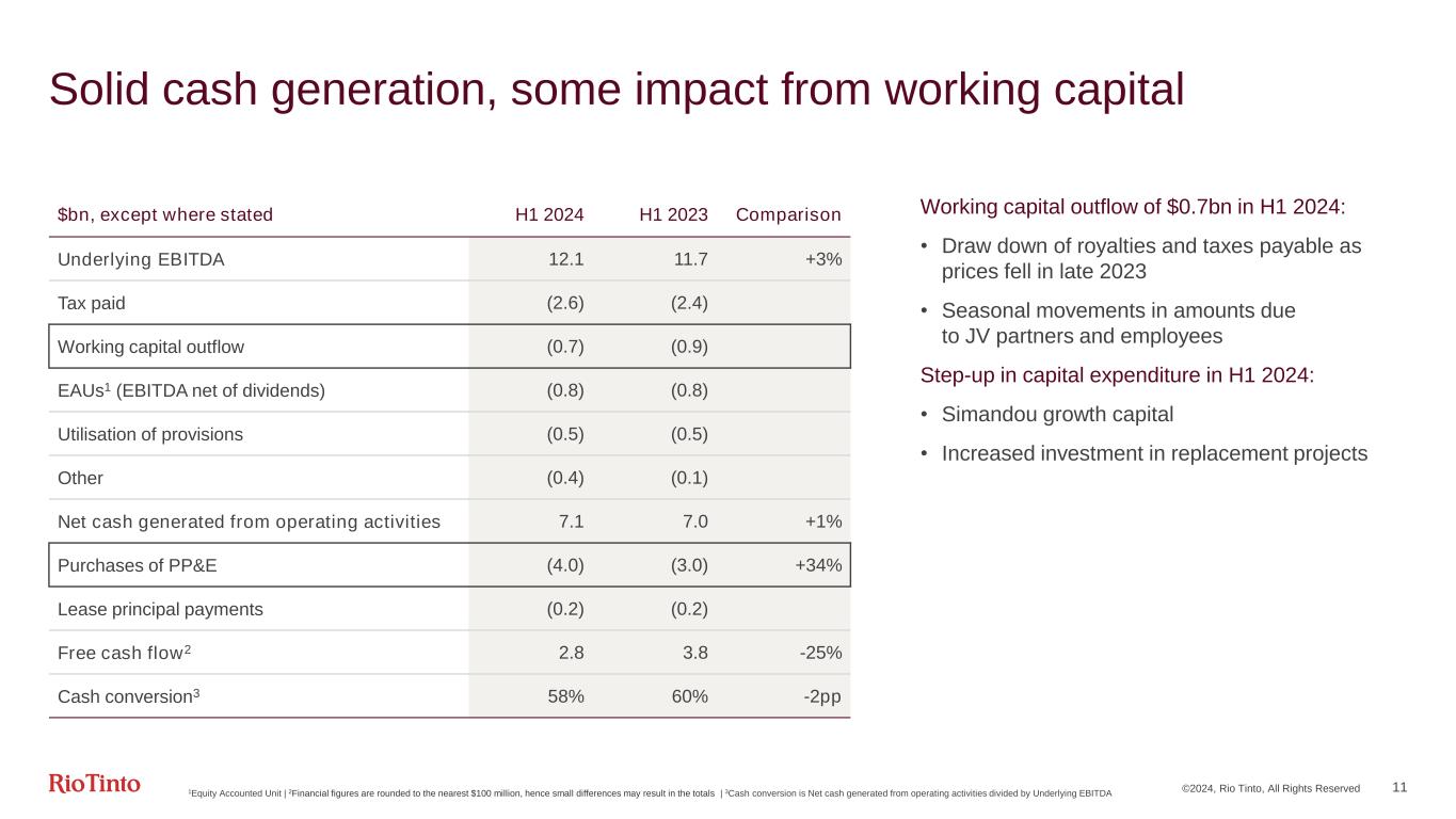 ©2024, Rio Tinto, All Rights Reserved 10 Stable pricing with active cost management delivering strong EBITDA generation Underlying EBITDA $bn 11.7 11.7 12.1 H1 2023 Underlying EBITDA 0.2 Prices 0.2 Exchange rates 0.0 Inflation & Market driven Subtotal 0.1 Volumes & Mix 0.2 E&E (net) 0.4 Cash unit cost increase5 0.3 Temporary unit cost factors5 0.4 Other H1 2024 Underlying EBITDA External $0 bn Controllables +$0.4 bn Copper +0.3 Iron ore1 -0.2 Aluminium2 -0.1 Other3 -0.2 Energy +0.1 General inflation -0.3 Inflation on closure & remediation provisions -0.1 Aluminium raw materials +0.3 Kennecott smelter shut & conveyor breakdown in H1 2023 +0.24 IOC forest fires in H1 2023 +0.05 Simandou +0.3 1Iron ore includes Pilbara, portside trading and IOC | 2Aluminium includes alumina, bauxite and recycled aluminium | 3Other Prices includes industrial minerals (-$0.1bn) and freight impact (-$0.1bn) | 4Exploration and evaluation expenditure | 5Total operating cash unit costs (+$0.2 billion) comprises aluminium raw materials (+$0.3 billion), temporary operational factors (+$0.3 billion) and cash unit cost increases (-$0.4 billion) | Note: Financial figures are rounded to the nearest $100 million, hence small differences may result in the totals Iron ore -0.4 Copper +0.2 Aluminium2, Minerals +0.1 Iron ore -0.3 Minerals -0.1 4 Kitimat +0.1 Change in discount rate +0.1 Update to environment al & closure provisions +0.2