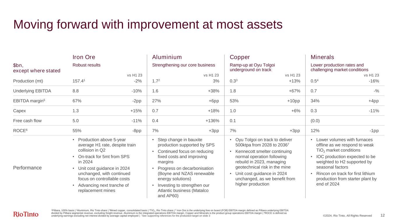 ©2024, Rio Tinto, All Rights Reserved 11 Solid cash generation, some impact from working capital $bn, except where stated H1 2024 H1 2023 Comparison Underlying EBITDA 12.1 11.7 +3% Tax paid (2.6) (2.4) Working capital outflow (0.7) (0.9) EAUs1 (EBITDA net of dividends) (0.8) (0.8) Utilisation of provisions (0.5) (0.5) Other (0.4) (0.1) Net cash generated from operating activities 7.1 7.0 +1% Purchases of PP&E (4.0) (3.0) +34% Lease principal payments (0.2) (0.2) Free cash flow2 2.8 3.8 -25% Cash conversion3 58% 60% -2pp 1Equity Accounted Unit | 2Financial figures are rounded to the nearest $100 million, hence small differences may result in the totals | 3Cash conversion is Net cash generated from operating activities divided by Underlying EBITDA Working capital outflow of $0.7bn in H1 2024: • Draw down of royalties and taxes payable as prices fell in late 2023 • Seasonal movements in amounts due to JV partners and employees Step-up in capital expenditure in H1 2024: • Simandou growth capital • Increased investment in replacement projects
