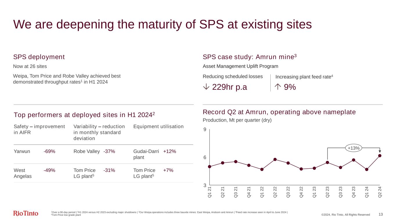 ©2024, Rio Tinto, All Rights Reserved 12 Moving forward with improvement at most assets Iron Ore Aluminium Copper Minerals $bn, except where stated Robust results Strengthening our core business Ramp-up at Oyu Tolgoi underground on track Lower production rates and challenging market conditions Production (mt) 157.41 -2% 1.72 3% 0.33 +13% 0.54 -16% Underlying EBITDA 8.8 -10% 1.6 +38% 1.8 +67% 0.7 -% EBITDA margin5 67% -2pp 27% +6pp 53% +10pp 34% +4pp Capex 1.3 +15% 0.7 +18% 1.0 +6% 0.3 -11% Free cash flow 5.0 -11% 0.4 +136% 0.1 (0.0) ROCE6 55% -8pp 7% +3pp 7% +3pp 12% -1pp Performance • Production above 5-year average H1 rate, despite train collision in Q2 • On-track for 5mt from SPS in 2024 • Unit cost guidance in 2024 unchanged, with continued focus on controllable costs • Advancing next tranche of replacement mines • Step change in bauxite production supported by SPS • Continued focus on reducing fixed costs and improving margins • Progress on decarbonisation (Boyne and NZAS renewable energy solutions) • Investing to strengthen our Atlantic business (Matalco and AP60) • Oyu Tolgoi on track to deliver 500ktpa from 2028 to 20367 • Kennecott smelter continuing normal operation following rebuild in 2023, managing geotechnical risk in the mine • Unit cost guidance in 2024 unchanged, as we benefit from higher production • Lower volumes with furnaces offline as we respond to weak TiO2 market conditions • IOC production expected to be weighted to H2 supported by seasonal factors • Rincon on track for first lithium production from starter plant by end of 2024 vs H1 23 vs H1 23 1Pilbara, 100% basis | 2Aluminium, Rio Tinto share | 3Mined copper, consolidated basis | 4TiO2, Rio Tinto share | 5 Iron Ore is the underlying free on board (FOB) EBITDA margin defined as Pilbara underlying EBITDA divided by Pilbara segmental revenue, excluding freight revenue. Aluminium is the integrated operations EBITDA margin. Copper and Minerals is the product group operations EBITDA margin | 6ROCE is defined as underlying earnings excluding net interest divided by average capital employed | 7See supporting references for the production target on slide 3 vs H1 23 vs H1 23