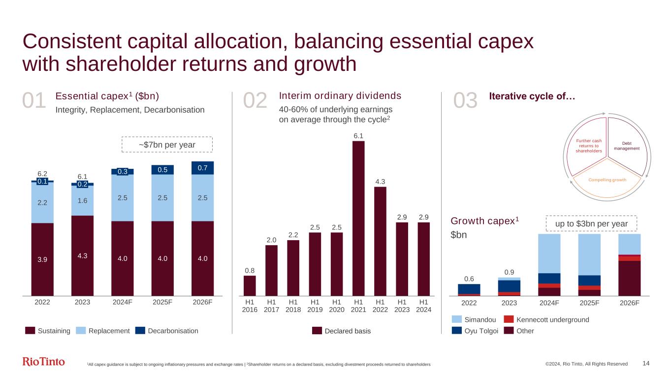©2024, Rio Tinto, All Rights Reserved 14 Consistent capital allocation, balancing essential capex with shareholder returns and growth Essential capex1 ($bn) Integrity, Replacement, Decarbonisation 01 Interim ordinary dividends 40-60% of underlying earnings on average through the cycle2 02 Iterative cycle of…03 Declared basis 3.9 4.3 4.0 4.0 4.0 2.2 1.6 2.5 2.5 2.5 0.5 0.7 0.1 2022 0.2 2023 0.3 2024F 2025F 2026F 6.2 6.1 Sustaining Replacement Decarbonisation 1All capex guidance is subject to ongoing inflationary pressures and exchange rates | 2Shareholder returns on a declared basis, excluding divestment proceeds returned to shareholders 2022 2023 2024F 2025F 2026F 0.6 0.9 Simandou Oyu Tolgoi Kennecott underground Other Growth capex1 $bn up to $3bn per year 0.8 2.0 2.2 2.5 2.5 6.1 4.3 2.9 2.9 H1 2016 H1 2017 H1 2018 H1 2019 H1 2020 H1 2021 H1 2022 H1 2023 H1 2024 ~$7bn per year Further cash returns to shareholders Debt management Compelling growth