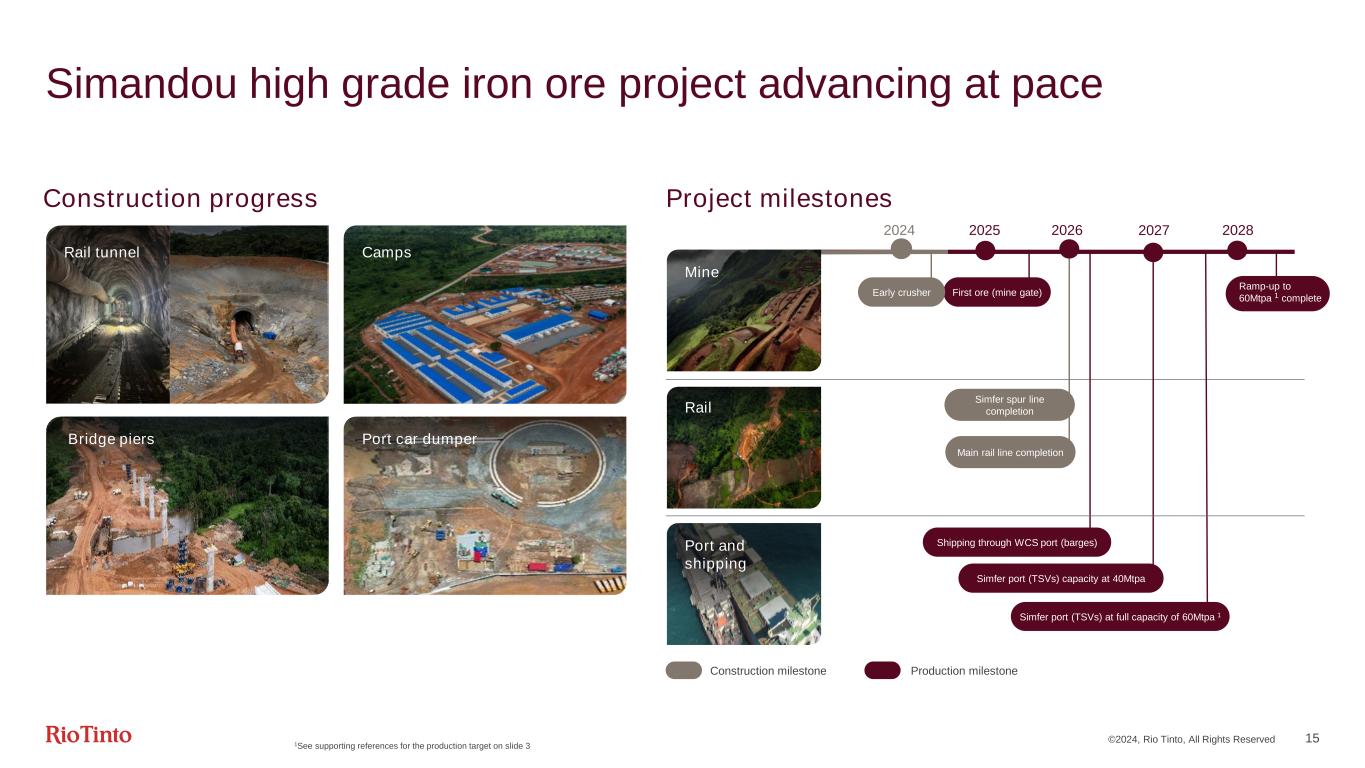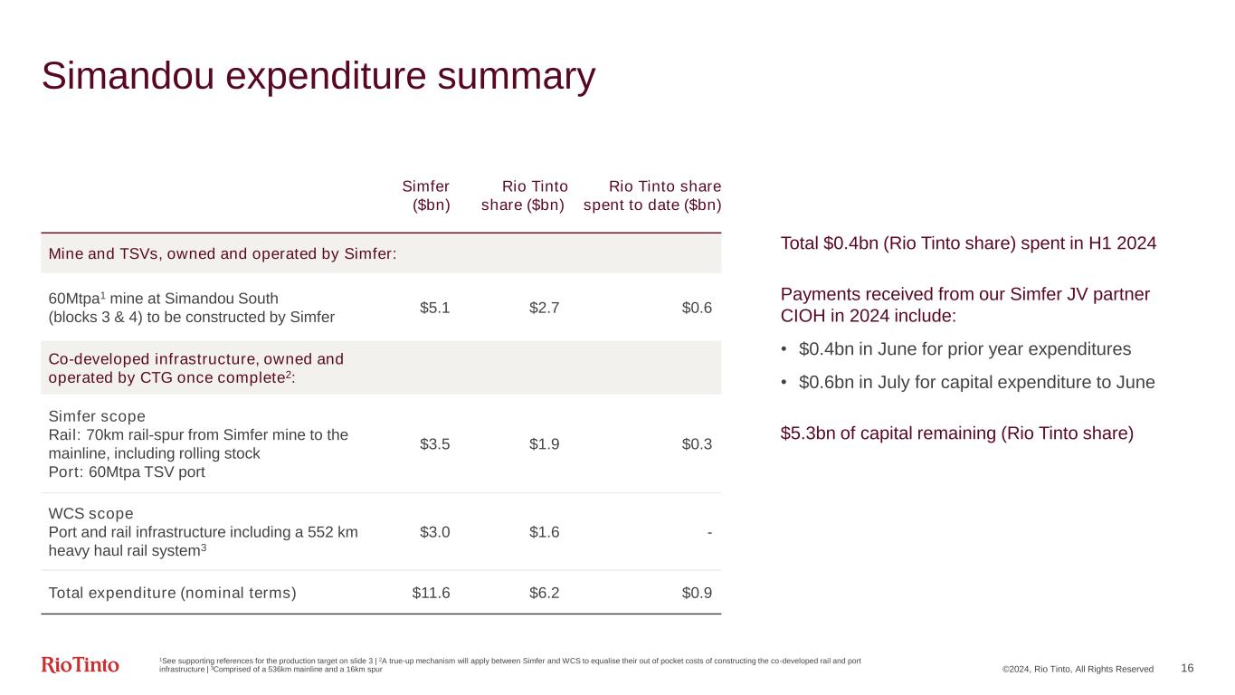 ©2024, Rio Tinto, All Rights Reserved 15 Simandou high grade iron ore project advancing at pace Project milestones 20252024 20282026 Simfer spur line completion 2027 Main rail line completion Ramp-up to 60Mtpa 1 complete Construction progress Construction milestone Production milestone Camps Mine Rail Port and shipping First ore (mine gate)Early crusher Simfer port (TSVs) capacity at 40Mtpa Simfer port (TSVs) at full capacity of 60Mtpa 1 Shipping through WCS port (barges) Rail tunnel Bridge piers Port car dumper 1See supporting references for the production target on slide 3