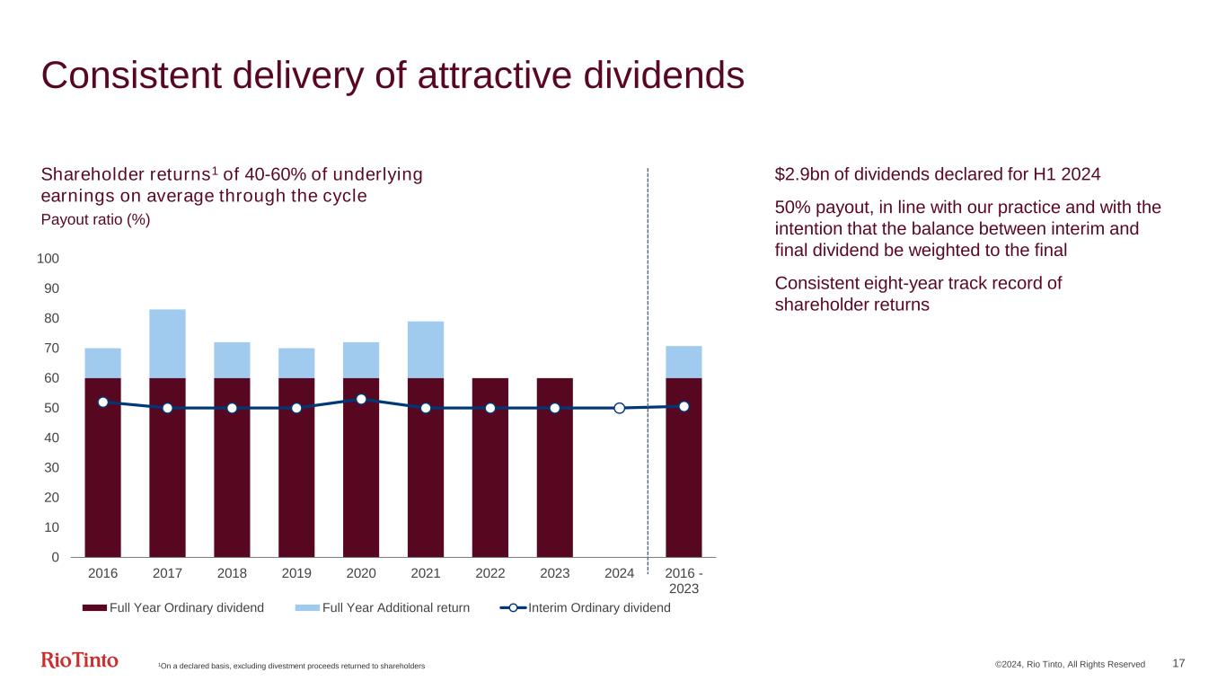 ©2024, Rio Tinto, All Rights Reserved 16 Simandou expenditure summary Simfer ($bn) Rio Tinto share ($bn) Rio Tinto share spent to date ($bn) Mine and TSVs, owned and operated by Simfer: 60Mtpa1 mine at Simandou South (blocks 3 & 4) to be constructed by Simfer $5.1 $2.7 $0.6 Co-developed infrastructure, owned and operated by CTG once complete2: Simfer scope Rail: 70km rail-spur from Simfer mine to the mainline, including rolling stock Port: 60Mtpa TSV port $3.5 $1.9 $0.3 WCS scope Port and rail infrastructure including a 552 km heavy haul rail system3 $3.0 $1.6 - Total expenditure (nominal terms) $11.6 $6.2 $0.9 1See supporting references for the production target on slide 3 | 2A true-up mechanism will apply between Simfer and WCS to equalise their out of pocket costs of constructing the co-developed rail and port infrastructure | 3Comprised of a 536km mainline and a 16km spur Total $0.4bn (Rio Tinto share) spent in H1 2024 Payments received from our Simfer JV partner CIOH in 2024 include: • $0.4bn in June for prior year expenditures • $0.6bn in July for capital expenditure to June $5.3bn of capital remaining (Rio Tinto share)