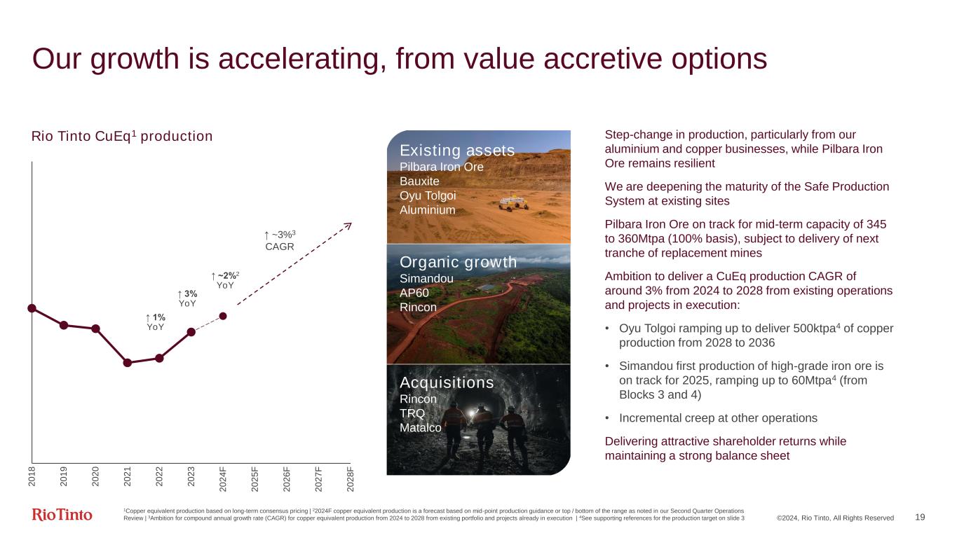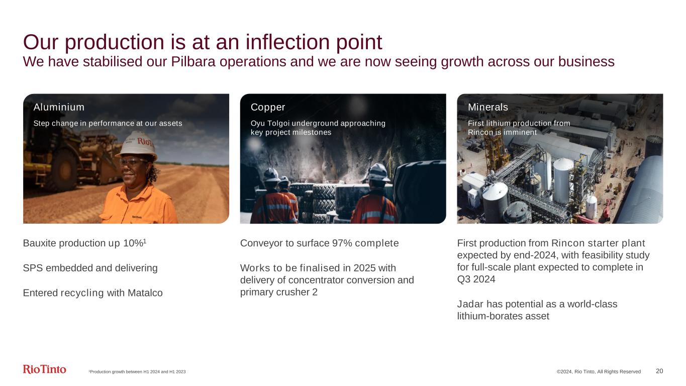 ©2024, Rio Tinto, All Rights Reserved 19 Our growth is accelerating, from value accretive options Rio Tinto CuEq1 production 1Copper equivalent production based on long-term consensus pricing | 22024F copper equivalent production is a forecast based on mid-point production guidance or top / bottom of the range as noted in our Second Quarter Operations Review | 3Ambition for compound annual growth rate (CAGR) for copper equivalent production from 2024 to 2028 from existing portfolio and projects already in execution | 4See supporting references for the production target on slide 3 2 0 1 8 2 0 1 9 2 0 2 0 2 0 2 1 2 0 2 2 2 0 2 3 2 0 2 4 F 2 0 2 5 F 2 0 2 6 F 2 0 2 7 F 2 0 2 8 F ↑ ~2%2 YoY ↑ 1% YoY ↑ 3% YoY ↑ ~3%3 CAGR Organic growth Simandou AP60 Rincon Existing assets Pilbara Iron Ore Bauxite Oyu Tolgoi Aluminium Acquisitions Rincon TRQ Matalco Step-change in production, particularly from our aluminium and copper businesses, while Pilbara Iron Ore remains resilient We are deepening the maturity of the Safe Production System at existing sites Pilbara Iron Ore on track for mid-term capacity of 345 to 360Mtpa (100% basis), subject to delivery of next tranche of replacement mines Ambition to deliver a CuEq production CAGR of around 3% from 2024 to 2028 from existing operations and projects in execution: • Oyu Tolgoi ramping up to deliver 500ktpa4 of copper production from 2028 to 2036 • Simandou first production of high-grade iron ore is on track for 2025, ramping up to 60Mtpa4 (from Blocks 3 and 4) • Incremental creep at other operations Delivering attractive shareholder returns while maintaining a strong balance sheet