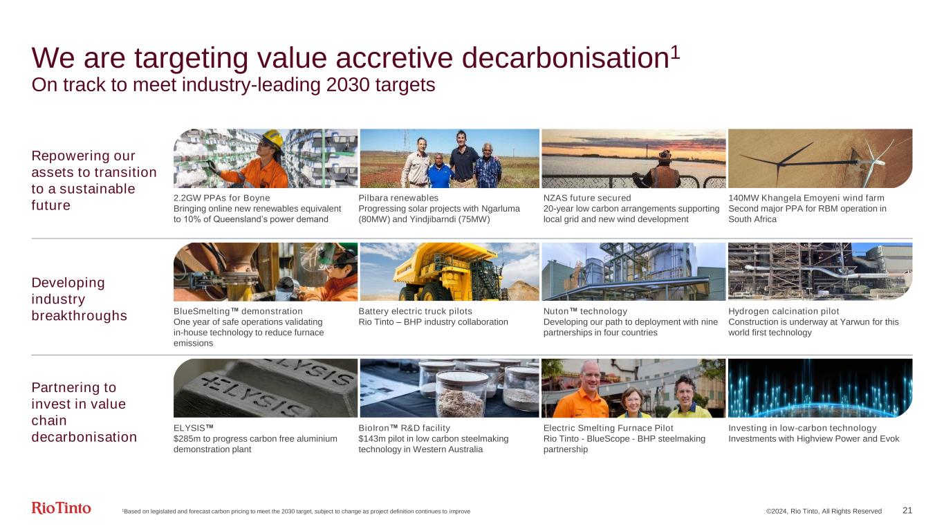 ©2024, Rio Tinto, All Rights Reserved 20 Our production is at an inflection point We have stabilised our Pilbara operations and we are now seeing growth across our business 1Production growth between H1 2024 and H1 2023 Aluminium Step change in performance at our assets Copper Oyu Tolgoi underground approaching key project milestones Minerals First lithium production from Rincon is imminent Bauxite production up 10%1 SPS embedded and delivering Entered recycling with Matalco Conveyor to surface 97% complete Works to be finalised in 2025 with delivery of concentrator conversion and primary crusher 2 First production from Rincon starter plant expected by end-2024, with feasibility study for full-scale plant expected to complete in Q3 2024 Jadar has potential as a world-class lithium-borates asset