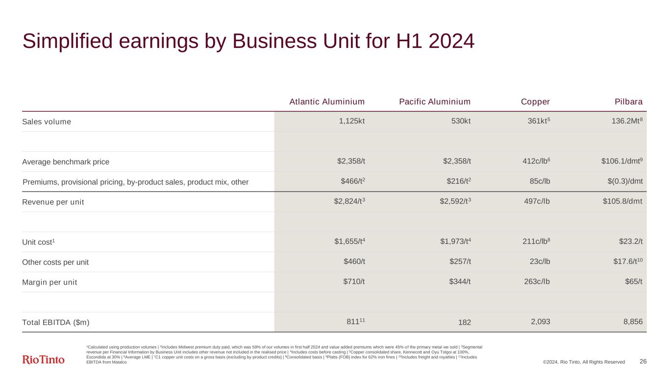 ©2024, Rio Tinto, All Rights Reserved 26 Simplified earnings by Business Unit for H1 2024 Atlantic Aluminium Pacific Aluminium Copper Pilbara Sales volume 1,125kt 530kt 361kt5 136.2Mt8 Average benchmark price $2,358/t $2,358/t 412c/lb6 $106.1/dmt9 Premiums, provisional pricing, by-product sales, product mix, other $466/t2 $216/t2 85c/lb $(0.3)/dmt Revenue per unit $2,824/t3 $2,592/t3 497c/lb $105.8/dmt Unit cost1 $1,655/t4 $1,973/t4 211c/lb8 $23.2/t Other costs per unit $460/t $257/t 23c/lb $17.6/t10 Margin per unit $710/t $344/t 263c/lb $65/t Total EBITDA ($m) 81111 182 2,093 8,856 1Calculated using production volumes | 2Includes Midwest premium duty paid, which was 59% of our volumes in first half 2024 and value added premiums which were 45% of the primary metal we sold | 3Segmental revenue per Financial Information by Business Unit includes other revenue not included in the realised price | 4Includes costs before casting | 5Copper consolidated share, Kennecott and Oyu Tolgoi at 100%, Escondida at 30% | 6Average LME | 7C1 copper unit costs on a gross basis (excluding by-product credits) | 8Consolidated basis | 9Platts (FOB) index for 62% iron fines | 10Includes freight and royalties | 11Includes EBITDA from Matalco