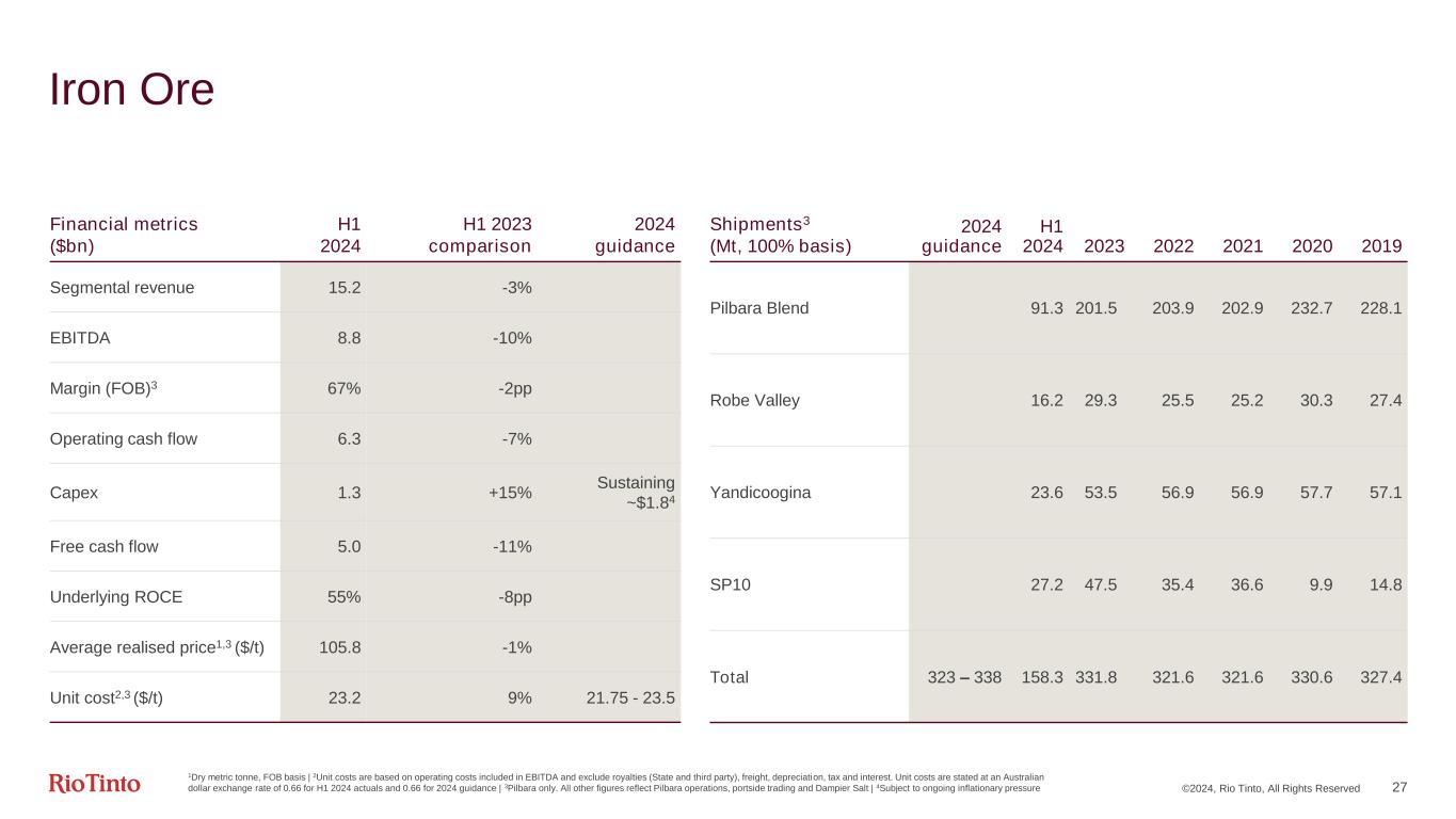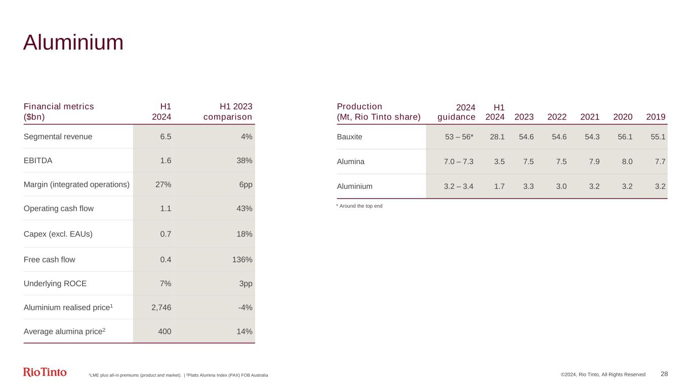 ©2024, Rio Tinto, All Rights Reserved 27 Iron Ore Financial metrics ($bn) H1 2024 H1 2023 comparison 2024 guidance Segmental revenue 15.2 -3% EBITDA 8.8 -10% Margin (FOB)3 67% -2pp Operating cash flow 6.3 -7% Capex 1.3 +15% Sustaining ~$1.84 Free cash flow 5.0 -11% Underlying ROCE 55% -8pp Average realised price1,3 ($/t) 105.8 -1% Unit cost2,3 ($/t) 23.2 9% 21.75 - 23.5 Shipments3 (Mt, 100% basis) 2024 guidance H1 2024 2023 2022 2021 2020 2019 Pilbara Blend 91.3 201.5 203.9 202.9 232.7 228.1 Robe Valley 16.2 29.3 25.5 25.2 30.3 27.4 Yandicoogina 23.6 53.5 56.9 56.9 57.7 57.1 SP10 27.2 47.5 35.4 36.6 9.9 14.8 Total 323 – 338 158.3 331.8 321.6 321.6 330.6 327.4 1Dry metric tonne, FOB basis | 2Unit costs are based on operating costs included in EBITDA and exclude royalties (State and third party), freight, depreciation, tax and interest. Unit costs are stated at an Australian dollar exchange rate of 0.66 for H1 2024 actuals and 0.66 for 2024 guidance | 3Pilbara only. All other figures reflect Pilbara operations, portside trading and Dampier Salt | 4Subject to ongoing inflationary pressure