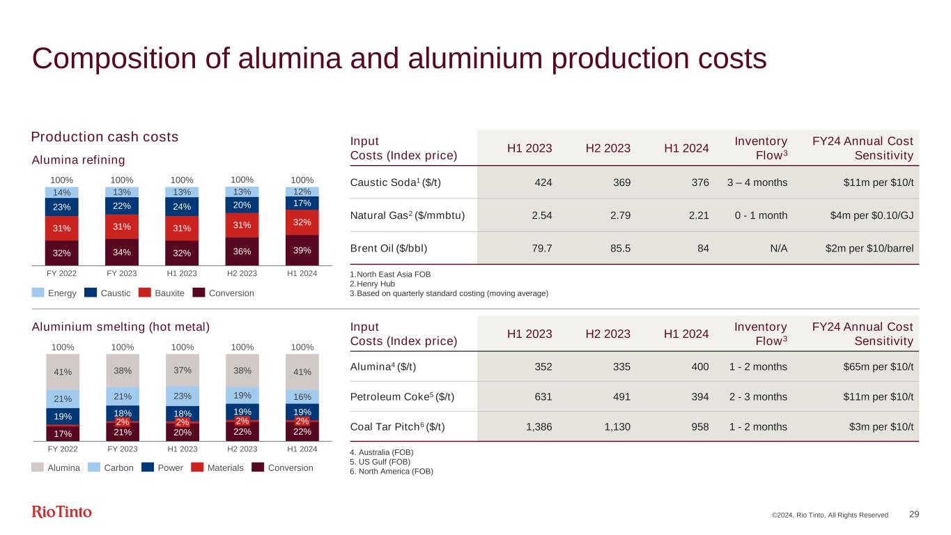 ©2024, Rio Tinto, All Rights Reserved 29 Composition of alumina and aluminium production costs Alumina refining Production cash costs Aluminium smelting (hot metal) Input Costs (Index price) H1 2023 H2 2023 H1 2024 Inventory Flow3 FY24 Annual Cost Sensitivity Caustic Soda1 ($/t) 424 369 376 3 – 4 months $11m per $10/t Natural Gas2 ($/mmbtu) 2.54 2.79 2.21 0 - 1 month $4m per $0.10/GJ Brent Oil ($/bbl) 79.7 85.5 84 N/A $2m per $10/barrel Input Costs (Index price) H1 2023 H2 2023 H1 2024 Inventory Flow3 FY24 Annual Cost Sensitivity Alumina4 ($/t) 352 335 400 1 - 2 months $65m per $10/t Petroleum Coke5 ($/t) 631 491 394 2 - 3 months $11m per $10/t Coal Tar Pitch6 ($/t) 1,386 1,130 958 1 - 2 months $3m per $10/t 4. Australia (FOB) 5. US Gulf (FOB) 6. North America (FOB) 1.North East Asia FOB 2.Henry Hub 3.Based on quarterly standard costing (moving average) 32% 34% 32% 36% 39% 31% 31% 31% 31% 32% 23% 22% 24% 20% 17% 14% 13% 13% 13% 12% FY 2022 FY 2023 H1 2023 H2 2023 H1 2024 100% 100% 100% 100% 100% Energy Caustic Bauxite Conversion 17% 21% 20% 22% 22% 2% 19% 18% 18% 19% 19% 21% 21% 23% 19% 16% 41% 38% 37% 38% 41% FY 2022 2% FY 2023 2% H1 2023 2% H2 2023 2% H1 2024 100% 100% 100% 100% 100% Alumina Carbon Power Materials Conversion
