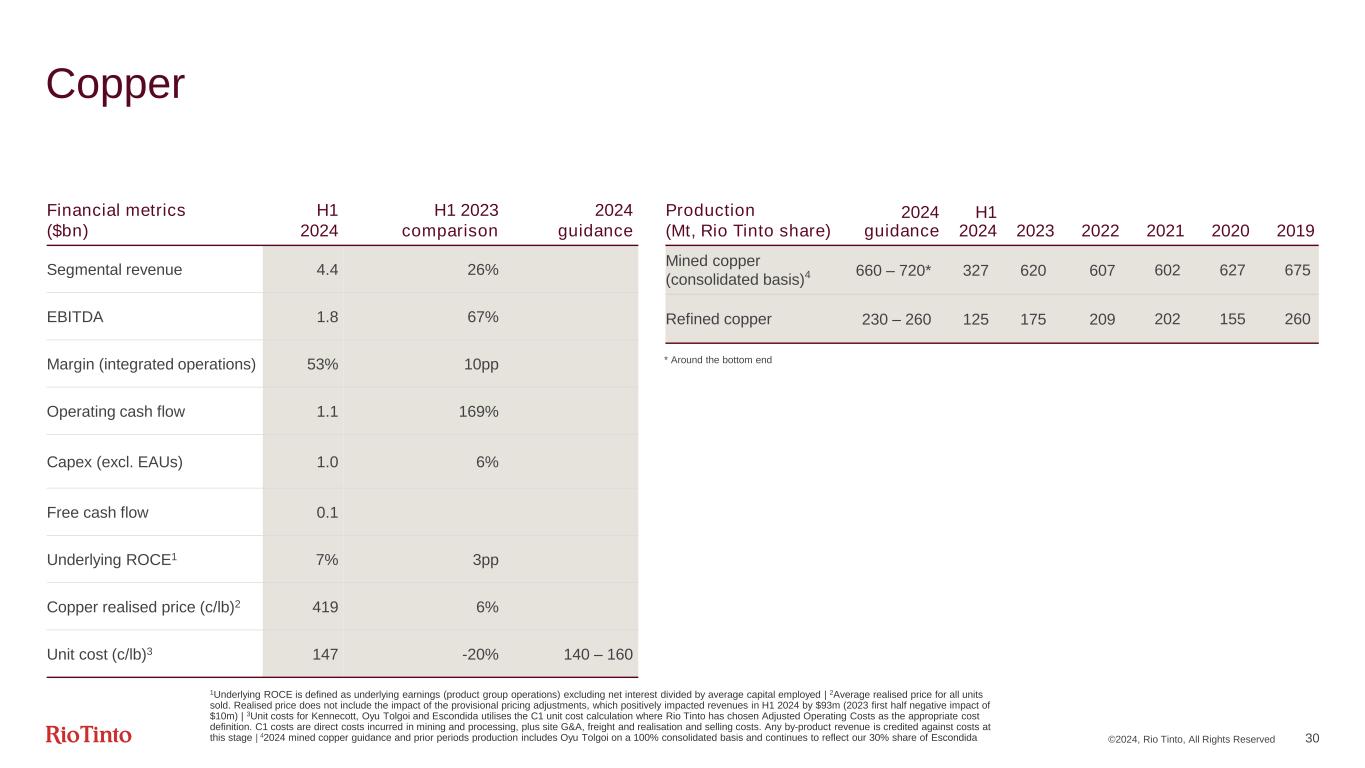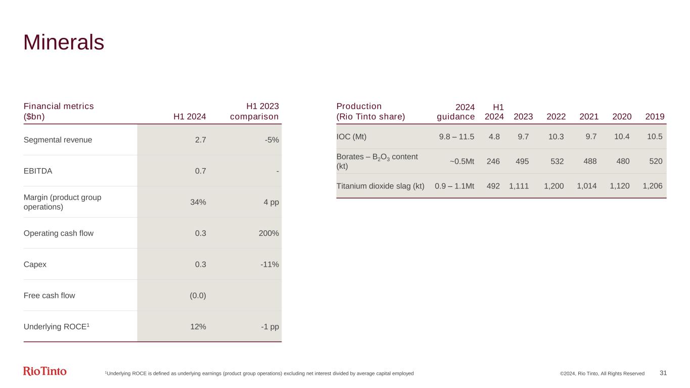 ©2024, Rio Tinto, All Rights Reserved 30 Copper 1Underlying ROCE is defined as underlying earnings (product group operations) excluding net interest divided by average capital employed | 2Average realised price for all units sold. Realised price does not include the impact of the provisional pricing adjustments, which positively impacted revenues in H1 2024 by $93m (2023 first half negative impact of $10m) | 3Unit costs for Kennecott, Oyu Tolgoi and Escondida utilises the C1 unit cost calculation where Rio Tinto has chosen Adjusted Operating Costs as the appropriate cost definition. C1 costs are direct costs incurred in mining and processing, plus site G&A, freight and realisation and selling costs. Any by-product revenue is credited against costs at this stage | 42024 mined copper guidance and prior periods production includes Oyu Tolgoi on a 100% consolidated basis and continues to reflect our 30% share of Escondida Production (Mt, Rio Tinto share) 2024 guidance H1 2024 2023 2022 2021 2020 2019 Mined copper (consolidated basis)4 660 – 720* 327 620 607 602 627 675 Refined copper 230 – 260 125 175 209 202 155 260 Financial metrics ($bn) H1 2024 H1 2023 comparison 2024 guidance Segmental revenue 4.4 26% EBITDA 1.8 67% Margin (integrated operations) 53% 10pp Operating cash flow 1.1 169% Capex (excl. EAUs) 1.0 6% Free cash flow 0.1 Underlying ROCE1 7% 3pp Copper realised price (c/lb)2 419 6% Unit cost (c/lb)3 147 -20% 140 – 160 * Around the bottom end