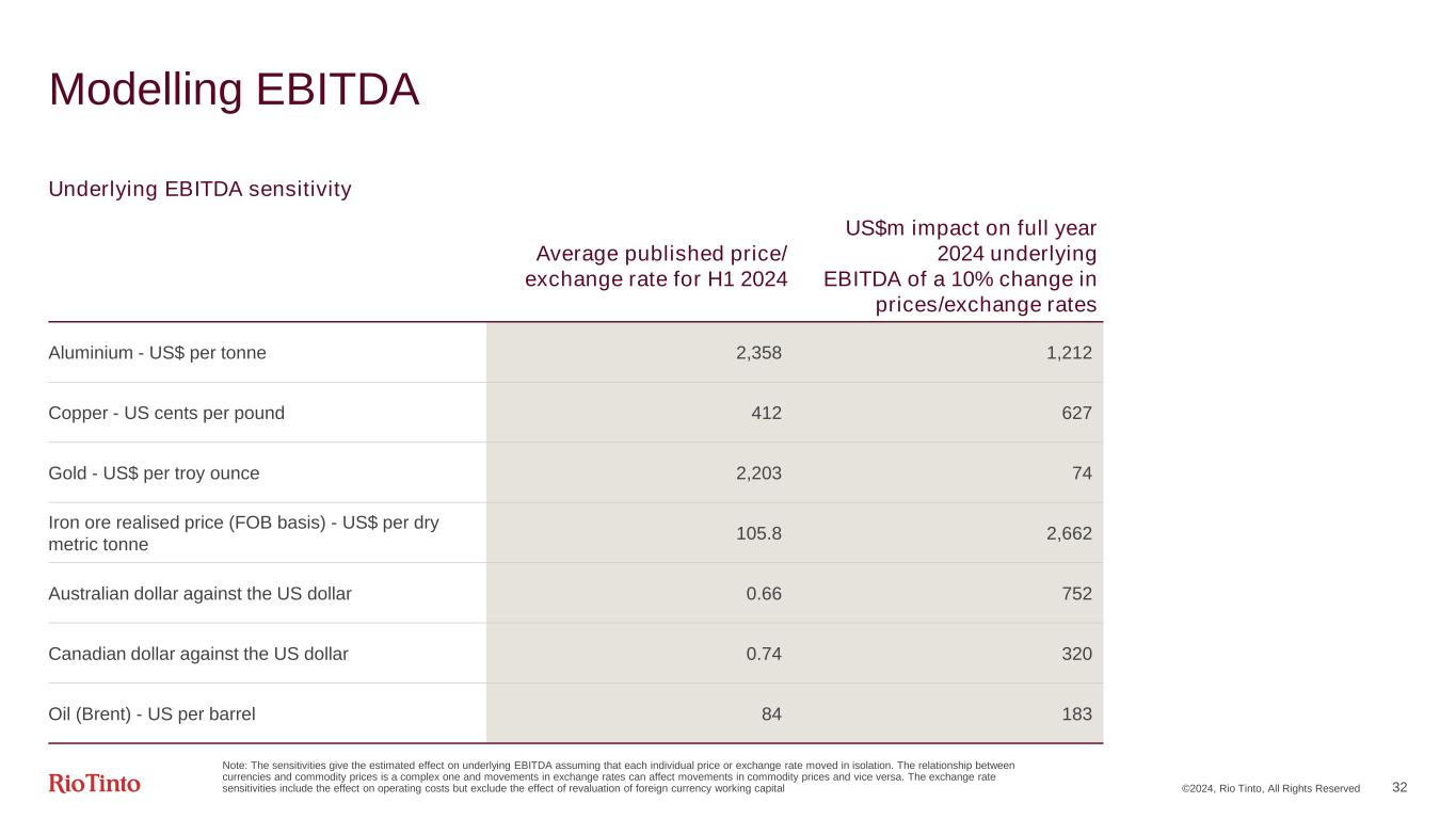 ©2024, Rio Tinto, All Rights Reserved 32 Modelling EBITDA Average published price/ exchange rate for H1 2024 US$m impact on full year 2024 underlying EBITDA of a 10% change in prices/exchange rates Aluminium - US$ per tonne 2,358 1,212 Copper - US cents per pound 412 627 Gold - US$ per troy ounce 2,203 74 Iron ore realised price (FOB basis) - US$ per dry metric tonne 105.8 2,662 Australian dollar against the US dollar 0.66 752 Canadian dollar against the US dollar 0.74 320 Oil (Brent) - US per barrel 84 183 Note: The sensitivities give the estimated effect on underlying EBITDA assuming that each individual price or exchange rate moved in isolation. The relationship between currencies and commodity prices is a complex one and movements in exchange rates can affect movements in commodity prices and vice versa. The exchange rate sensitivities include the effect on operating costs but exclude the effect of revaluation of foreign currency working capital Underlying EBITDA sensitivity