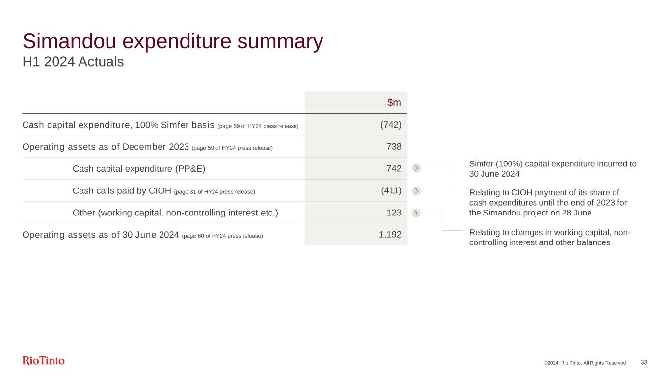 ©2024, Rio Tinto, All Rights Reserved 33 Simandou expenditure summary H1 2024 Actuals $m Cash capital expenditure, 100% Simfer basis (page 59 of HY24 press release) (742) Operating assets as of December 2023 (page 59 of HY24 press release) 738 Cash capital expenditure (PP&E) 742 Cash calls paid by CIOH (page 31 of HY24 press release) (411) Other (working capital, non-controlling interest etc.) 123 Operating assets as of 30 June 2024 (page 60 of HY24 press release) 1,192 Simfer (100%) capital expenditure incurred to 30 June 2024 Relating to changes in working capital, non- controlling interest and other balances Relating to CIOH payment of its share of cash expenditures until the end of 2023 for the Simandou project on 28 June