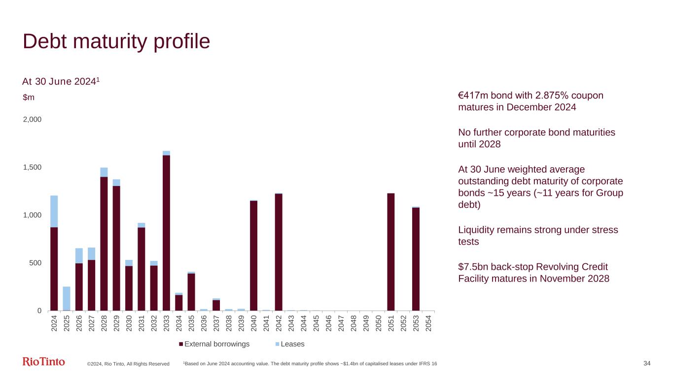 €417m bond with 2.875% coupon matures in December 2024 No further corporate bond maturities until 2028 At 30 June weighted average outstanding debt maturity of corporate bonds ~15 years (~11 years for Group debt) Liquidity remains strong under stress tests $7.5bn back-stop Revolving Credit Facility matures in November 2028 ©2024, Rio Tinto, All Rights Reserved 34 Debt maturity profile $m 1Based on June 2024 accounting value. The debt maturity profile shows ~$1.4bn of capitalised leases under IFRS 16 At 30 June 20241 0 500 1,000 1,500 2,000 2 0 2 4 2 0 2 5 2 0 2 6 2 0 2 7 2 0 2 8 2 0 2 9 2 0 3 0 2 0 3 1 2 0 3 2 2 0 3 3 2 0 3 4 2 0 3 5 2 0 3 6 2 0 3 7 2 0 3 8 2 0 3 9 2 0 4 0 2 0 4 1 2 0 4 2 2 0 4 3 2 0 4 4 2 0 4 5 2 0 4 6 2 0 4 7 2 0 4 8 2 0 4 9 2 0 5 0 2 0 5 1 2 0 5 2 2 0 5 3 2 0 5 4 External borrowings Leases
