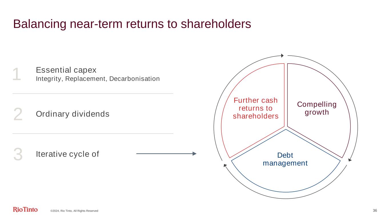 ©2024, Rio Tinto, All Rights Reserved 36 Balancing near-term returns to shareholders Further cash returns to shareholders Compelling growth Debt management Essential capex Integrity, Replacement, Decarbonisation1 Ordinary dividends2 Iterative cycle of3