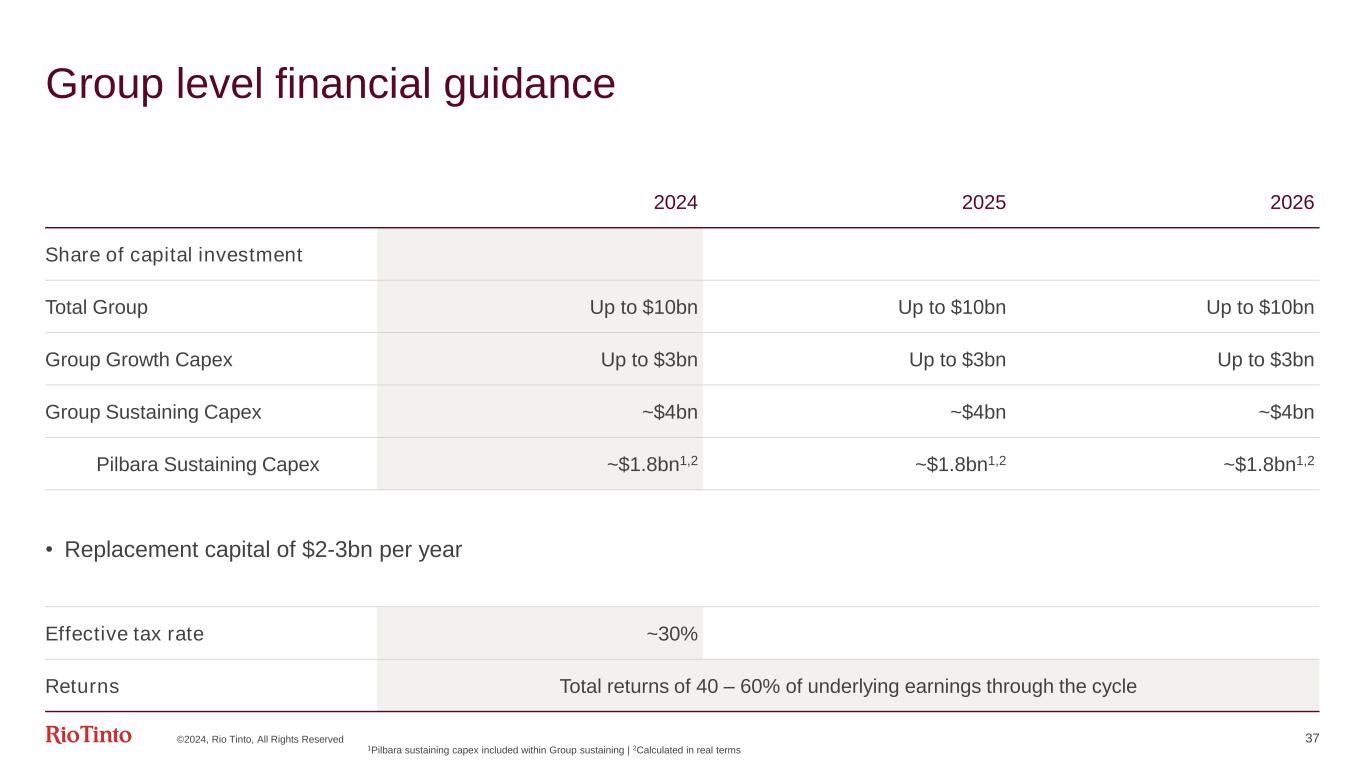 ©2024, Rio Tinto, All Rights Reserved 37 Group level financial guidance 2024 2025 2026 Share of capital investment Total Group Up to $10bn Up to $10bn Up to $10bn Group Growth Capex Up to $3bn Up to $3bn Up to $3bn Group Sustaining Capex ~$4bn ~$4bn ~$4bn Pilbara Sustaining Capex ~$1.8bn1,2 ~$1.8bn1,2 ~$1.8bn1,2 • Replacement capital of $2-3bn per year Effective tax rate ~30% Returns Total returns of 40 – 60% of underlying earnings through the cycle 1Pilbara sustaining capex included within Group sustaining | 2Calculated in real terms