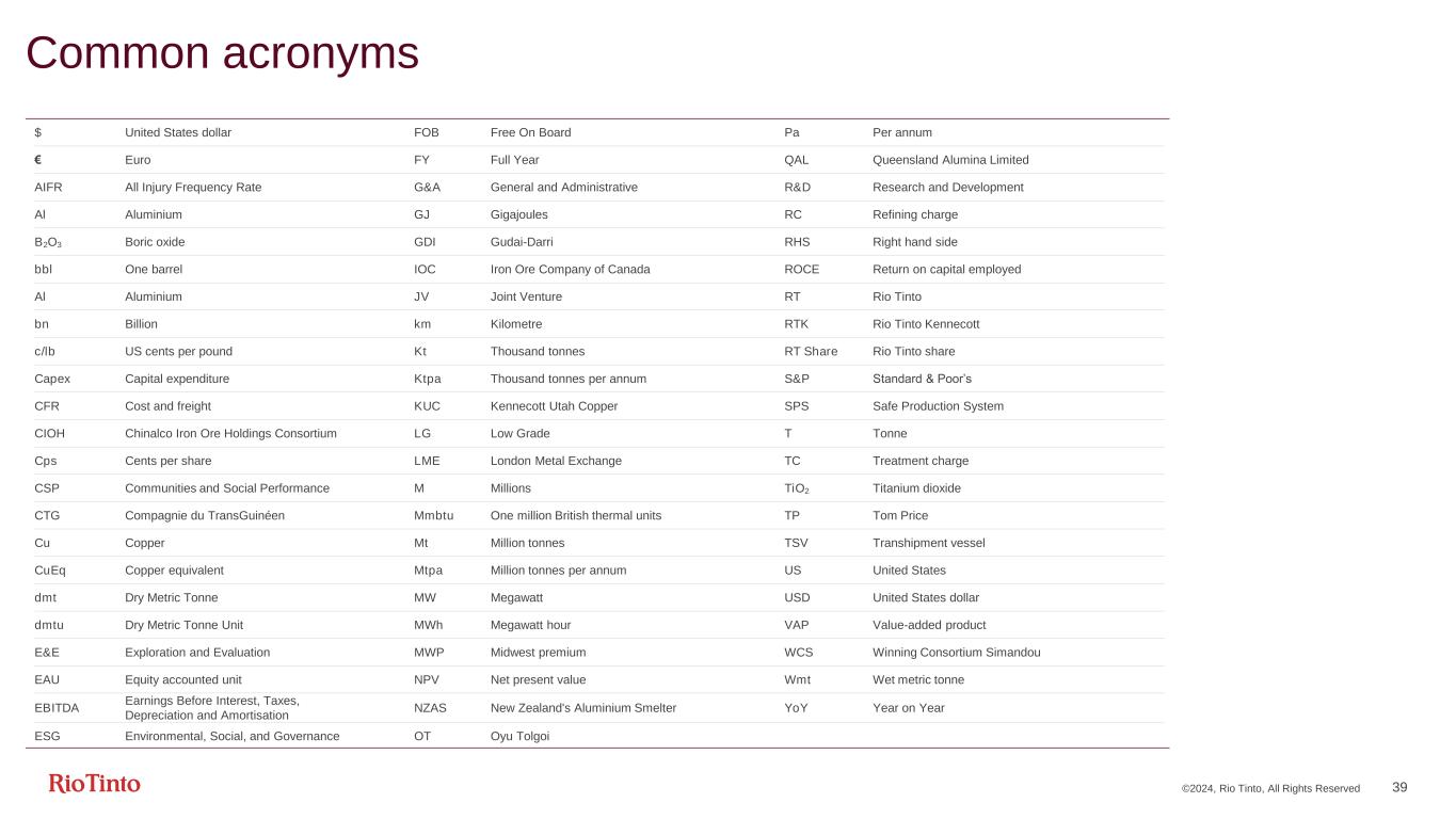 ©2024, Rio Tinto, All Rights Reserved 39 Common acronyms $ United States dollar FOB Free On Board Pa Per annum € Euro FY Full Year QAL Queensland Alumina Limited AIFR All Injury Frequency Rate G&A General and Administrative R&D Research and Development Al Aluminium GJ Gigajoules RC Refining charge B2O3 Boric oxide GDI Gudai-Darri RHS Right hand side bbl One barrel IOC Iron Ore Company of Canada ROCE Return on capital employed Al Aluminium JV Joint Venture RT Rio Tinto bn Billion km Kilometre RTK Rio Tinto Kennecott c/lb US cents per pound Kt Thousand tonnes RT Share Rio Tinto share Capex Capital expenditure Ktpa Thousand tonnes per annum S&P Standard & Poor’s CFR Cost and freight KUC Kennecott Utah Copper SPS Safe Production System CIOH Chinalco Iron Ore Holdings Consortium LG Low Grade T Tonne Cps Cents per share LME London Metal Exchange TC Treatment charge CSP Communities and Social Performance M Millions TiO2 Titanium dioxide CTG Compagnie du TransGuinéen Mmbtu One million British thermal units TP Tom Price Cu Copper Mt Million tonnes TSV Transhipment vessel CuEq Copper equivalent Mtpa Million tonnes per annum US United States dmt Dry Metric Tonne MW Megawatt USD United States dollar dmtu Dry Metric Tonne Unit MWh Megawatt hour VAP Value-added product E&E Exploration and Evaluation MWP Midwest premium WCS Winning Consortium Simandou EAU Equity accounted unit NPV Net present value Wmt Wet metric tonne EBITDA Earnings Before Interest, Taxes, Depreciation and Amortisation NZAS New Zealand's Aluminium Smelter YoY Year on Year ESG Environmental, Social, and Governance OT Oyu Tolgoi