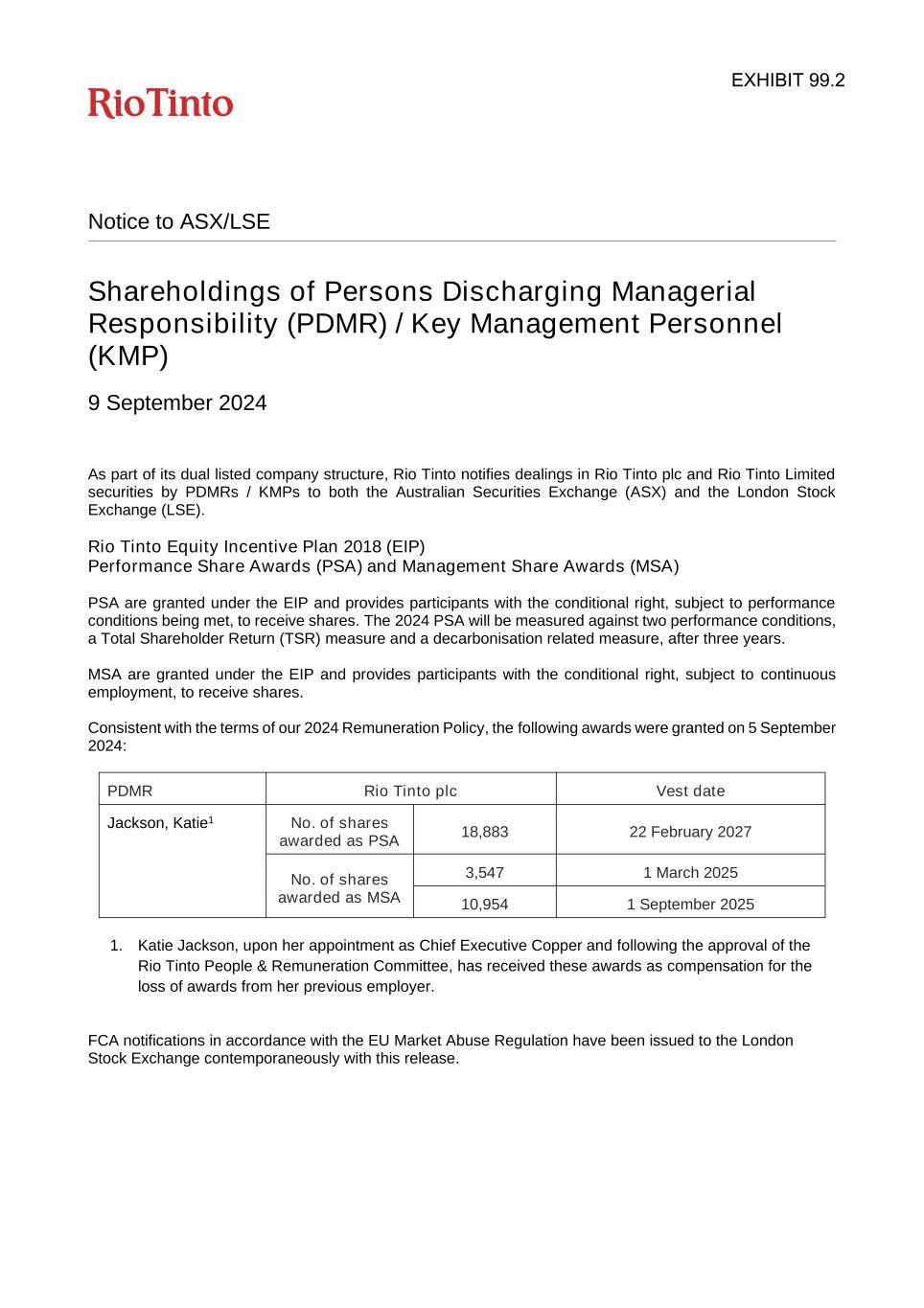 Notice to ASX/LSE Shareholdings of Persons Discharging Managerial Responsibility (PDMR) / Key Management Personnel (KMP) 9 September 2024 As part of its dual listed company structure, Rio Tinto notifies dealings in Rio Tinto plc and Rio Tinto Limited securities by PDMRs / KMPs to both the Australian Securities Exchange (ASX) and the London Stock Exchange (LSE). Rio Tinto Equity Incentive Plan 2018 (EIP) Performance Share Awards (PSA) and Management Share Awards (MSA) PSA are granted under the EIP and provides participants with the conditional right, subject to performance conditions being met, to receive shares. The 2024 PSA will be measured against two performance conditions, a Total Shareholder Return (TSR) measure and a decarbonisation related measure, after three years. MSA are granted under the EIP and provides participants with the conditional right, subject to continuous employment, to receive shares. Consistent with the terms of our 2024 Remuneration Policy, the following awards were granted on 5 September 2024: PDMR Rio Tinto plc Vest date Jackson, Katie1 No. of shares awarded as PSA 18,883 22 February 2027 No. of shares awarded as MSA 3,547 1 March 2025 10,954 1 September 2025 1. Katie Jackson, upon her appointment as Chief Executive Copper and following the approval of the Rio Tinto People & Remuneration Committee, has received these awards as compensation for the loss of awards from her previous employer. FCA notifications in accordance with the EU Market Abuse Regulation have been issued to the London Stock Exchange contemporaneously with this release. EXHIBIT 99.2