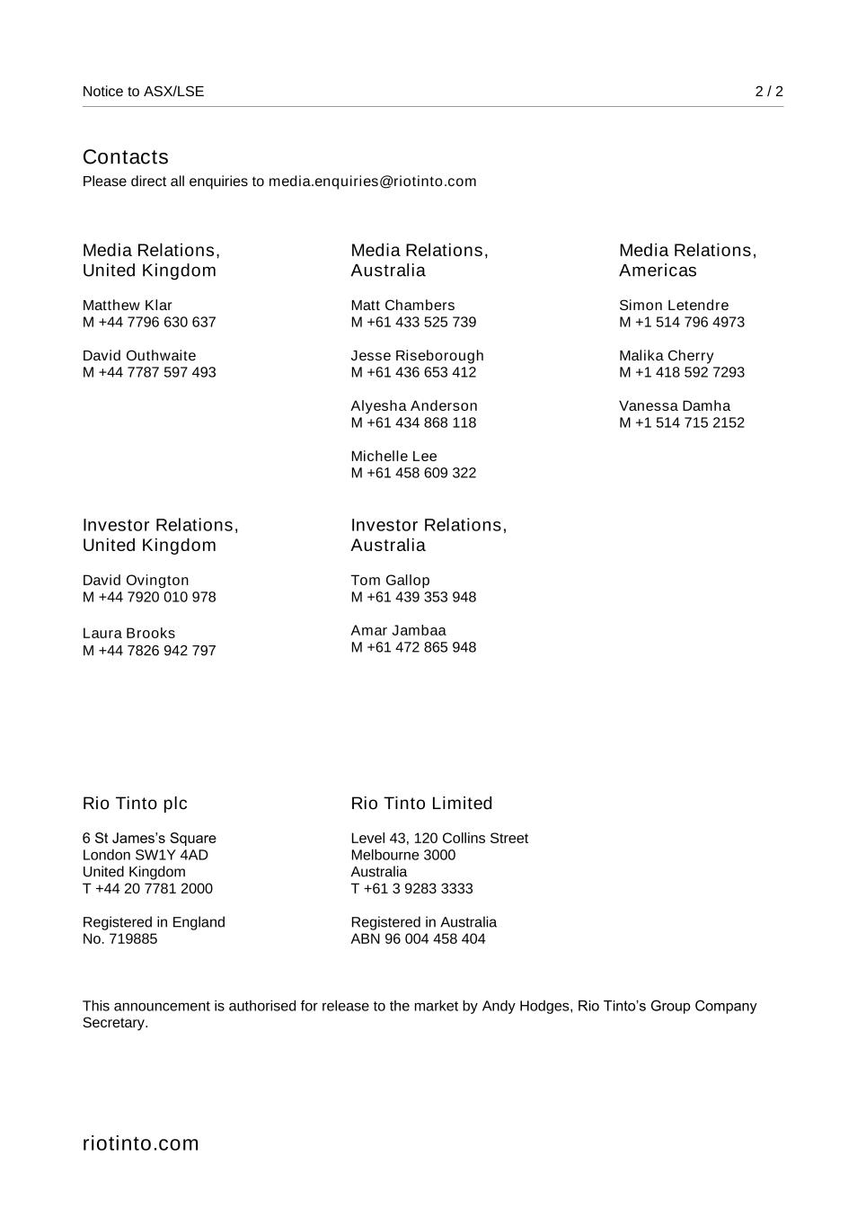Notice to ASX/LSE 2 / 2 Contacts Please direct all enquiries to media.enquiries@riotinto.com Media Relations, United Kingdom Matthew Klar M +44 7796 630 637 David Outhwaite M +44 7787 597 493 Media Relations, Australia Matt Chambers M +61 433 525 739 Jesse Riseborough M +61 436 653 412 Alyesha Anderson M +61 434 868 118 Michelle Lee M +61 458 609 322 Media Relations, Americas Simon Letendre M +1 514 796 4973 Malika Cherry M +1 418 592 7293 Vanessa Damha M +1 514 715 2152 Investor Relations, United Kingdom David Ovington M +44 7920 010 978 Laura Brooks M +44 7826 942 797 Investor Relations, Australia Tom Gallop M +61 439 353 948 Amar Jambaa M +61 472 865 948 Rio Tinto plc 6 St James’s Square London SW1Y 4AD United Kingdom T +44 20 7781 2000 Registered in England No. 719885 Rio Tinto Limited Level 43, 120 Collins Street Melbourne 3000 Australia T +61 3 9283 3333 Registered in Australia ABN 96 004 458 404 This announcement is authorised for release to the market by Andy Hodges, Rio Tinto’s Group Company Secretary. riotinto.com