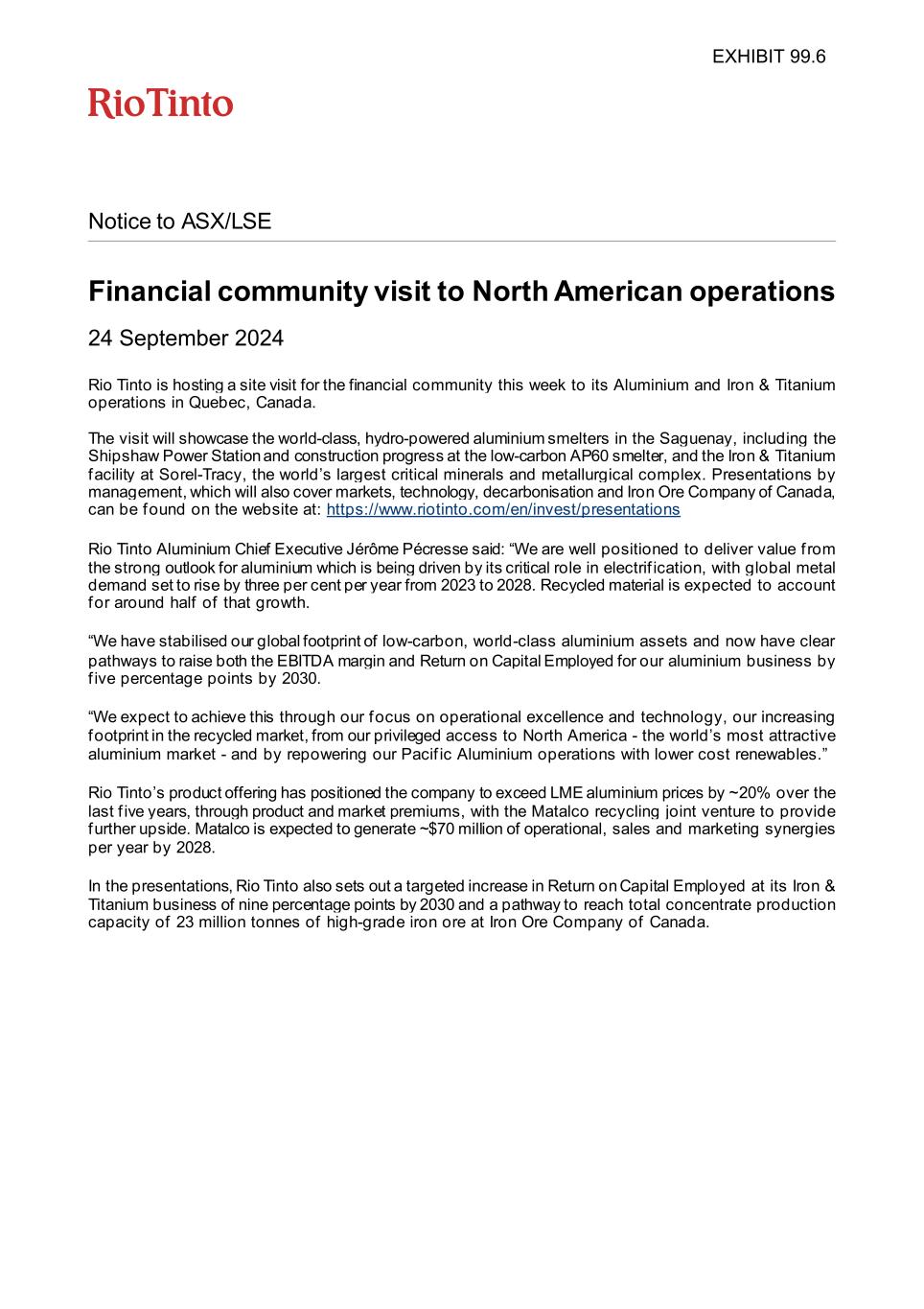 Notice to ASX/LSE Financial community visit to North American operations 24 September 2024 Rio Tinto is hosting a site visit for the financial community this week to its Aluminium and Iron & Titanium operations in Quebec, Canada. The visit will showcase the world-class, hydro-powered aluminium smelters in the Saguenay, including the Shipshaw Power Station and construction progress at the low-carbon AP60 smelter, and the Iron & Titanium facility at Sorel-Tracy, the world’s largest critical minerals and metallurgical complex. Presentations by management, which will also cover markets, technology, decarbonisation and Iron Ore Company of Canada, can be found on the website at: https://www.riotinto.com/en/invest/presentations Rio Tinto Aluminium Chief Executive Jérôme Pécresse said: “We are well positioned to deliver value f rom the strong outlook for aluminium which is being driven by its critical role in electrif ication, with global metal demand set to rise by three per cent per year from 2023 to 2028. Recycled material is expected to account for around half of that growth. “We have stabilised our global footprint of low-carbon, world-class aluminium assets and now have clear pathways to raise both the EBITDA margin and Return on Capital Employed for our aluminium business by f ive percentage points by 2030. “We expect to achieve this through our focus on operational excellence and technology, our increasing footprint in the recycled market, from our privileged access to North America - the world’s most attractive aluminium market - and by repowering our Pacif ic Aluminium operations with lower cost renewables.” Rio Tinto’s product offering has positioned the company to exceed LME aluminium prices by ~20% over the last f ive years, through product and market premiums, with the Matalco recycling joint venture to provide further upside. Matalco is expected to generate ~$70 million of operational, sales and marketing synergies per year by 2028. In the presentations, Rio Tinto also sets out a targeted increase in Return on Capital Employed at its Iron & Titanium business of nine percentage points by 2030 and a pathway to reach total concentrate production capacity of 23 million tonnes of high-grade iron ore at Iron Ore Company of Canada. EXHIBIT 99.6