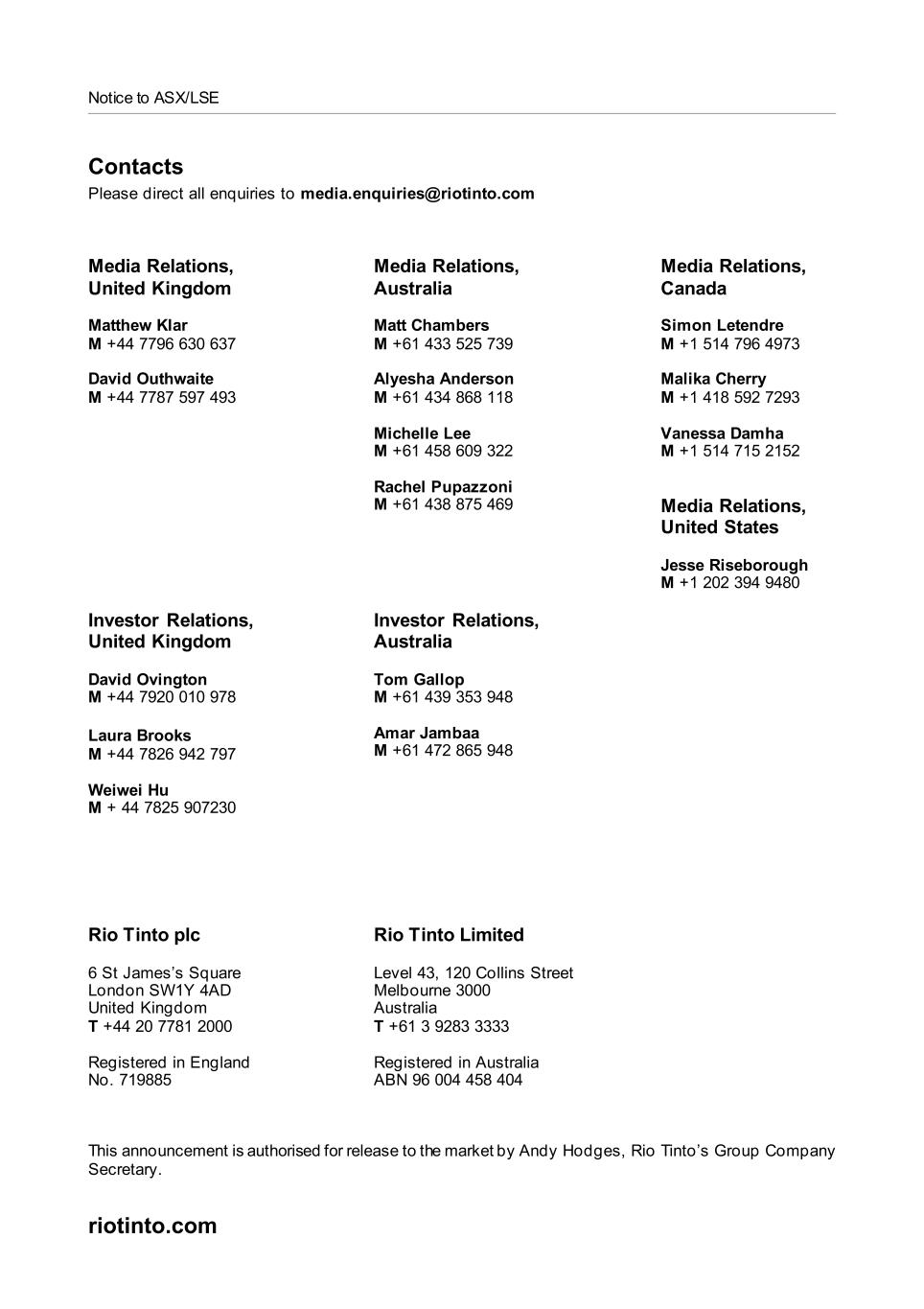 Notice to ASX/LSE Contacts Please direct all enquiries to media.enquiries@riotinto.com Media Relations, United Kingdom Matthew Klar M +44 7796 630 637 David Outhwaite M +44 7787 597 493 Media Relations, Australia Matt Chambers M +61 433 525 739 Alyesha Anderson M +61 434 868 118 Michelle Lee M +61 458 609 322 Rachel Pupazzoni M +61 438 875 469 Media Relations, Canada Simon Letendre M +1 514 796 4973 Malika Cherry M +1 418 592 7293 Vanessa Damha M +1 514 715 2152 Media Relations, United States Jesse Riseborough M +1 202 394 9480 Investor Relations, United Kingdom David Ovington M +44 7920 010 978 Laura Brooks M +44 7826 942 797 Weiwei Hu M + 44 7825 907230 Investor Relations, Australia Tom Gallop M +61 439 353 948 Amar Jambaa M +61 472 865 948 Rio Tinto plc 6 St James’s Square London SW1Y 4AD United Kingdom T +44 20 7781 2000 Registered in England No. 719885 Rio Tinto Limited Level 43, 120 Collins Street Melbourne 3000 Australia T +61 3 9283 3333 Registered in Australia ABN 96 004 458 404 This announcement is authorised for release to the market by Andy Hodges, Rio Tinto’s Group Company Secretary. riotinto.com