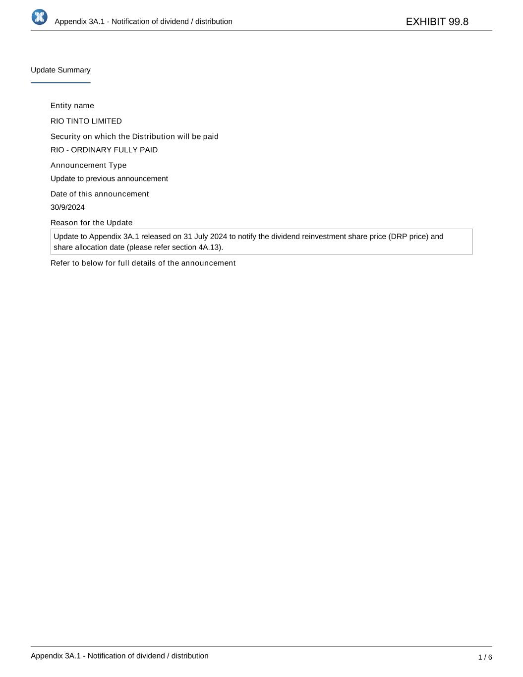 Appendix 3A.1 - Notification of dividend / distribution Appendix 3A.1 - Notification of dividend / distribution 1 / 6 Update Summary Entity name RIO TINTO LIMITED Security on which the Distribution will be paid RIO - ORDINARY FULLY PAID Announcement Type Update to previous announcement Date of this announcement 30/9/2024 Reason for the Update Update to Appendix 3A.1 released on 31 July 2024 to notify the dividend reinvestment share price (DRP price) and share allocation date (please refer section 4A.13). Refer to below for full details of the announcement EXHIBIT 99.8