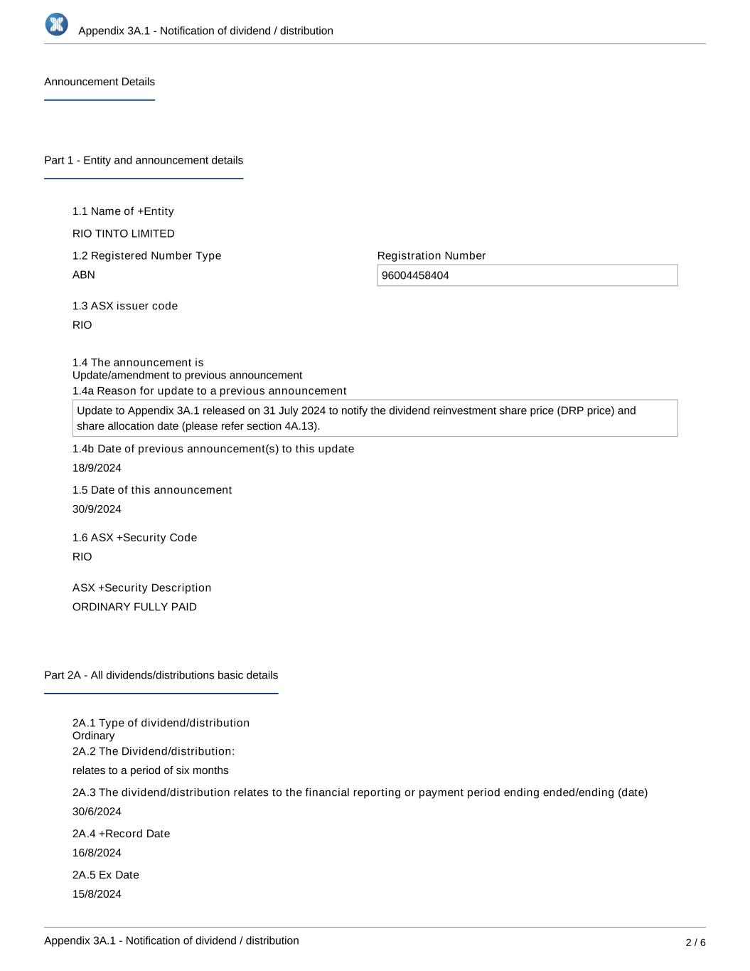 Appendix 3A.1 - Notification of dividend / distribution Appendix 3A.1 - Notification of dividend / distribution 2 / 6 Announcement Details Part 1 - Entity and announcement details 1.1 Name of +Entity RIO TINTO LIMITED 1.2 Registered Number Type ABN Registration Number 96004458404 1.3 ASX issuer code RIO 1.4 The announcement is 1.4a Reason for update to a previous announcement Update to Appendix 3A.1 released on 31 July 2024 to notify the dividend reinvestment share price (DRP price) and share allocation date (please refer section 4A.13). 1.4b Date of previous announcement(s) to this update 18/9/2024 1.5 Date of this announcement 30/9/2024 1.6 ASX +Security Code RIO ASX +Security Description ORDINARY FULLY PAID Part 2A - All dividends/distributions basic details 2A.1 Type of dividend/distribution 2A.2 The Dividend/distribution: relates to a period of six months 2A.3 The dividend/distribution relates to the financial reporting or payment period ending ended/ending (date) 30/6/2024 2A.4 +Record Date 16/8/2024 2A.5 Ex Date 15/8/2024 2A.6 Payment Date Ordinary Update/amendment to previous announcement