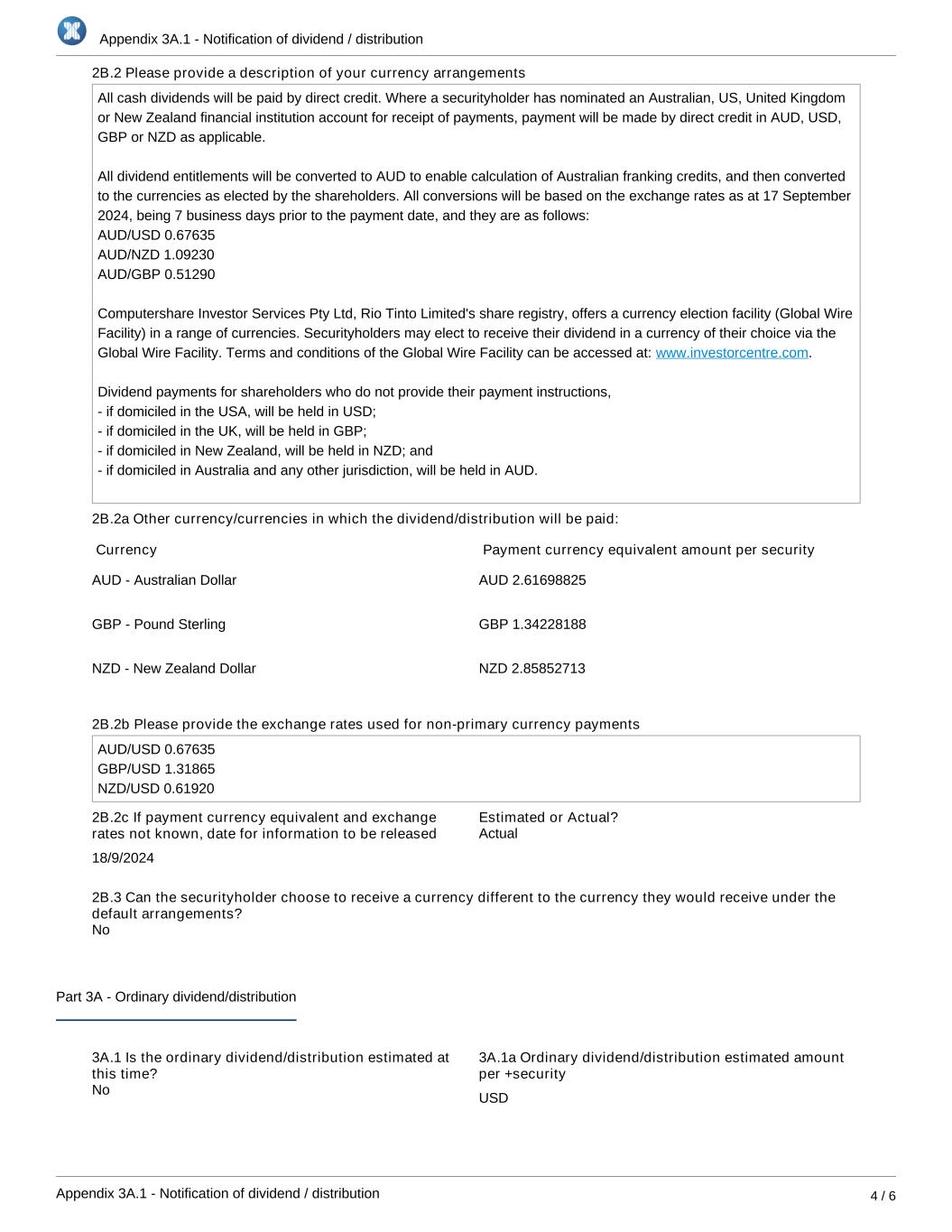 Appendix 3A.1 - Notification of dividend / distribution Appendix 3A.1 - Notification of dividend / distribution 4 / 6 2B.2 Please provide a description of your currency arrangements All cash dividends will be paid by direct credit. Where a securityholder has nominated an Australian, US, United Kingdom or New Zealand financial institution account for receipt of payments, payment will be made by direct credit in AUD, USD, GBP or NZD as applicable. All dividend entitlements will be converted to AUD to enable calculation of Australian franking credits, and then converted to the currencies as elected by the shareholders. All conversions will be based on the exchange rates as at 17 September 2024, being 7 business days prior to the payment date, and they are as follows: AUD/USD 0.67635 AUD/NZD 1.09230 AUD/GBP 0.51290 Computershare Investor Services Pty Ltd, Rio Tinto Limited's share registry, offers a currency election facility (Global Wire Facility) in a range of currencies. Securityholders may elect to receive their dividend in a currency of their choice via the Global Wire Facility. Terms and conditions of the Global Wire Facility can be accessed at: .www.investorcentre.com Dividend payments for shareholders who do not provide their payment instructions, - if domiciled in the USA, will be held in USD; - if domiciled in the UK, will be held in GBP; - if domiciled in New Zealand, will be held in NZD; and - if domiciled in Australia and any other jurisdiction, will be held in AUD. 2B.2a Other currency/currencies in which the dividend/distribution will be paid: Currency Payment currency equivalent amount per security AUD - Australian Dollar AUD 2.61698825 GBP - Pound Sterling GBP 1.34228188 NZD - New Zealand Dollar NZD 2.85852713 2B.2b Please provide the exchange rates used for non-primary currency payments AUD/USD 0.67635 GBP/USD 1.31865 NZD/USD 0.61920 2B.2c If payment currency equivalent and exchange rates not known, date for information to be released 18/9/2024 Estimated or Actual? 2B.3 Can the securityholder choose to receive a currency different to the currency they would receive under the default arrangements? Part 3A - Ordinary dividend/distribution 3A.1 Is the ordinary dividend/distribution estimated at this time? 3A.1a Ordinary dividend/distribution estimated amount per +security USD No No Actual