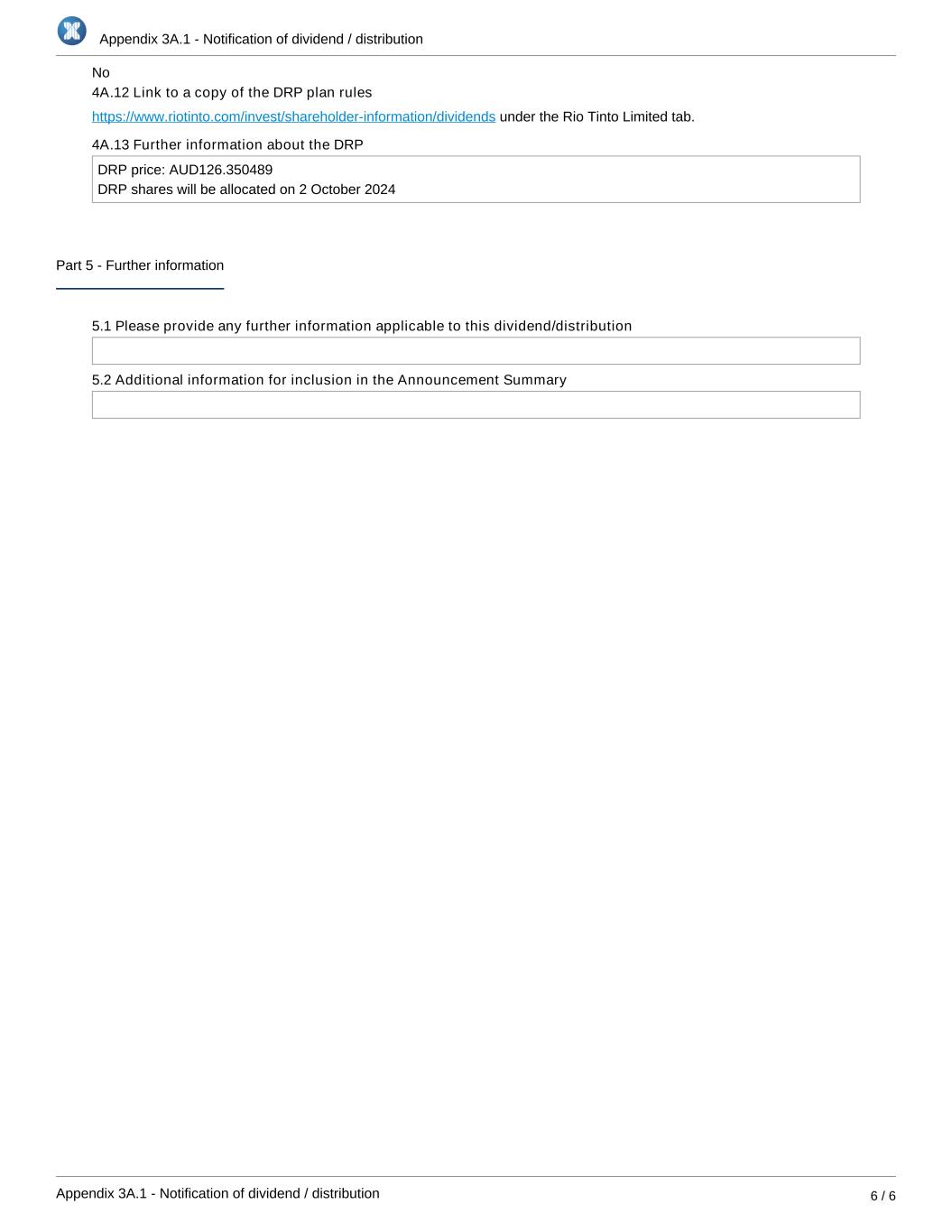 Appendix 3A.1 - Notification of dividend / distribution Appendix 3A.1 - Notification of dividend / distribution 6 / 6 4A.12 Link to a copy of the DRP plan rules under the Rio Tinto Limited tab.https://www.riotinto.com/invest/shareholder-information/dividends 4A.13 Further information about the DRP DRP price: AUD126.350489 DRP shares will be allocated on 2 October 2024 Part 5 - Further information 5.1 Please provide any further information applicable to this dividend/distribution 5.2 Additional information for inclusion in the Announcement Summary No