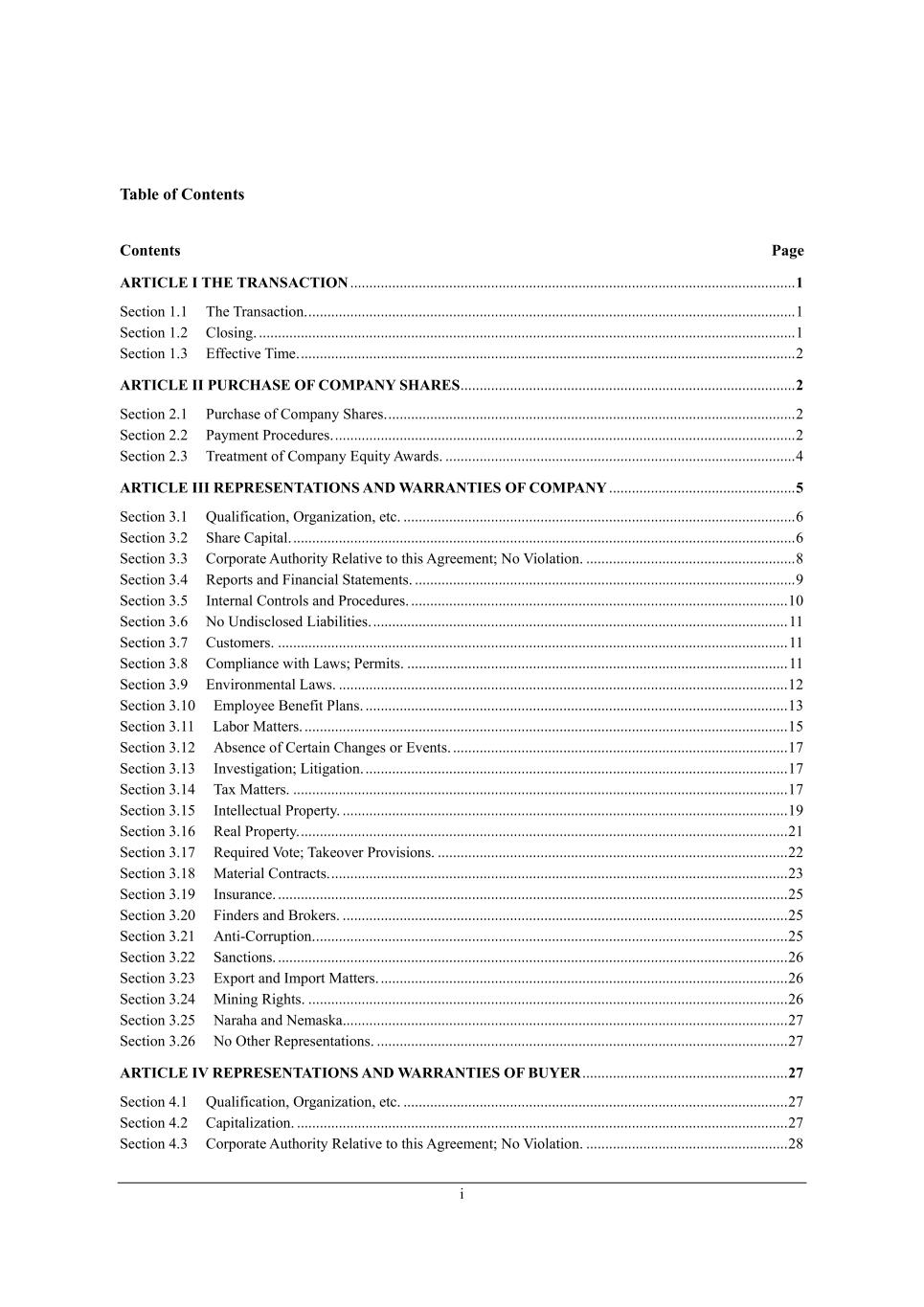_ Table of Contents Contents Page ARTICLE I THE TRANSACTION ..................................................................................................................... 1 M[Yj_ed /,/ N^[ NhWdiWYj_ed, ................................................................................................................................ / M[Yj_ed /,0 =bei_d], ............................................................................................................................................. / M[Yj_ed /,1 ?\\[Yj_l[ N_c[, .................................................................................................................................. 0 ARTICLE II PURCHASE OF COMPANY SHARES ........................................................................................ 2 M[Yj_ed 0,/ JkhY^Wi[ e\ =ecfWdo M^Wh[i, ........................................................................................................... 0 M[Yj_ed 0,0 JWoc[dj JheY[Zkh[i, ......................................................................................................................... 0 M[Yj_ed 0,1 Nh[Wjc[dj e\ =ecfWdo ?gk_jo ;mWhZi, ............................................................................................ 2 ARTICLE III REPRESENTATIONS AND WARRANTIES OF COMPANY ................................................. 5 M[Yj_ed 1,/ KkWb_\_YWj_ed* Ih]Wd_pWj_ed* [jY, ....................................................................................................... 4 M[Yj_ed 1,0 M^Wh[ =Wf_jWb, .................................................................................................................................... 4 M[Yj_ed 1,1 =ehfehWj[ ;kj^eh_jo L[bWj_l[ je j^_i ;]h[[c[dj9 He P_ebWj_ed, ....................................................... 6 M[Yj_ed 1,2 L[fehji WdZ @_dWdY_Wb MjWj[c[dji, .................................................................................................... 7 M[Yj_ed 1,3 Cdj[hdWb =edjhebi WdZ JheY[Zkh[i, ................................................................................................... /. M[Yj_ed 1,4 He OdZ_iYbei[Z F_WX_b_j_[i, ............................................................................................................. // M[Yj_ed 1,5 =kijec[hi, ...................................................................................................................................... // M[Yj_ed 1,6 =ecfb_WdY[ m_j^ FWmi9 J[hc_ji, .................................................................................................... // M[Yj_ed 1,7 ?dl_hedc[djWb FWmi, ...................................................................................................................... /0 M[Yj_ed 1,/. ?cfbeo[[ <[d[\_j JbWdi, ............................................................................................................... /1 M[Yj_ed 1,// FWXeh GWjj[hi, ............................................................................................................................... /3 M[Yj_ed 1,/0 ;Xi[dY[ e\ =[hjW_d =^Wd][i eh ?l[dji, ........................................................................................ /5 M[Yj_ed 1,/1 Cdl[ij_]Wj_ed9 F_j_]Wj_ed, ............................................................................................................... /5 M[Yj_ed 1,/2 NWn GWjj[hi, .................................................................................................................................. /5 M[Yj_ed 1,/3 Cdj[bb[YjkWb Jhef[hjo, ..................................................................................................................... /7 M[Yj_ed 1,/4 L[Wb Jhef[hjo, ................................................................................................................................ 0/ M[Yj_ed 1,/5 L[gk_h[Z Pej[9 NWa[el[h Jhel_i_edi, ............................................................................................ 00 M[Yj_ed 1,/6 GWj[h_Wb =edjhWYji, ........................................................................................................................ 01 M[Yj_ed 1,/7 CdikhWdY[, ...................................................................................................................................... 03 M[Yj_ed 1,0. @_dZ[hi WdZ <hea[hi, ..................................................................................................................... 03 M[Yj_ed 1,0/ ;dj_+=ehhkfj_ed, ............................................................................................................................ 03 M[Yj_ed 1,00 MWdYj_edi, ...................................................................................................................................... 04 M[Yj_ed 1,01 ?nfehj WdZ Ccfehj GWjj[hi, ........................................................................................................... 04 M[Yj_ed 1,02 G_d_d] L_]^ji, .............................................................................................................................. 04 M[Yj_ed 1,03 HWhW^W WdZ H[cWiaW,.................................................................................................................... 05 M[Yj_ed 1,04 He Ij^[h L[fh[i[djWj_edi, ............................................................................................................ 05 ARTICLE IV REPRESENTATIONS AND WARRANTIES OF BUYER ...................................................... 27 M[Yj_ed 2,/ KkWb_\_YWj_ed* Ih]Wd_pWj_ed* [jY, ..................................................................................................... 05 M[Yj_ed 2,0 =Wf_jWb_pWj_ed, ................................................................................................................................. 05 M[Yj_ed 2,1 =ehfehWj[ ;kj^eh_jo L[bWj_l[ je j^_i ;]h[[c[dj9 He P_ebWj_ed, ..................................................... 06