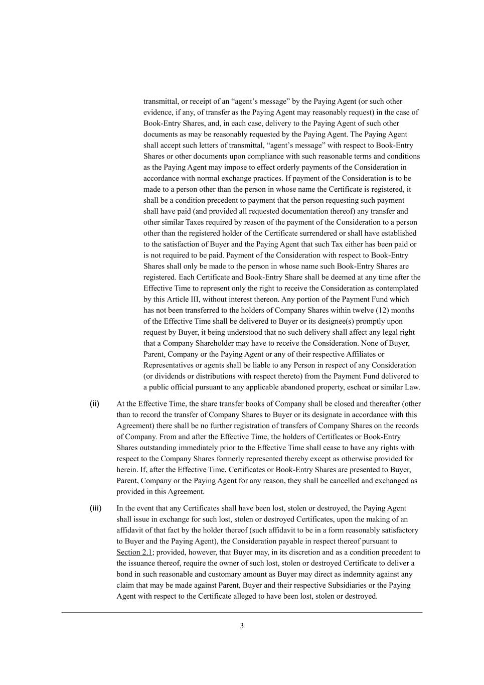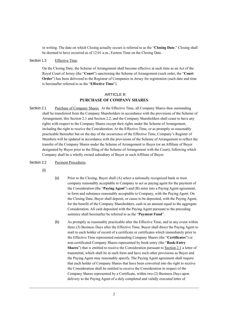 0 _d mh_j_d], N^[ ZWj[ ed m^_Y^ =bei_d] WYjkWbbo eYYkhi _i h[\[hh[Z je Wi j^[ rClosing Date,s =bei_d] i^Wbb X[ Z[[c[Z je ^Wl[ eYYkhh[Z Wi e\ /08./ W,c,* ?Wij[hd N_c[ ed j^[ =bei_d] >Wj[, Section 1.3 ?\\[Yj_l[ N_c[, Id j^[ =bei_d] >Wj[* j^[ MY^[c[ e\ ;hhWd][c[dj i^Wbb X[Yec[ [\\[Yj_l[ Wj ikY^ j_c[ Wi Wd ;Yj e\ j^[ LeoWb =ekhj e\ D[hi[o (j^[ rCourts) iWdYj_ed_d] j^[ MY^[c[ e\ ;hhWd][c[dj (ikY^ ehZ[h* j^[ rCourt Orders) ^Wi X[[d Z[b_l[h[Z je j^[ L[]_ijhWh e\ =ecfWd_[i _d D[hi[o \eh h[]_ijhWj_ed (ikY^ ZWj[ WdZ j_c[ _i ^[h[_dW\j[h h[\[hh[Z je Wi j^[ rEffective Times), ARTICLE II PURCHASE OF COMPANY SHARES Section 2.1 JkhY^Wi[ e\ =ecfWdo M^Wh[i, ;j j^[ ?\\[Yj_l[ N_c[* Wbb =ecfWdo M^Wh[i j^[d ekjijWdZ_d] i^Wbb X[ jhWdi\[hh[Z \hec j^[ =ecfWdo M^Wh[^ebZ[hi _d WYYehZWdY[ m_j^ j^[ fhel_i_edi e\ j^[ MY^[c[ e\ ;hhWd][c[dj* j^_i M[Yj_ed 0,/ WdZ M[Yj_ed 0,0* WdZ j^[ =ecfWdo M^Wh[^ebZ[hi i^Wbb Y[Wi[ je ^Wl[ Wdo h_]^ji m_j^ h[if[Yj je j^[ =ecfWdo M^Wh[i [nY[fj j^[_h h_]^ji kdZ[h j^[ MY^[c[ e\ ;hhWd][c[dj* _dYbkZ_d] j^[ h_]^j je h[Y[_l[ j^[ =edi_Z[hWj_ed, ;j j^[ ?\\[Yj_l[ N_c[* eh Wi fhecfjbo Wi h[WiedWXbo fhWYj_YWXb[ j^[h[W\j[h Xkj ed j^[ ZWo e\ j^[ eYYkhh[dY[ e\ j^[ ?\\[Yj_l[ N_c[* =ecfWdoui L[]_ij[h e\ G[cX[hi m_bb X[ kfZWj[Z _d WYYehZWdY[ m_j^ j^[ fhel_i_edi e\ j^[ MY^[c[ e\ ;hhWd][c[dj je h[\b[Yj j^[ jhWdi\[h e\ j^[ =ecfWdo M^Wh[i kdZ[h j^[ MY^[c[ e\ ;hhWd][c[dj je <ko[h (eh Wd ;\\_b_Wj[ e\ <ko[h Z[i_]dWj[Z Xo <ko[h fh_eh je j^[ \_b_d] e\ j^[ MY^[c[ e\ ;hhWd][c[dj m_j^ j^[ =ekhj)* \ebbem_d] m^_Y^ =ecfWdo i^Wbb X[ W m^ebbo emd[Z ikXi_Z_Who e\ <ko[h eh ikY^ ;\\_b_Wj[ e\ <ko[h, Section 2.2 JWoc[dj JheY[Zkh[i, (i) (a) Jh_eh je j^[ =bei_d]* <ko[h i^Wbb (;) i[b[Yj W dWj_edWbbo h[Ye]d_p[Z XWda eh jhkij YecfWdo h[WiedWXbo WYY[fjWXb[ je =ecfWdo je WYj Wi fWo_d] W][dj \eh j^[ fWoc[dj e\ j^[ =edi_Z[hWj_ed (j^[ rPaying Agents) WdZ (<) [dj[h _dje W JWo_d] ;][dj W]h[[c[dj* _d \ehc WdZ ikXijWdY[ h[WiedWXbo WYY[fjWXb[ je =ecfWdo* m_j^ j^[ JWo_d] ;][dj, Id j^[ =bei_d] >Wj[* <ko[h i^Wbb Z[fei_j* eh YWki[ je X[ Z[fei_j[Z* m_j^ j^[ JWo_d] ;][dj* \eh j^[ X[d[\_j e\ j^[ =ecfWdo M^Wh[^ebZ[hi* YWi^ _d Wd Wcekdj [gkWb je j^[ W]]h[]Wj[ =edi_Z[hWj_ed, ;bb YWi^ Z[fei_j[Z m_j^ j^[ JWo_d] ;][dj fkhikWdj je j^[ fh[Y[Z_d] i[dj[dY[ i^Wbb ^[h[_dW\j[h X[ h[\[hh[Z je Wi j^[ rPayment Funds, (b) ;i fhecfjbo Wi h[WiedWXbo fhWYj_YWXb[ W\j[h j^[ ?\\[Yj_l[ N_c[* WdZ _d Wdo [l[dj m_j^_d j^h[[ (1) <ki_d[ii >Woi W\j[h j^[ ?\\[Yj_l[ N_c[* <ko[h i^Wbb Z_h[Yj j^[ JWo_d] ;][dj je cW_b je [WY^ ^ebZ[h e\ h[YehZ e\ W Y[hj_\_YWj[ eh Y[hj_\_YWj[i m^_Y^ _cc[Z_Wj[bo fh_eh je j^[ ?\\[Yj_l[ N_c[ h[fh[i[dj[Z ekjijWdZ_d] =ecfWdo M^Wh[i (j^[ rCertificatess) eh ded+Y[hj_\_YWj[Z =ecfWdo M^Wh[i h[fh[i[dj[Z Xo Xeea+[djho (j^[ rBook-Entry Sharess) j^Wj _i [dj_jb[Z je h[Y[_l[ j^[ =edi_Z[hWj_ed fkhikWdj je M[Yj_ed 0,/ W b[jj[h e\ jhWdic_jjWb* m^_Y^ i^Wbb X[ _d ikY^ \ehc WdZ ^Wl[ ikY^ ej^[h fhel_i_edi Wi <ko[h WdZ j^[ JWo_d] ;][dj cWo h[WiedWXbo if[Y_\o, N^[ JWo_d] ;][dj W]h[[c[dj i^Wbb h[gk_h[ j^Wj [WY^ ^ebZ[h e\ =ecfWdo M^Wh[i j^Wj ^Wl[ X[[d Yedl[hj[Z _dje j^[ h_]^j je h[Y[_l[ j^[ =edi_Z[hWj_ed i^Wbb X[ [dj_jb[Z je h[Y[_l[ j^[ =edi_Z[hWj_ed _d h[if[Yj e\ j^[ =ecfWdo M^Wh[i h[fh[i[dj[Z Xo W =[hj_\_YWj[* m_j^_d jme (0) <ki_d[ii >Woi kfed Z[b_l[ho je j^[ JWo_d] ;][dj e\ W Zkbo Yecfb[j[Z WdZ lWb_Zbo [n[Ykj[Z b[jj[h e\