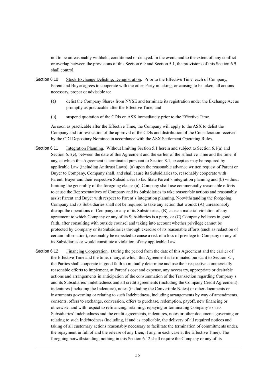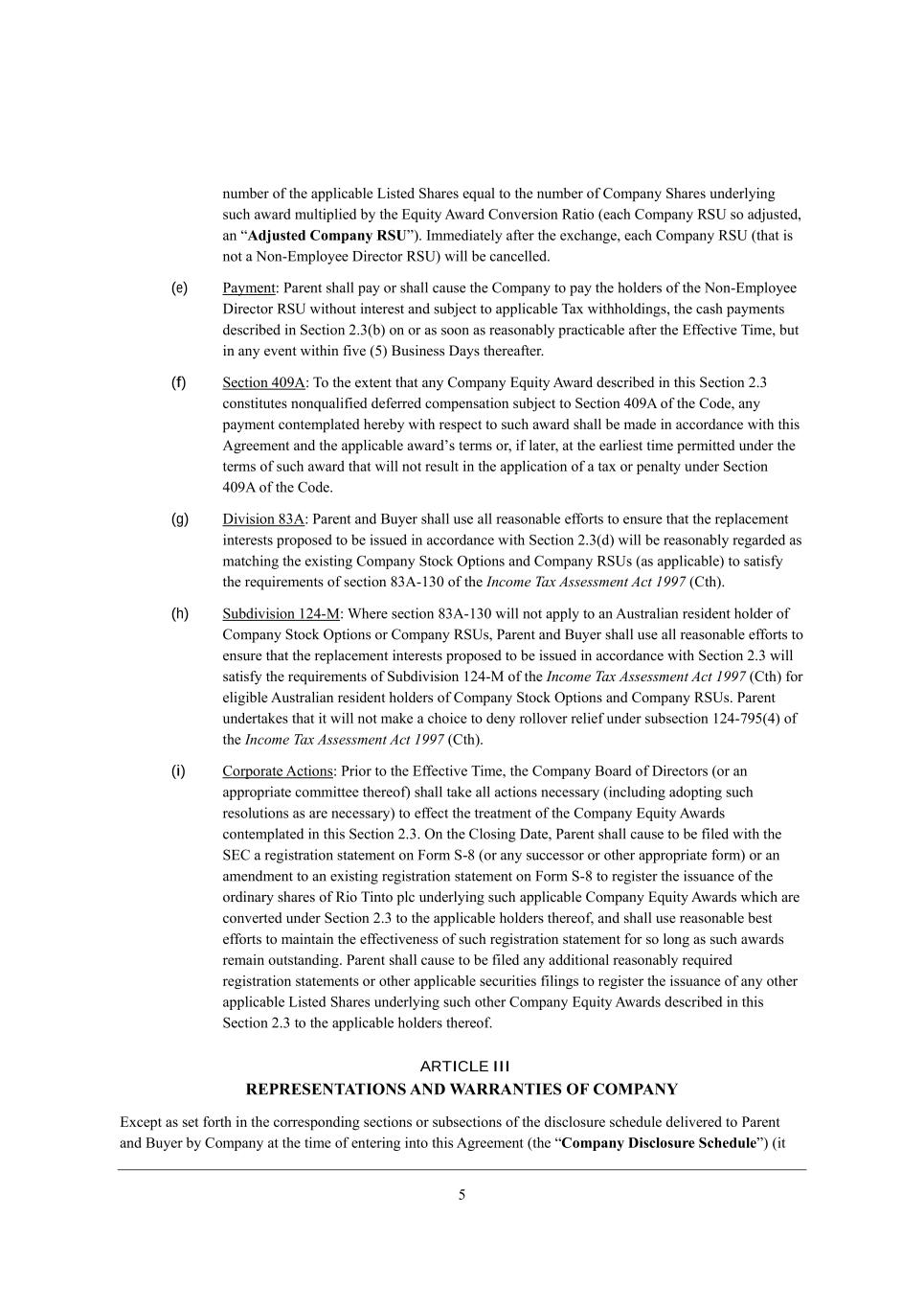 3 dkcX[h e\ j^[ Wffb_YWXb[ F_ij[Z M^Wh[i [gkWb je j^[ dkcX[h e\ =ecfWdo M^Wh[i kdZ[hbo_d] ikY^ WmWhZ ckbj_fb_[Z Xo j^[ ?gk_jo ;mWhZ =edl[hi_ed LWj_e ([WY^ =ecfWdo LMO ie WZ`kij[Z* Wd rAdjusted Company RSUs), Ccc[Z_Wj[bo W\j[h j^[ [nY^Wd][* [WY^ =ecfWdo LMO (j^Wj _i dej W Hed+?cfbeo[[ >_h[Yjeh LMO) m_bb X[ YWdY[bb[Z, (e) JWoc[dj8 JWh[dj i^Wbb fWo eh i^Wbb YWki[ j^[ =ecfWdo je fWo j^[ ^ebZ[hi e\ j^[ Hed+?cfbeo[[ >_h[Yjeh LMO m_j^ekj _dj[h[ij WdZ ikX`[Yj je Wffb_YWXb[ NWn m_j^^ebZ_d]i* j^[ YWi^ fWoc[dji Z[iYh_X[Z _d M[Yj_ed 0,1(X) ed eh Wi ieed Wi h[WiedWXbo fhWYj_YWXb[ W\j[h j^[ ?\\[Yj_l[ N_c[* Xkj _d Wdo [l[dj m_j^_d \_l[ (3) <ki_d[ii >Woi j^[h[W\j[h, (f) M[Yj_ed 2.7;8 Ne j^[ [nj[dj j^Wj Wdo =ecfWdo ?gk_jo ;mWhZ Z[iYh_X[Z _d j^_i M[Yj_ed 0,1 Yedij_jkj[i dedgkWb_\_[Z Z[\[hh[Z Yecf[diWj_ed ikX`[Yj je M[Yj_ed 2.7; e\ j^[ =eZ[* Wdo fWoc[dj Yedj[cfbWj[Z ^[h[Xo m_j^ h[if[Yj je ikY^ WmWhZ i^Wbb X[ cWZ[ _d WYYehZWdY[ m_j^ j^_i ;]h[[c[dj WdZ j^[ Wffb_YWXb[ WmWhZui j[hci eh* _\ bWj[h* Wj j^[ [Whb_[ij j_c[ f[hc_jj[Z kdZ[h j^[ j[hci e\ ikY^ WmWhZ j^Wj m_bb dej h[ikbj _d j^[ Wffb_YWj_ed e\ W jWn eh f[dWbjo kdZ[h M[Yj_ed 2.7; e\ j^[ =eZ[, (g) >_l_i_ed 61;8 JWh[dj WdZ <ko[h i^Wbb ki[ Wbb h[WiedWXb[ [\\ehji je [dikh[ j^Wj j^[ h[fbWY[c[dj _dj[h[iji fhefei[Z je X[ _iik[Z _d WYYehZWdY[ m_j^ M[Yj_ed 0,1(Z) m_bb X[ h[WiedWXbo h[]WhZ[Z Wi cWjY^_d] j^[ [n_ij_d] =ecfWdo MjeYa Ifj_edi WdZ =ecfWdo LMOi (Wi Wffb_YWXb[) je iWj_i\o j^[ h[gk_h[c[dji e\ i[Yj_ed 61;+/1. e\ j^[ Income Tax Assessment Act 1997 (=j^), (h) MkXZ_l_i_ed /02+G8 Q^[h[ i[Yj_ed 61;+/1. m_bb dej Wffbo je Wd ;kijhWb_Wd h[i_Z[dj ^ebZ[h e\ =ecfWdo MjeYa Ifj_edi eh =ecfWdo LMOi* JWh[dj WdZ <ko[h i^Wbb ki[ Wbb h[WiedWXb[ [\\ehji je [dikh[ j^Wj j^[ h[fbWY[c[dj _dj[h[iji fhefei[Z je X[ _iik[Z _d WYYehZWdY[ m_j^ M[Yj_ed 0,1 m_bb iWj_i\o j^[ h[gk_h[c[dji e\ MkXZ_l_i_ed /02+G e\ j^[ Income Tax Assessment Act 1997 (=j^) \eh [b_]_Xb[ ;kijhWb_Wd h[i_Z[dj ^ebZ[hi e\ =ecfWdo MjeYa Ifj_edi WdZ =ecfWdo LMOi, JWh[dj kdZ[hjWa[i j^Wj _j m_bb dej cWa[ W Y^e_Y[ je Z[do hebbel[h h[b_[\ kdZ[h ikXi[Yj_ed /02+573(2) e\ j^[ Income Tax Assessment Act 1997 (=j^), (i) =ehfehWj[ ;Yj_edi8 Jh_eh je j^[ ?\\[Yj_l[ N_c[* j^[ =ecfWdo <eWhZ e\ >_h[Yjehi (eh Wd Wffhefh_Wj[ Yecc_jj[[ j^[h[e\) i^Wbb jWa[ Wbb WYj_edi d[Y[iiWho (_dYbkZ_d] WZefj_d] ikY^ h[iebkj_edi Wi Wh[ d[Y[iiWho) je [\\[Yj j^[ jh[Wjc[dj e\ j^[ =ecfWdo ?gk_jo ;mWhZi Yedj[cfbWj[Z _d j^_i M[Yj_ed 0,1, Id j^[ =bei_d] >Wj[* JWh[dj i^Wbb YWki[ je X[ \_b[Z m_j^ j^[ M?= W h[]_ijhWj_ed ijWj[c[dj ed @ehc M+6 (eh Wdo ikYY[iieh eh ej^[h Wffhefh_Wj[ \ehc) eh Wd Wc[dZc[dj je Wd [n_ij_d] h[]_ijhWj_ed ijWj[c[dj ed @ehc M+6 je h[]_ij[h j^[ _iikWdY[ e\ j^[ ehZ_dWho i^Wh[i e\ L_e N_dje fbY kdZ[hbo_d] ikY^ Wffb_YWXb[ =ecfWdo ?gk_jo ;mWhZi m^_Y^ Wh[ Yedl[hj[Z kdZ[h M[Yj_ed 0,1 je j^[ Wffb_YWXb[ ^ebZ[hi j^[h[e\* WdZ i^Wbb ki[ h[WiedWXb[ X[ij [\\ehji je cW_djW_d j^[ [\\[Yj_l[d[ii e\ ikY^ h[]_ijhWj_ed ijWj[c[dj \eh ie bed] Wi ikY^ WmWhZi h[cW_d ekjijWdZ_d], JWh[dj i^Wbb YWki[ je X[ \_b[Z Wdo WZZ_j_edWb h[WiedWXbo h[gk_h[Z h[]_ijhWj_ed ijWj[c[dji eh ej^[h Wffb_YWXb[ i[Ykh_j_[i \_b_d]i je h[]_ij[h j^[ _iikWdY[ e\ Wdo ej^[h Wffb_YWXb[ F_ij[Z M^Wh[i kdZ[hbo_d] ikY^ ej^[h =ecfWdo ?gk_jo ;mWhZi Z[iYh_X[Z _d j^_i M[Yj_ed 0,1 je j^[ Wffb_YWXb[ ^ebZ[hi j^[h[e\, ARTICLE III REPRESENTATIONS AND WARRANTIES OF COMPANY ?nY[fj Wi i[j \ehj^ _d j^[ Yehh[ifedZ_d] i[Yj_edi eh ikXi[Yj_edi e\ j^[ Z_iYbeikh[ iY^[Zkb[ Z[b_l[h[Z je JWh[dj WdZ <ko[h Xo =ecfWdo Wj j^[ j_c[ e\ [dj[h_d] _dje j^_i ;]h[[c[dj (j^[ rCompany Disclosure Schedules) (_j