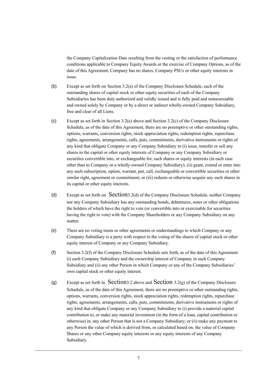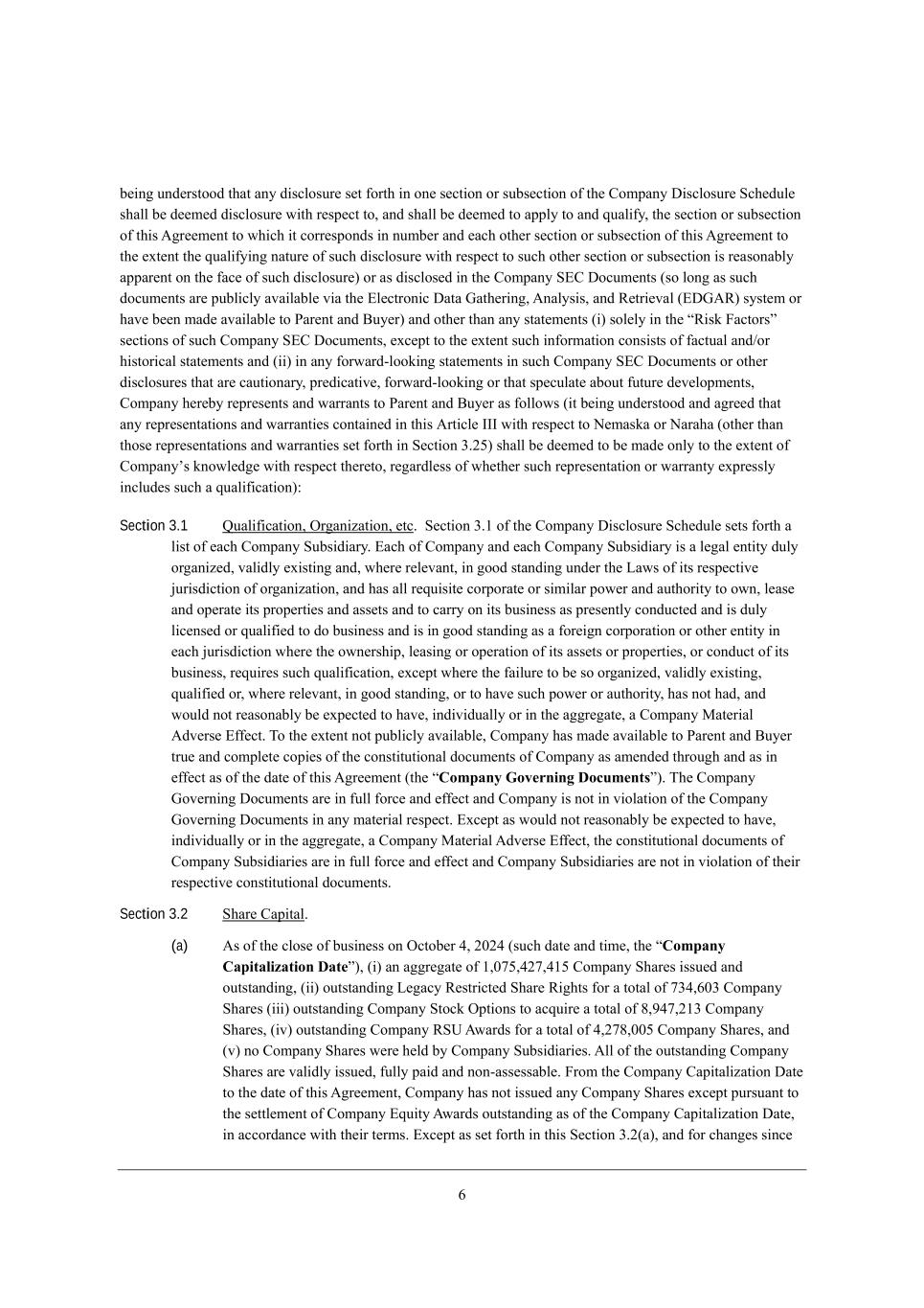 4 X[_d] kdZ[hijeeZ j^Wj Wdo Z_iYbeikh[ i[j \ehj^ _d ed[ i[Yj_ed eh ikXi[Yj_ed e\ j^[ =ecfWdo >_iYbeikh[ MY^[Zkb[ i^Wbb X[ Z[[c[Z Z_iYbeikh[ m_j^ h[if[Yj je* WdZ i^Wbb X[ Z[[c[Z je Wffbo je WdZ gkWb_\o* j^[ i[Yj_ed eh ikXi[Yj_ed e\ j^_i ;]h[[c[dj je m^_Y^ _j Yehh[ifedZi _d dkcX[h WdZ [WY^ ej^[h i[Yj_ed eh ikXi[Yj_ed e\ j^_i ;]h[[c[dj je j^[ [nj[dj j^[ gkWb_\o_d] dWjkh[ e\ ikY^ Z_iYbeikh[ m_j^ h[if[Yj je ikY^ ej^[h i[Yj_ed eh ikXi[Yj_ed _i h[WiedWXbo WffWh[dj ed j^[ \WY[ e\ ikY^ Z_iYbeikh[) eh Wi Z_iYbei[Z _d j^[ =ecfWdo M?= >eYkc[dji (ie bed] Wi ikY^ ZeYkc[dji Wh[ fkXb_Ybo WlW_bWXb[ l_W j^[ ?b[Yjhed_Y >WjW AWj^[h_d]* ;dWboi_i* WdZ L[jh_[lWb (?>A;L) ioij[c eh ^Wl[ X[[d cWZ[ WlW_bWXb[ je JWh[dj WdZ <ko[h) WdZ ej^[h j^Wd Wdo ijWj[c[dji (_) ieb[bo _d j^[ rL_ia @WYjehis i[Yj_edi e\ ikY^ =ecfWdo M?= >eYkc[dji* [nY[fj je j^[ [nj[dj ikY^ _d\ehcWj_ed Yedi_iji e\ \WYjkWb WdZ-eh ^_ijeh_YWb ijWj[c[dji WdZ (__) _d Wdo \ehmWhZ+beea_d] ijWj[c[dji _d ikY^ =ecfWdo M?= >eYkc[dji eh ej^[h Z_iYbeikh[i j^Wj Wh[ YWkj_edWho* fh[Z_YWj_l[* \ehmWhZ+beea_d] eh j^Wj if[YkbWj[ WXekj \kjkh[ Z[l[befc[dji* =ecfWdo ^[h[Xo h[fh[i[dji WdZ mWhhWdji je JWh[dj WdZ <ko[h Wi \ebbemi (_j X[_d] kdZ[hijeeZ WdZ W]h[[Z j^Wj Wdo h[fh[i[djWj_edi WdZ mWhhWdj_[i YedjW_d[Z _d j^_i ;hj_Yb[ CCC m_j^ h[if[Yj je H[cWiaW eh HWhW^W (ej^[h j^Wd j^ei[ h[fh[i[djWj_edi WdZ mWhhWdj_[i i[j \ehj^ _d M[Yj_ed 1,03) i^Wbb X[ Z[[c[Z je X[ cWZ[ edbo je j^[ [nj[dj e\ =ecfWdoui ademb[Z][ m_j^ h[if[Yj j^[h[je* h[]WhZb[ii e\ m^[j^[h ikY^ h[fh[i[djWj_ed eh mWhhWdjo [nfh[iibo _dYbkZ[i ikY^ W gkWb_\_YWj_ed)8 Section 3.1 KkWb_\_YWj_ed* Ih]Wd_pWj_ed* [jY, M[Yj_ed 1,/ e\ j^[ =ecfWdo >_iYbeikh[ MY^[Zkb[ i[ji \ehj^ W b_ij e\ [WY^ =ecfWdo MkXi_Z_Who, ?WY^ e\ =ecfWdo WdZ [WY^ =ecfWdo MkXi_Z_Who _i W b[]Wb [dj_jo Zkbo eh]Wd_p[Z* lWb_Zbo [n_ij_d] WdZ* m^[h[ h[b[lWdj* _d ]eeZ ijWdZ_d] kdZ[h j^[ FWmi e\ _ji h[if[Yj_l[ `kh_iZ_Yj_ed e\ eh]Wd_pWj_ed* WdZ ^Wi Wbb h[gk_i_j[ YehfehWj[ eh i_c_bWh fem[h WdZ Wkj^eh_jo je emd* b[Wi[ WdZ ef[hWj[ _ji fhef[hj_[i WdZ Wii[ji WdZ je YWhho ed _ji Xki_d[ii Wi fh[i[djbo YedZkYj[Z WdZ _i Zkbo b_Y[di[Z eh gkWb_\_[Z je Ze Xki_d[ii WdZ _i _d ]eeZ ijWdZ_d] Wi W \eh[_]d YehfehWj_ed eh ej^[h [dj_jo _d [WY^ `kh_iZ_Yj_ed m^[h[ j^[ emd[hi^_f* b[Wi_d] eh ef[hWj_ed e\ _ji Wii[ji eh fhef[hj_[i* eh YedZkYj e\ _ji Xki_d[ii* h[gk_h[i ikY^ gkWb_\_YWj_ed* [nY[fj m^[h[ j^[ \W_bkh[ je X[ ie eh]Wd_p[Z* lWb_Zbo [n_ij_d]* gkWb_\_[Z eh* m^[h[ h[b[lWdj* _d ]eeZ ijWdZ_d]* eh je ^Wl[ ikY^ fem[h eh Wkj^eh_jo* ^Wi dej ^WZ* WdZ mekbZ dej h[WiedWXbo X[ [nf[Yj[Z je ^Wl[* _dZ_l_ZkWbbo eh _d j^[ W]]h[]Wj[* W =ecfWdo GWj[h_Wb ;Zl[hi[ ?\\[Yj, Ne j^[ [nj[dj dej fkXb_Ybo WlW_bWXb[* =ecfWdo ^Wi cWZ[ WlW_bWXb[ je JWh[dj WdZ <ko[h jhk[ WdZ Yecfb[j[ Yef_[i e\ j^[ Yedij_jkj_edWb ZeYkc[dji e\ =ecfWdo Wi Wc[dZ[Z j^hek]^ WdZ Wi _d [\\[Yj Wi e\ j^[ ZWj[ e\ j^_i ;]h[[c[dj (j^[ rCompany Governing Documentss), N^[ =ecfWdo Ael[hd_d] >eYkc[dji Wh[ _d \kbb \ehY[ WdZ [\\[Yj WdZ =ecfWdo _i dej _d l_ebWj_ed e\ j^[ =ecfWdo Ael[hd_d] >eYkc[dji _d Wdo cWj[h_Wb h[if[Yj, ?nY[fj Wi mekbZ dej h[WiedWXbo X[ [nf[Yj[Z je ^Wl[* _dZ_l_ZkWbbo eh _d j^[ W]]h[]Wj[* W =ecfWdo GWj[h_Wb ;Zl[hi[ ?\\[Yj* j^[ Yedij_jkj_edWb ZeYkc[dji e\ =ecfWdo MkXi_Z_Wh_[i Wh[ _d \kbb \ehY[ WdZ [\\[Yj WdZ =ecfWdo MkXi_Z_Wh_[i Wh[ dej _d l_ebWj_ed e\ j^[_h h[if[Yj_l[ Yedij_jkj_edWb ZeYkc[dji, Section 3.2 M^Wh[ =Wf_jWb, (a) ;i e\ j^[ Ybei[ e\ Xki_d[ii ed IYjeX[h 2* 0.02 (ikY^ ZWj[ WdZ j_c[* j^[ rCompany Capitalization Dates)* (_) Wd W]]h[]Wj[ e\ /*.53*205*2/3 =ecfWdo M^Wh[i _iik[Z WdZ ekjijWdZ_d]* (__) ekjijWdZ_d] F[]WYo L[ijh_Yj[Z M^Wh[ L_]^ji \eh W jejWb e\ 512*4.1 =ecfWdo M^Wh[i (___) ekjijWdZ_d] =ecfWdo MjeYa Ifj_edi je WYgk_h[ W jejWb e\ 6*725*0/1 =ecfWdo M^Wh[i* (_l) ekjijWdZ_d] =ecfWdo LMO ;mWhZi \eh W jejWb e\ 2*056*..3 =ecfWdo M^Wh[i* WdZ (l) de =ecfWdo M^Wh[i m[h[ ^[bZ Xo =ecfWdo MkXi_Z_Wh_[i, ;bb e\ j^[ ekjijWdZ_d] =ecfWdo M^Wh[i Wh[ lWb_Zbo _iik[Z* \kbbo fW_Z WdZ ded+Wii[iiWXb[, @hec j^[ =ecfWdo =Wf_jWb_pWj_ed >Wj[ je j^[ ZWj[ e\ j^_i ;]h[[c[dj* =ecfWdo ^Wi dej _iik[Z Wdo =ecfWdo M^Wh[i [nY[fj fkhikWdj je j^[ i[jjb[c[dj e\ =ecfWdo ?gk_jo ;mWhZi ekjijWdZ_d] Wi e\ j^[ =ecfWdo =Wf_jWb_pWj_ed >Wj[* _d WYYehZWdY[ m_j^ j^[_h j[hci, ?nY[fj Wi i[j \ehj^ _d j^_i M[Yj_ed 1,0(W)* WdZ \eh Y^Wd][i i_dY[