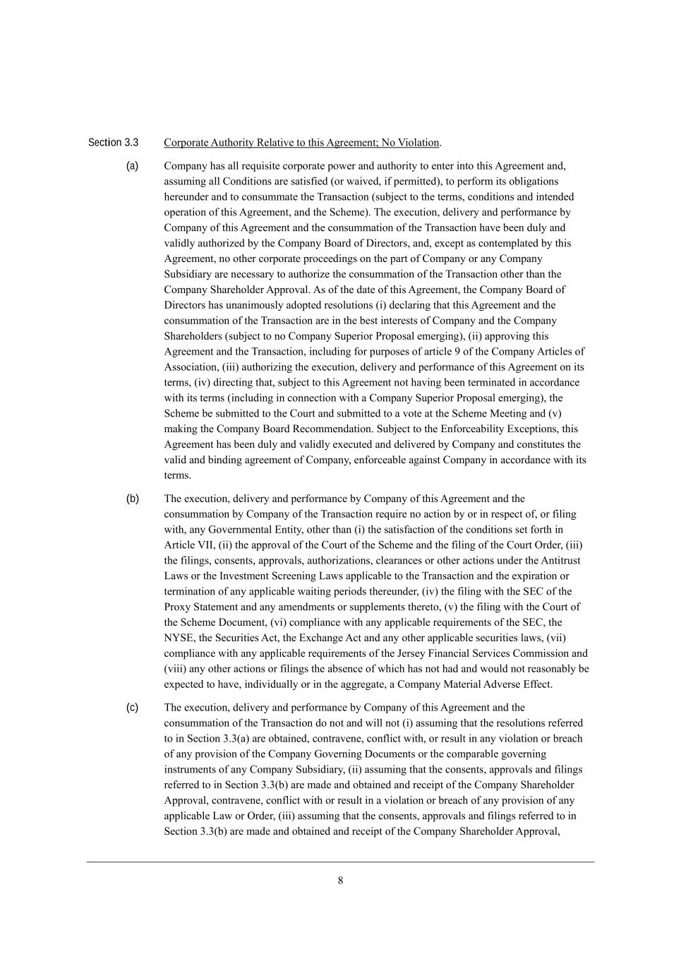 6 Section 3.3 =ehfehWj[ ;kj^eh_jo L[bWj_l[ je j^_i ;]h[[c[dj9 He P_ebWj_ed, (a) =ecfWdo ^Wi Wbb h[gk_i_j[ YehfehWj[ fem[h WdZ Wkj^eh_jo je [dj[h _dje j^_i ;]h[[c[dj WdZ* Wiikc_d] Wbb =edZ_j_edi Wh[ iWj_i\_[Z (eh mW_l[Z* _\ f[hc_jj[Z)* je f[h\ehc _ji eXb_]Wj_edi ^[h[kdZ[h WdZ je YedikccWj[ j^[ NhWdiWYj_ed (ikX`[Yj je j^[ j[hci* YedZ_j_edi WdZ _dj[dZ[Z ef[hWj_ed e\ j^_i ;]h[[c[dj* WdZ j^[ MY^[c[), N^[ [n[Ykj_ed* Z[b_l[ho WdZ f[h\ehcWdY[ Xo =ecfWdo e\ j^_i ;]h[[c[dj WdZ j^[ YedikccWj_ed e\ j^[ NhWdiWYj_ed ^Wl[ X[[d Zkbo WdZ lWb_Zbo Wkj^eh_p[Z Xo j^[ =ecfWdo <eWhZ e\ >_h[Yjehi* WdZ* [nY[fj Wi Yedj[cfbWj[Z Xo j^_i ;]h[[c[dj* de ej^[h YehfehWj[ fheY[[Z_d]i ed j^[ fWhj e\ =ecfWdo eh Wdo =ecfWdo MkXi_Z_Who Wh[ d[Y[iiWho je Wkj^eh_p[ j^[ YedikccWj_ed e\ j^[ NhWdiWYj_ed ej^[h j^Wd j^[ =ecfWdo M^Wh[^ebZ[h ;ffhelWb, ;i e\ j^[ ZWj[ e\ j^_i ;]h[[c[dj* j^[ =ecfWdo <eWhZ e\ >_h[Yjehi ^Wi kdWd_cekibo WZefj[Z h[iebkj_edi (_) Z[YbWh_d] j^Wj j^_i ;]h[[c[dj WdZ j^[ YedikccWj_ed e\ j^[ NhWdiWYj_ed Wh[ _d j^[ X[ij _dj[h[iji e\ =ecfWdo WdZ j^[ =ecfWdo M^Wh[^ebZ[hi (ikX`[Yj je de =ecfWdo Mkf[h_eh JhefeiWb [c[h]_d])* (__) Wffhel_d] j^_i ;]h[[c[dj WdZ j^[ NhWdiWYj_ed* _dYbkZ_d] \eh fkhfei[i e\ Whj_Yb[ 7 e\ j^[ =ecfWdo ;hj_Yb[i e\ ;iieY_Wj_ed* (___) Wkj^eh_p_d] j^[ [n[Ykj_ed* Z[b_l[ho WdZ f[h\ehcWdY[ e\ j^_i ;]h[[c[dj ed _ji j[hci* (_l) Z_h[Yj_d] j^Wj* ikX`[Yj je j^_i ;]h[[c[dj dej ^Wl_d] X[[d j[hc_dWj[Z _d WYYehZWdY[ m_j^ _ji j[hci (_dYbkZ_d] _d Yedd[Yj_ed m_j^ W =ecfWdo Mkf[h_eh JhefeiWb [c[h]_d])* j^[ MY^[c[ X[ ikXc_jj[Z je j^[ =ekhj WdZ ikXc_jj[Z je W lej[ Wj j^[ MY^[c[ G[[j_d] WdZ (l) cWa_d] j^[ =ecfWdo <eWhZ L[Yecc[dZWj_ed, MkX`[Yj je j^[ ?d\ehY[WX_b_jo ?nY[fj_edi* j^_i ;]h[[c[dj ^Wi X[[d Zkbo WdZ lWb_Zbo [n[Ykj[Z WdZ Z[b_l[h[Z Xo =ecfWdo WdZ Yedij_jkj[i j^[ lWb_Z WdZ X_dZ_d] W]h[[c[dj e\ =ecfWdo* [d\ehY[WXb[ W]W_dij =ecfWdo _d WYYehZWdY[ m_j^ _ji j[hci, (b) N^[ [n[Ykj_ed* Z[b_l[ho WdZ f[h\ehcWdY[ Xo =ecfWdo e\ j^_i ;]h[[c[dj WdZ j^[ YedikccWj_ed Xo =ecfWdo e\ j^[ NhWdiWYj_ed h[gk_h[ de WYj_ed Xo eh _d h[if[Yj e\* eh \_b_d] m_j^* Wdo Ael[hdc[djWb ?dj_jo* ej^[h j^Wd (_) j^[ iWj_i\WYj_ed e\ j^[ YedZ_j_edi i[j \ehj^ _d ;hj_Yb[ PCC* (__) j^[ WffhelWb e\ j^[ =ekhj e\ j^[ MY^[c[ WdZ j^[ \_b_d] e\ j^[ =ekhj IhZ[h* (___) j^[ \_b_d]i* Yedi[dji* WffhelWbi* Wkj^eh_pWj_edi* Yb[WhWdY[i eh ej^[h WYj_edi kdZ[h j^[ ;dj_jhkij FWmi eh j^[ Cdl[ijc[dj MYh[[d_d] FWmi Wffb_YWXb[ je j^[ NhWdiWYj_ed WdZ j^[ [nf_hWj_ed eh j[hc_dWj_ed e\ Wdo Wffb_YWXb[ mW_j_d] f[h_eZi j^[h[kdZ[h* (_l) j^[ \_b_d] m_j^ j^[ M?= e\ j^[ Jheno MjWj[c[dj WdZ Wdo Wc[dZc[dji eh ikffb[c[dji j^[h[je* (l) j^[ \_b_d] m_j^ j^[ =ekhj e\ j^[ MY^[c[ >eYkc[dj* (l_) Yecfb_WdY[ m_j^ Wdo Wffb_YWXb[ h[gk_h[c[dji e\ j^[ M?=* j^[ HSM?* j^[ M[Ykh_j_[i ;Yj* j^[ ?nY^Wd][ ;Yj WdZ Wdo ej^[h Wffb_YWXb[ i[Ykh_j_[i bWmi* (l__) Yecfb_WdY[ m_j^ Wdo Wffb_YWXb[ h[gk_h[c[dji e\ j^[ D[hi[o @_dWdY_Wb M[hl_Y[i =ecc_ii_ed WdZ (l___) Wdo ej^[h WYj_edi eh \_b_d]i j^[ WXi[dY[ e\ m^_Y^ ^Wi dej ^WZ WdZ mekbZ dej h[WiedWXbo X[ [nf[Yj[Z je ^Wl[* _dZ_l_ZkWbbo eh _d j^[ W]]h[]Wj[* W =ecfWdo GWj[h_Wb ;Zl[hi[ ?\\[Yj, (c) N^[ [n[Ykj_ed* Z[b_l[ho WdZ f[h\ehcWdY[ Xo =ecfWdo e\ j^_i ;]h[[c[dj WdZ j^[ YedikccWj_ed e\ j^[ NhWdiWYj_ed Ze dej WdZ m_bb dej (_) Wiikc_d] j^Wj j^[ h[iebkj_edi h[\[hh[Z je _d M[Yj_ed 1,1(W) Wh[ eXjW_d[Z* YedjhWl[d[* Yed\b_Yj m_j^* eh h[ikbj _d Wdo l_ebWj_ed eh Xh[WY^ e\ Wdo fhel_i_ed e\ j^[ =ecfWdo Ael[hd_d] >eYkc[dji eh j^[ YecfWhWXb[ ]el[hd_d] _dijhkc[dji e\ Wdo =ecfWdo MkXi_Z_Who* (__) Wiikc_d] j^Wj j^[ Yedi[dji* WffhelWbi WdZ \_b_d]i h[\[hh[Z je _d M[Yj_ed 1,1(X) Wh[ cWZ[ WdZ eXjW_d[Z WdZ h[Y[_fj e\ j^[ =ecfWdo M^Wh[^ebZ[h ;ffhelWb* YedjhWl[d[* Yed\b_Yj m_j^ eh h[ikbj _d W l_ebWj_ed eh Xh[WY^ e\ Wdo fhel_i_ed e\ Wdo Wffb_YWXb[ FWm eh IhZ[h* (___) Wiikc_d] j^Wj j^[ Yedi[dji* WffhelWbi WdZ \_b_d]i h[\[hh[Z je _d M[Yj_ed 1,1(X) Wh[ cWZ[ WdZ eXjW_d[Z WdZ h[Y[_fj e\ j^[ =ecfWdo M^Wh[^ebZ[h ;ffhelWb*