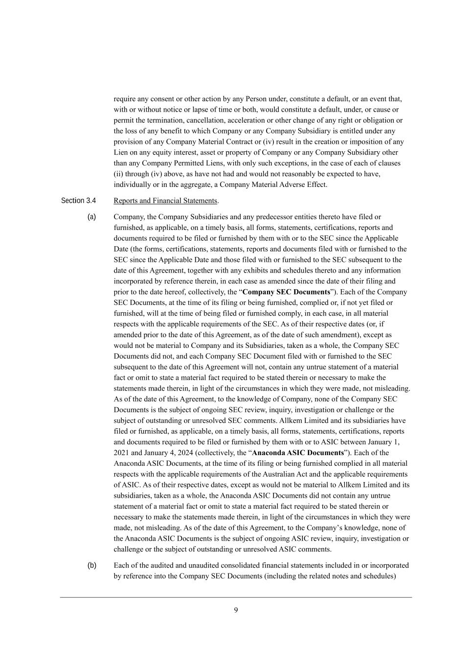 7 h[gk_h[ Wdo Yedi[dj eh ej^[h WYj_ed Xo Wdo J[hied kdZ[h* Yedij_jkj[ W Z[\Wkbj* eh Wd [l[dj j^Wj* m_j^ eh m_j^ekj dej_Y[ eh bWfi[ e\ j_c[ eh Xej^* mekbZ Yedij_jkj[ W Z[\Wkbj* kdZ[h* eh YWki[ eh f[hc_j j^[ j[hc_dWj_ed* YWdY[bbWj_ed* WYY[b[hWj_ed eh ej^[h Y^Wd][ e\ Wdo h_]^j eh eXb_]Wj_ed eh j^[ beii e\ Wdo X[d[\_j je m^_Y^ =ecfWdo eh Wdo =ecfWdo MkXi_Z_Who _i [dj_jb[Z kdZ[h Wdo fhel_i_ed e\ Wdo =ecfWdo GWj[h_Wb =edjhWYj eh (_l) h[ikbj _d j^[ Yh[Wj_ed eh _cfei_j_ed e\ Wdo F_[d ed Wdo [gk_jo _dj[h[ij* Wii[j eh fhef[hjo e\ =ecfWdo eh Wdo =ecfWdo MkXi_Z_Who ej^[h j^Wd Wdo =ecfWdo J[hc_jj[Z F_[di* m_j^ edbo ikY^ [nY[fj_edi* _d j^[ YWi[ e\ [WY^ e\ YbWki[i (__) j^hek]^ (_l) WXel[* Wi ^Wl[ dej ^WZ WdZ mekbZ dej h[WiedWXbo X[ [nf[Yj[Z je ^Wl[* _dZ_l_ZkWbbo eh _d j^[ W]]h[]Wj[* W =ecfWdo GWj[h_Wb ;Zl[hi[ ?\\[Yj, Section 3.4 L[fehji WdZ @_dWdY_Wb MjWj[c[dji, (a) =ecfWdo* j^[ =ecfWdo MkXi_Z_Wh_[i WdZ Wdo fh[Z[Y[iieh [dj_j_[i j^[h[je ^Wl[ \_b[Z eh \khd_i^[Z* Wi Wffb_YWXb[* ed W j_c[bo XWi_i* Wbb \ehci* ijWj[c[dji* Y[hj_\_YWj_edi* h[fehji WdZ ZeYkc[dji h[gk_h[Z je X[ \_b[Z eh \khd_i^[Z Xo j^[c m_j^ eh je j^[ M?= i_dY[ j^[ ;ffb_YWXb[ >Wj[ (j^[ \ehci* Y[hj_\_YWj_edi* ijWj[c[dji* h[fehji WdZ ZeYkc[dji \_b[Z m_j^ eh \khd_i^[Z je j^[ M?= i_dY[ j^[ ;ffb_YWXb[ >Wj[ WdZ j^ei[ \_b[Z m_j^ eh \khd_i^[Z je j^[ M?= ikXi[gk[dj je j^[ ZWj[ e\ j^_i ;]h[[c[dj* je][j^[h m_j^ Wdo [n^_X_ji WdZ iY^[Zkb[i j^[h[je WdZ Wdo _d\ehcWj_ed _dYehfehWj[Z Xo h[\[h[dY[ j^[h[_d* _d [WY^ YWi[ Wi Wc[dZ[Z i_dY[ j^[ ZWj[ e\ j^[_h \_b_d] WdZ fh_eh je j^[ ZWj[ ^[h[e\* Yebb[Yj_l[bo* j^[ rCompany SEC Documentss), ?WY^ e\ j^[ =ecfWdo M?= >eYkc[dji* Wj j^[ j_c[ e\ _ji \_b_d] eh X[_d] \khd_i^[Z* Yecfb_[Z eh* _\ dej o[j \_b[Z eh \khd_i^[Z* m_bb Wj j^[ j_c[ e\ X[_d] \_b[Z eh \khd_i^[Z Yecfbo* _d [WY^ YWi[* _d Wbb cWj[h_Wb h[if[Yji m_j^ j^[ Wffb_YWXb[ h[gk_h[c[dji e\ j^[ M?=, ;i e\ j^[_h h[if[Yj_l[ ZWj[i (eh* _\ Wc[dZ[Z fh_eh je j^[ ZWj[ e\ j^_i ;]h[[c[dj* Wi e\ j^[ ZWj[ e\ ikY^ Wc[dZc[dj)* [nY[fj Wi mekbZ dej X[ cWj[h_Wb je =ecfWdo WdZ _ji MkXi_Z_Wh_[i* jWa[d Wi W m^eb[* j^[ =ecfWdo M?= >eYkc[dji Z_Z dej* WdZ [WY^ =ecfWdo M?= >eYkc[dj \_b[Z m_j^ eh \khd_i^[Z je j^[ M?= ikXi[gk[dj je j^[ ZWj[ e\ j^_i ;]h[[c[dj m_bb dej* YedjW_d Wdo kdjhk[ ijWj[c[dj e\ W cWj[h_Wb \WYj eh ec_j je ijWj[ W cWj[h_Wb \WYj h[gk_h[Z je X[ ijWj[Z j^[h[_d eh d[Y[iiWho je cWa[ j^[ ijWj[c[dji cWZ[ j^[h[_d* _d b_]^j e\ j^[ Y_hYkcijWdY[i _d m^_Y^ j^[o m[h[ cWZ[* dej c_ib[WZ_d], ;i e\ j^[ ZWj[ e\ j^_i ;]h[[c[dj* je j^[ ademb[Z][ e\ =ecfWdo* ded[ e\ j^[ =ecfWdo M?= >eYkc[dji _i j^[ ikX`[Yj e\ ed]e_d] M?= h[l_[m* _dgk_ho* _dl[ij_]Wj_ed eh Y^Wbb[d][ eh j^[ ikX`[Yj e\ ekjijWdZ_d] eh kdh[iebl[Z M?= Yecc[dji, ;bba[c F_c_j[Z WdZ _ji ikXi_Z_Wh_[i ^Wl[ \_b[Z eh \khd_i^[Z* Wi Wffb_YWXb[* ed W j_c[bo XWi_i* Wbb \ehci* ijWj[c[dji* Y[hj_\_YWj_edi* h[fehji WdZ ZeYkc[dji h[gk_h[Z je X[ \_b[Z eh \khd_i^[Z Xo j^[c m_j^ eh je ;MC= X[jm[[d DWdkWho /* 0.0/ WdZ DWdkWho 2* 0.02 (Yebb[Yj_l[bo* j^[ rAnaconda ASIC Documentss), ?WY^ e\ j^[ ;dWYedZW ;MC= >eYkc[dji* Wj j^[ j_c[ e\ _ji \_b_d] eh X[_d] \khd_i^[Z Yecfb_[Z _d Wbb cWj[h_Wb h[if[Yji m_j^ j^[ Wffb_YWXb[ h[gk_h[c[dji e\ j^[ ;kijhWb_Wd ;Yj WdZ j^[ Wffb_YWXb[ h[gk_h[c[dji e\ ;MC=, ;i e\ j^[_h h[if[Yj_l[ ZWj[i* [nY[fj Wi mekbZ dej X[ cWj[h_Wb je ;bba[c F_c_j[Z WdZ _ji ikXi_Z_Wh_[i* jWa[d Wi W m^eb[* j^[ ;dWYedZW ;MC= >eYkc[dji Z_Z dej YedjW_d Wdo kdjhk[ ijWj[c[dj e\ W cWj[h_Wb \WYj eh ec_j je ijWj[ W cWj[h_Wb \WYj h[gk_h[Z je X[ ijWj[Z j^[h[_d eh d[Y[iiWho je cWa[ j^[ ijWj[c[dji cWZ[ j^[h[_d* _d b_]^j e\ j^[ Y_hYkcijWdY[i _d m^_Y^ j^[o m[h[ cWZ[* dej c_ib[WZ_d], ;i e\ j^[ ZWj[ e\ j^_i ;]h[[c[dj* je j^[ =ecfWdoui ademb[Z][* ded[ e\ j^[ ;dWYedZW ;MC= >eYkc[dji _i j^[ ikX`[Yj e\ ed]e_d] ;MC= h[l_[m* _dgk_ho* _dl[ij_]Wj_ed eh Y^Wbb[d][ eh j^[ ikX`[Yj e\ ekjijWdZ_d] eh kdh[iebl[Z ;MC= Yecc[dji, (b) ?WY^ e\ j^[ WkZ_j[Z WdZ kdWkZ_j[Z Yedieb_ZWj[Z \_dWdY_Wb ijWj[c[dji _dYbkZ[Z _d eh _dYehfehWj[Z Xo h[\[h[dY[ _dje j^[ =ecfWdo M?= >eYkc[dji (_dYbkZ_d] j^[ h[bWj[Z dej[i WdZ iY^[Zkb[i)