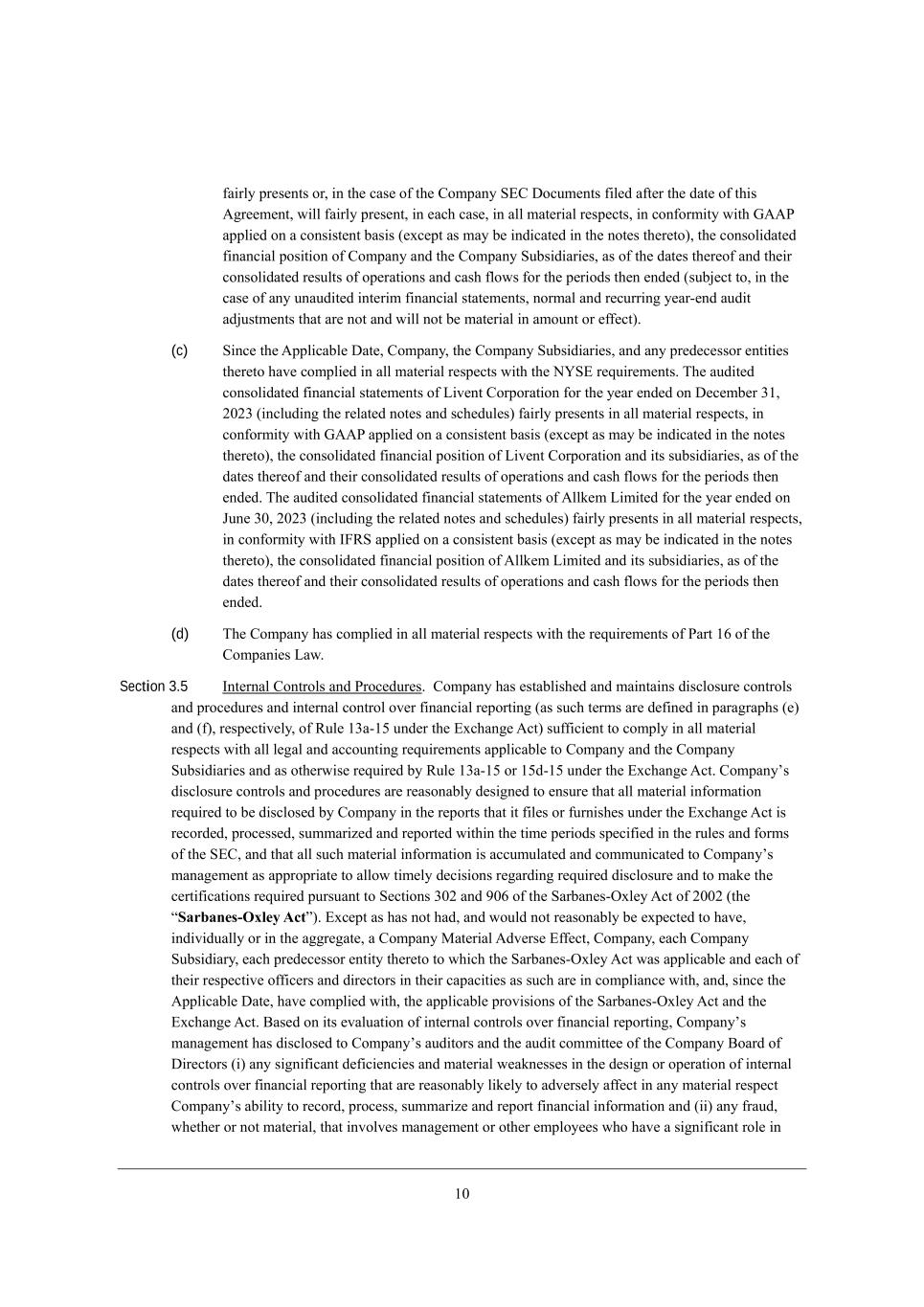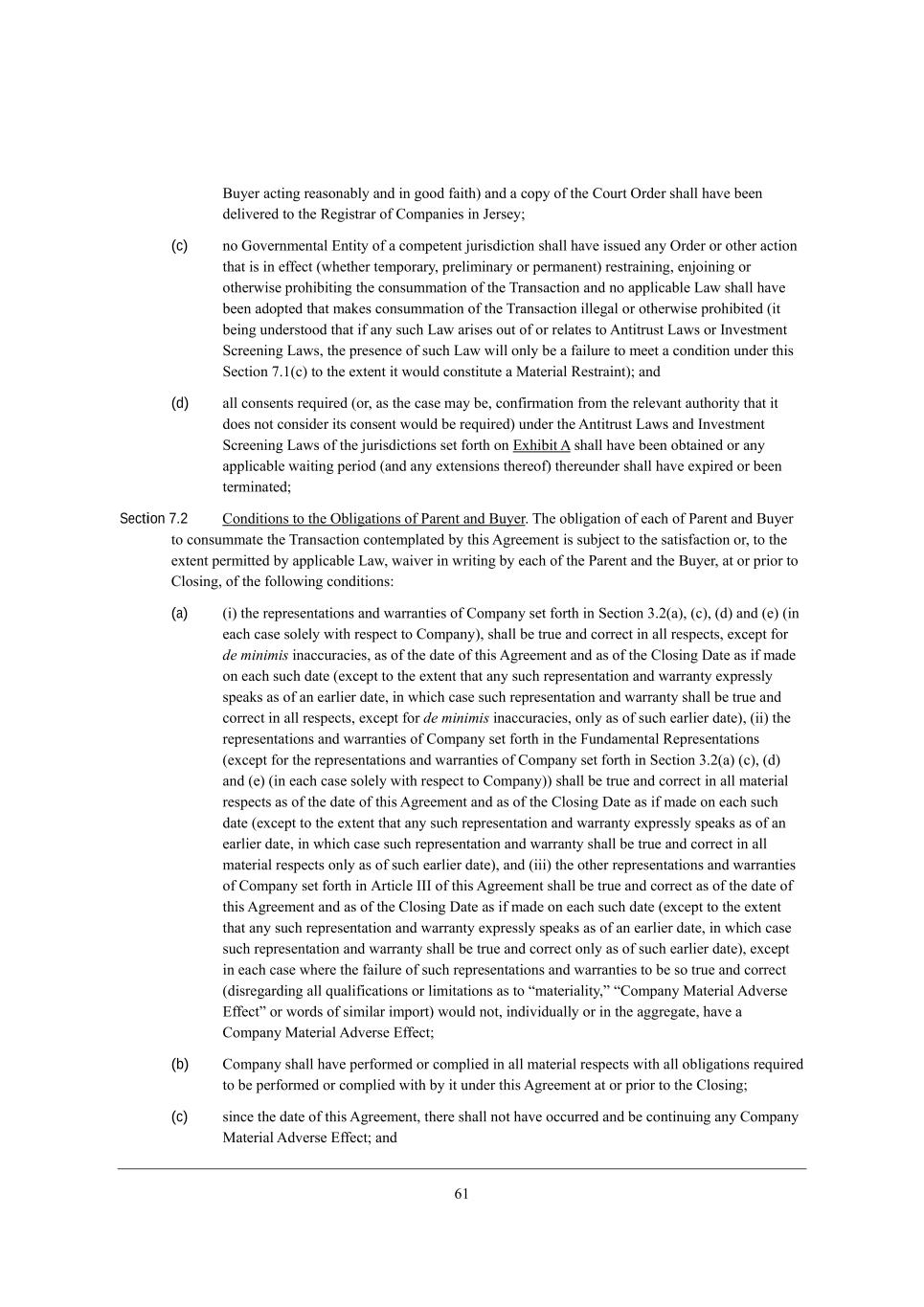 4/ <ko[h WYj_d] h[WiedWXbo WdZ _d ]eeZ \W_j^) WdZ W Yefo e\ j^[ =ekhj IhZ[h i^Wbb ^Wl[ X[[d Z[b_l[h[Z je j^[ L[]_ijhWh e\ =ecfWd_[i _d D[hi[o9 (c) de Ael[hdc[djWb ?dj_jo e\ W Yecf[j[dj `kh_iZ_Yj_ed i^Wbb ^Wl[ _iik[Z Wdo IhZ[h eh ej^[h WYj_ed j^Wj _i _d [\\[Yj (m^[j^[h j[cfehWho* fh[b_c_dWho eh f[hcWd[dj) h[ijhW_d_d]* [d`e_d_d] eh ej^[hm_i[ fhe^_X_j_d] j^[ YedikccWj_ed e\ j^[ NhWdiWYj_ed WdZ de Wffb_YWXb[ FWm i^Wbb ^Wl[ X[[d WZefj[Z j^Wj cWa[i YedikccWj_ed e\ j^[ NhWdiWYj_ed _bb[]Wb eh ej^[hm_i[ fhe^_X_j[Z (_j X[_d] kdZ[hijeeZ j^Wj _\ Wdo ikY^ FWm Wh_i[i ekj e\ eh h[bWj[i je ;dj_jhkij FWmi eh Cdl[ijc[dj MYh[[d_d] FWmi* j^[ fh[i[dY[ e\ ikY^ FWm m_bb edbo X[ W \W_bkh[ je c[[j W YedZ_j_ed kdZ[h j^_i M[Yj_ed 5,/(Y) je j^[ [nj[dj _j mekbZ Yedij_jkj[ W GWj[h_Wb L[ijhW_dj)9 WdZ (d) Wbb Yedi[dji h[gk_h[Z (eh* Wi j^[ YWi[ cWo X[* Yed\_hcWj_ed \hec j^[ h[b[lWdj Wkj^eh_jo j^Wj _j Ze[i dej Yedi_Z[h _ji Yedi[dj mekbZ X[ h[gk_h[Z) kdZ[h j^[ ;dj_jhkij FWmi WdZ Cdl[ijc[dj MYh[[d_d] FWmi e\ j^[ `kh_iZ_Yj_edi i[j \ehj^ ed ?n^_X_j ; i^Wbb ^Wl[ X[[d eXjW_d[Z eh Wdo Wffb_YWXb[ mW_j_d] f[h_eZ (WdZ Wdo [nj[di_edi j^[h[e\) j^[h[kdZ[h i^Wbb ^Wl[ [nf_h[Z eh X[[d j[hc_dWj[Z9 Section 7.2 =edZ_j_edi je j^[ IXb_]Wj_edi e\ JWh[dj WdZ <ko[h, N^[ eXb_]Wj_ed e\ [WY^ e\ JWh[dj WdZ <ko[h je YedikccWj[ j^[ NhWdiWYj_ed Yedj[cfbWj[Z Xo j^_i ;]h[[c[dj _i ikX`[Yj je j^[ iWj_i\WYj_ed eh* je j^[ [nj[dj f[hc_jj[Z Xo Wffb_YWXb[ FWm* mW_l[h _d mh_j_d] Xo [WY^ e\ j^[ JWh[dj WdZ j^[ <ko[h* Wj eh fh_eh je =bei_d]* e\ j^[ \ebbem_d] YedZ_j_edi8 (a) (_) j^[ h[fh[i[djWj_edi WdZ mWhhWdj_[i e\ =ecfWdo i[j \ehj^ _d M[Yj_ed 1,0(W)* (Y)* (Z) WdZ ([) (_d [WY^ YWi[ ieb[bo m_j^ h[if[Yj je =ecfWdo)* i^Wbb X[ jhk[ WdZ Yehh[Yj _d Wbb h[if[Yji* [nY[fj \eh de minimis _dWYYkhWY_[i* Wi e\ j^[ ZWj[ e\ j^_i ;]h[[c[dj WdZ Wi e\ j^[ =bei_d] >Wj[ Wi _\ cWZ[ ed [WY^ ikY^ ZWj[ ([nY[fj je j^[ [nj[dj j^Wj Wdo ikY^ h[fh[i[djWj_ed WdZ mWhhWdjo [nfh[iibo if[Wai Wi e\ Wd [Whb_[h ZWj[* _d m^_Y^ YWi[ ikY^ h[fh[i[djWj_ed WdZ mWhhWdjo i^Wbb X[ jhk[ WdZ Yehh[Yj _d Wbb h[if[Yji* [nY[fj \eh de minimis _dWYYkhWY_[i* edbo Wi e\ ikY^ [Whb_[h ZWj[)* (__) j^[ h[fh[i[djWj_edi WdZ mWhhWdj_[i e\ =ecfWdo i[j \ehj^ _d j^[ @kdZWc[djWb L[fh[i[djWj_edi ([nY[fj \eh j^[ h[fh[i[djWj_edi WdZ mWhhWdj_[i e\ =ecfWdo i[j \ehj^ _d M[Yj_ed 1,0(W) (Y)* (Z) WdZ ([) (_d [WY^ YWi[ ieb[bo m_j^ h[if[Yj je =ecfWdo)) i^Wbb X[ jhk[ WdZ Yehh[Yj _d Wbb cWj[h_Wb h[if[Yji Wi e\ j^[ ZWj[ e\ j^_i ;]h[[c[dj WdZ Wi e\ j^[ =bei_d] >Wj[ Wi _\ cWZ[ ed [WY^ ikY^ ZWj[ ([nY[fj je j^[ [nj[dj j^Wj Wdo ikY^ h[fh[i[djWj_ed WdZ mWhhWdjo [nfh[iibo if[Wai Wi e\ Wd [Whb_[h ZWj[* _d m^_Y^ YWi[ ikY^ h[fh[i[djWj_ed WdZ mWhhWdjo i^Wbb X[ jhk[ WdZ Yehh[Yj _d Wbb cWj[h_Wb h[if[Yji edbo Wi e\ ikY^ [Whb_[h ZWj[)* WdZ (___) j^[ ej^[h h[fh[i[djWj_edi WdZ mWhhWdj_[i e\ =ecfWdo i[j \ehj^ _d ;hj_Yb[ CCC e\ j^_i ;]h[[c[dj i^Wbb X[ jhk[ WdZ Yehh[Yj Wi e\ j^[ ZWj[ e\ j^_i ;]h[[c[dj WdZ Wi e\ j^[ =bei_d] >Wj[ Wi _\ cWZ[ ed [WY^ ikY^ ZWj[ ([nY[fj je j^[ [nj[dj j^Wj Wdo ikY^ h[fh[i[djWj_ed WdZ mWhhWdjo [nfh[iibo if[Wai Wi e\ Wd [Whb_[h ZWj[* _d m^_Y^ YWi[ ikY^ h[fh[i[djWj_ed WdZ mWhhWdjo i^Wbb X[ jhk[ WdZ Yehh[Yj edbo Wi e\ ikY^ [Whb_[h ZWj[)* [nY[fj _d [WY^ YWi[ m^[h[ j^[ \W_bkh[ e\ ikY^ h[fh[i[djWj_edi WdZ mWhhWdj_[i je X[ ie jhk[ WdZ Yehh[Yj (Z_ih[]WhZ_d] Wbb gkWb_\_YWj_edi eh b_c_jWj_edi Wi je rcWj[h_Wb_jo*s r=ecfWdo GWj[h_Wb ;Zl[hi[ ?\\[Yjs eh mehZi e\ i_c_bWh _cfehj) mekbZ dej* _dZ_l_ZkWbbo eh _d j^[ W]]h[]Wj[* ^Wl[ W =ecfWdo GWj[h_Wb ;Zl[hi[ ?\\[Yj9 (b) =ecfWdo i^Wbb ^Wl[ f[h\ehc[Z eh Yecfb_[Z _d Wbb cWj[h_Wb h[if[Yji m_j^ Wbb eXb_]Wj_edi h[gk_h[Z je X[ f[h\ehc[Z eh Yecfb_[Z m_j^ Xo _j kdZ[h j^_i ;]h[[c[dj Wj eh fh_eh je j^[ =bei_d]9 (c) i_dY[ j^[ ZWj[ e\ j^_i ;]h[[c[dj* j^[h[ i^Wbb dej ^Wl[ eYYkhh[Z WdZ X[ Yedj_dk_d] Wdo =ecfWdo GWj[h_Wb ;Zl[hi[ ?\\[Yj9 WdZ