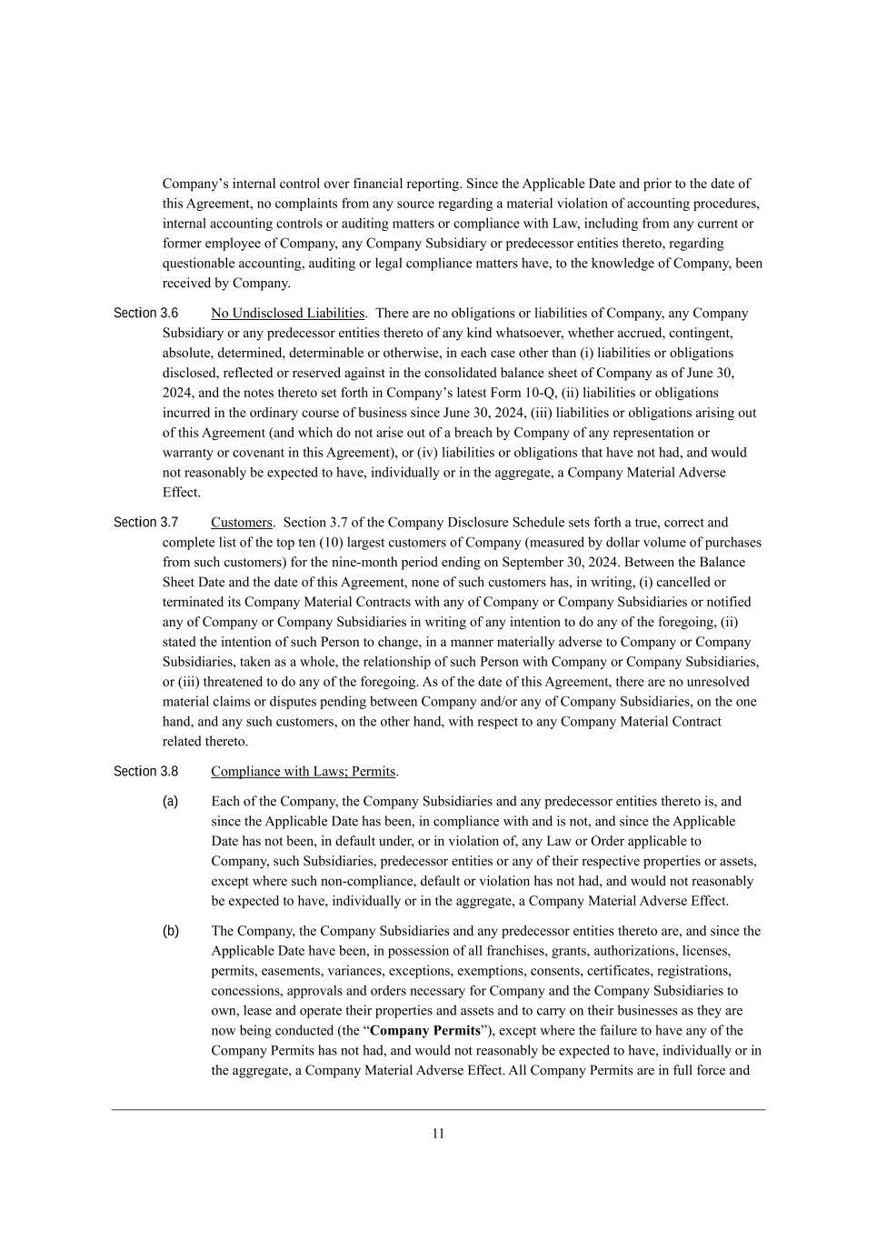 // =ecfWdoui _dj[hdWb Yedjheb el[h \_dWdY_Wb h[fehj_d], M_dY[ j^[ ;ffb_YWXb[ >Wj[ WdZ fh_eh je j^[ ZWj[ e\ j^_i ;]h[[c[dj* de YecfbW_dji \hec Wdo iekhY[ h[]WhZ_d] W cWj[h_Wb l_ebWj_ed e\ WYYekdj_d] fheY[Zkh[i* _dj[hdWb WYYekdj_d] Yedjhebi eh WkZ_j_d] cWjj[hi eh Yecfb_WdY[ m_j^ FWm* _dYbkZ_d] \hec Wdo Ykhh[dj eh \ehc[h [cfbeo[[ e\ =ecfWdo* Wdo =ecfWdo MkXi_Z_Who eh fh[Z[Y[iieh [dj_j_[i j^[h[je* h[]WhZ_d] gk[ij_edWXb[ WYYekdj_d]* WkZ_j_d] eh b[]Wb Yecfb_WdY[ cWjj[hi ^Wl[* je j^[ ademb[Z][ e\ =ecfWdo* X[[d h[Y[_l[Z Xo =ecfWdo, Section 3.6 He OdZ_iYbei[Z F_WX_b_j_[i, N^[h[ Wh[ de eXb_]Wj_edi eh b_WX_b_j_[i e\ =ecfWdo* Wdo =ecfWdo MkXi_Z_Who eh Wdo fh[Z[Y[iieh [dj_j_[i j^[h[je e\ Wdo a_dZ m^Wjie[l[h* m^[j^[h WYYhk[Z* Yedj_d][dj* WXiebkj[* Z[j[hc_d[Z* Z[j[hc_dWXb[ eh ej^[hm_i[* _d [WY^ YWi[ ej^[h j^Wd (_) b_WX_b_j_[i eh eXb_]Wj_edi Z_iYbei[Z* h[\b[Yj[Z eh h[i[hl[Z W]W_dij _d j^[ Yedieb_ZWj[Z XWbWdY[ i^[[j e\ =ecfWdo Wi e\ Dkd[ 1.* 0.02* WdZ j^[ dej[i j^[h[je i[j \ehj^ _d =ecfWdoui bWj[ij @ehc /.+K* (__) b_WX_b_j_[i eh eXb_]Wj_edi _dYkhh[Z _d j^[ ehZ_dWho Yekhi[ e\ Xki_d[ii i_dY[ Dkd[ 1.* 0.02* (___) b_WX_b_j_[i eh eXb_]Wj_edi Wh_i_d] ekj e\ j^_i ;]h[[c[dj (WdZ m^_Y^ Ze dej Wh_i[ ekj e\ W Xh[WY^ Xo =ecfWdo e\ Wdo h[fh[i[djWj_ed eh mWhhWdjo eh Yel[dWdj _d j^_i ;]h[[c[dj)* eh (_l) b_WX_b_j_[i eh eXb_]Wj_edi j^Wj ^Wl[ dej ^WZ* WdZ mekbZ dej h[WiedWXbo X[ [nf[Yj[Z je ^Wl[* _dZ_l_ZkWbbo eh _d j^[ W]]h[]Wj[* W =ecfWdo GWj[h_Wb ;Zl[hi[ ?\\[Yj, Section 3.7 =kijec[hi, M[Yj_ed 1,5 e\ j^[ =ecfWdo >_iYbeikh[ MY^[Zkb[ i[ji \ehj^ W jhk[* Yehh[Yj WdZ Yecfb[j[ b_ij e\ j^[ jef j[d (/.) bWh][ij Ykijec[hi e\ =ecfWdo (c[Wikh[Z Xo ZebbWh lebkc[ e\ fkhY^Wi[i \hec ikY^ Ykijec[hi) \eh j^[ d_d[+cedj^ f[h_eZ [dZ_d] ed M[fj[cX[h 1.* 0.02, <[jm[[d j^[ <WbWdY[ M^[[j >Wj[ WdZ j^[ ZWj[ e\ j^_i ;]h[[c[dj* ded[ e\ ikY^ Ykijec[hi ^Wi* _d mh_j_d]* (_) YWdY[bb[Z eh j[hc_dWj[Z _ji =ecfWdo GWj[h_Wb =edjhWYji m_j^ Wdo e\ =ecfWdo eh =ecfWdo MkXi_Z_Wh_[i eh dej_\_[Z Wdo e\ =ecfWdo eh =ecfWdo MkXi_Z_Wh_[i _d mh_j_d] e\ Wdo _dj[dj_ed je Ze Wdo e\ j^[ \eh[]e_d]* (__) ijWj[Z j^[ _dj[dj_ed e\ ikY^ J[hied je Y^Wd][* _d W cWdd[h cWj[h_Wbbo WZl[hi[ je =ecfWdo eh =ecfWdo MkXi_Z_Wh_[i* jWa[d Wi W m^eb[* j^[ h[bWj_edi^_f e\ ikY^ J[hied m_j^ =ecfWdo eh =ecfWdo MkXi_Z_Wh_[i* eh (___) j^h[Wj[d[Z je Ze Wdo e\ j^[ \eh[]e_d], ;i e\ j^[ ZWj[ e\ j^_i ;]h[[c[dj* j^[h[ Wh[ de kdh[iebl[Z cWj[h_Wb YbW_ci eh Z_ifkj[i f[dZ_d] X[jm[[d =ecfWdo WdZ-eh Wdo e\ =ecfWdo MkXi_Z_Wh_[i* ed j^[ ed[ ^WdZ* WdZ Wdo ikY^ Ykijec[hi* ed j^[ ej^[h ^WdZ* m_j^ h[if[Yj je Wdo =ecfWdo GWj[h_Wb =edjhWYj h[bWj[Z j^[h[je, Section 3.8 =ecfb_WdY[ m_j^ FWmi9 J[hc_ji, (a) ?WY^ e\ j^[ =ecfWdo* j^[ =ecfWdo MkXi_Z_Wh_[i WdZ Wdo fh[Z[Y[iieh [dj_j_[i j^[h[je _i* WdZ i_dY[ j^[ ;ffb_YWXb[ >Wj[ ^Wi X[[d* _d Yecfb_WdY[ m_j^ WdZ _i dej* WdZ i_dY[ j^[ ;ffb_YWXb[ >Wj[ ^Wi dej X[[d* _d Z[\Wkbj kdZ[h* eh _d l_ebWj_ed e\* Wdo FWm eh IhZ[h Wffb_YWXb[ je =ecfWdo* ikY^ MkXi_Z_Wh_[i* fh[Z[Y[iieh [dj_j_[i eh Wdo e\ j^[_h h[if[Yj_l[ fhef[hj_[i eh Wii[ji* [nY[fj m^[h[ ikY^ ded+Yecfb_WdY[* Z[\Wkbj eh l_ebWj_ed ^Wi dej ^WZ* WdZ mekbZ dej h[WiedWXbo X[ [nf[Yj[Z je ^Wl[* _dZ_l_ZkWbbo eh _d j^[ W]]h[]Wj[* W =ecfWdo GWj[h_Wb ;Zl[hi[ ?\\[Yj, (b) N^[ =ecfWdo* j^[ =ecfWdo MkXi_Z_Wh_[i WdZ Wdo fh[Z[Y[iieh [dj_j_[i j^[h[je Wh[* WdZ i_dY[ j^[ ;ffb_YWXb[ >Wj[ ^Wl[ X[[d* _d feii[ii_ed e\ Wbb \hWdY^_i[i* ]hWdji* Wkj^eh_pWj_edi* b_Y[di[i* f[hc_ji* [Wi[c[dji* lWh_WdY[i* [nY[fj_edi* [n[cfj_edi* Yedi[dji* Y[hj_\_YWj[i* h[]_ijhWj_edi* YedY[ii_edi* WffhelWbi WdZ ehZ[hi d[Y[iiWho \eh =ecfWdo WdZ j^[ =ecfWdo MkXi_Z_Wh_[i je emd* b[Wi[ WdZ ef[hWj[ j^[_h fhef[hj_[i WdZ Wii[ji WdZ je YWhho ed j^[_h Xki_d[ii[i Wi j^[o Wh[ dem X[_d] YedZkYj[Z (j^[ rCompany Permitss)* [nY[fj m^[h[ j^[ \W_bkh[ je ^Wl[ Wdo e\ j^[ =ecfWdo J[hc_ji ^Wi dej ^WZ* WdZ mekbZ dej h[WiedWXbo X[ [nf[Yj[Z je ^Wl[* _dZ_l_ZkWbbo eh _d j^[ W]]h[]Wj[* W =ecfWdo GWj[h_Wb ;Zl[hi[ ?\\[Yj, ;bb =ecfWdo J[hc_ji Wh[ _d \kbb \ehY[ WdZ