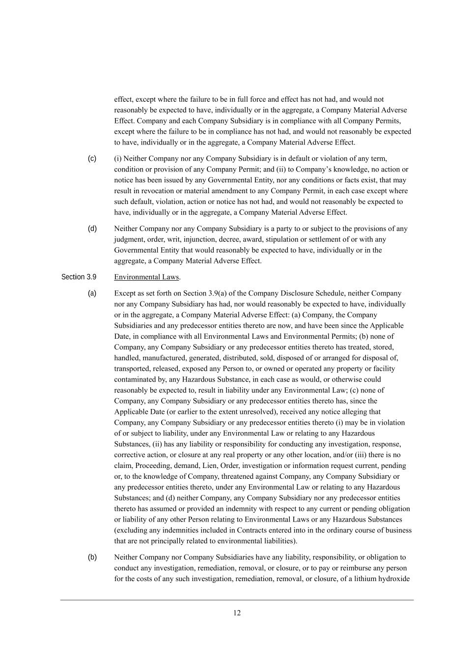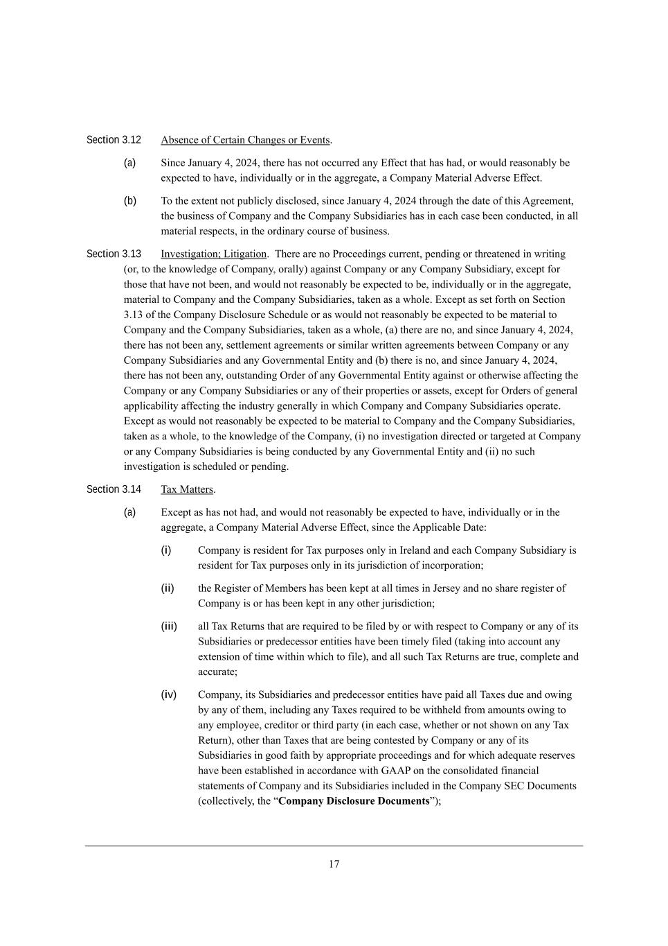 /5 Section 3.12 ;Xi[dY[ e\ =[hjW_d =^Wd][i eh ?l[dji, (a) M_dY[ DWdkWho 2* 0.02* j^[h[ ^Wi dej eYYkhh[Z Wdo ?\\[Yj j^Wj ^Wi ^WZ* eh mekbZ h[WiedWXbo X[ [nf[Yj[Z je ^Wl[* _dZ_l_ZkWbbo eh _d j^[ W]]h[]Wj[* W =ecfWdo GWj[h_Wb ;Zl[hi[ ?\\[Yj, (b) Ne j^[ [nj[dj dej fkXb_Ybo Z_iYbei[Z* i_dY[ DWdkWho 2* 0.02 j^hek]^ j^[ ZWj[ e\ j^_i ;]h[[c[dj* j^[ Xki_d[ii e\ =ecfWdo WdZ j^[ =ecfWdo MkXi_Z_Wh_[i ^Wi _d [WY^ YWi[ X[[d YedZkYj[Z* _d Wbb cWj[h_Wb h[if[Yji* _d j^[ ehZ_dWho Yekhi[ e\ Xki_d[ii, Section 3.13 Cdl[ij_]Wj_ed9 F_j_]Wj_ed, N^[h[ Wh[ de JheY[[Z_d]i Ykhh[dj* f[dZ_d] eh j^h[Wj[d[Z _d mh_j_d] (eh* je j^[ ademb[Z][ e\ =ecfWdo* ehWbbo) W]W_dij =ecfWdo eh Wdo =ecfWdo MkXi_Z_Who* [nY[fj \eh j^ei[ j^Wj ^Wl[ dej X[[d* WdZ mekbZ dej h[WiedWXbo X[ [nf[Yj[Z je X[* _dZ_l_ZkWbbo eh _d j^[ W]]h[]Wj[* cWj[h_Wb je =ecfWdo WdZ j^[ =ecfWdo MkXi_Z_Wh_[i* jWa[d Wi W m^eb[, ?nY[fj Wi i[j \ehj^ ed M[Yj_ed 1,/1 e\ j^[ =ecfWdo >_iYbeikh[ MY^[Zkb[ eh Wi mekbZ dej h[WiedWXbo X[ [nf[Yj[Z je X[ cWj[h_Wb je =ecfWdo WdZ j^[ =ecfWdo MkXi_Z_Wh_[i* jWa[d Wi W m^eb[* (W) j^[h[ Wh[ de* WdZ i_dY[ DWdkWho 2* 0.02* j^[h[ ^Wi dej X[[d Wdo* i[jjb[c[dj W]h[[c[dji eh i_c_bWh mh_jj[d W]h[[c[dji X[jm[[d =ecfWdo eh Wdo =ecfWdo MkXi_Z_Wh_[i WdZ Wdo Ael[hdc[djWb ?dj_jo WdZ (X) j^[h[ _i de* WdZ i_dY[ DWdkWho 2* 0.02* j^[h[ ^Wi dej X[[d Wdo* ekjijWdZ_d] IhZ[h e\ Wdo Ael[hdc[djWb ?dj_jo W]W_dij eh ej^[hm_i[ W\\[Yj_d] j^[ =ecfWdo eh Wdo =ecfWdo MkXi_Z_Wh_[i eh Wdo e\ j^[_h fhef[hj_[i eh Wii[ji* [nY[fj \eh IhZ[hi e\ ][d[hWb Wffb_YWX_b_jo W\\[Yj_d] j^[ _dZkijho ][d[hWbbo _d m^_Y^ =ecfWdo WdZ =ecfWdo MkXi_Z_Wh_[i ef[hWj[, ?nY[fj Wi mekbZ dej h[WiedWXbo X[ [nf[Yj[Z je X[ cWj[h_Wb je =ecfWdo WdZ j^[ =ecfWdo MkXi_Z_Wh_[i* jWa[d Wi W m^eb[* je j^[ ademb[Z][ e\ j^[ =ecfWdo* (_) de _dl[ij_]Wj_ed Z_h[Yj[Z eh jWh][j[Z Wj =ecfWdo eh Wdo =ecfWdo MkXi_Z_Wh_[i _i X[_d] YedZkYj[Z Xo Wdo Ael[hdc[djWb ?dj_jo WdZ (__) de ikY^ _dl[ij_]Wj_ed _i iY^[Zkb[Z eh f[dZ_d], Section 3.14 NWn GWjj[hi, (a) ?nY[fj Wi ^Wi dej ^WZ* WdZ mekbZ dej h[WiedWXbo X[ [nf[Yj[Z je ^Wl[* _dZ_l_ZkWbbo eh _d j^[ W]]h[]Wj[* W =ecfWdo GWj[h_Wb ;Zl[hi[ ?\\[Yj* i_dY[ j^[ ;ffb_YWXb[ >Wj[8 (i) =ecfWdo _i h[i_Z[dj \eh NWn fkhfei[i edbo _d Ch[bWdZ WdZ [WY^ =ecfWdo MkXi_Z_Who _i h[i_Z[dj \eh NWn fkhfei[i edbo _d _ji `kh_iZ_Yj_ed e\ _dYehfehWj_ed9 (ii) j^[ L[]_ij[h e\ G[cX[hi ^Wi X[[d a[fj Wj Wbb j_c[i _d D[hi[o WdZ de i^Wh[ h[]_ij[h e\ =ecfWdo _i eh ^Wi X[[d a[fj _d Wdo ej^[h `kh_iZ_Yj_ed9 (iii) Wbb NWn L[jkhdi j^Wj Wh[ h[gk_h[Z je X[ \_b[Z Xo eh m_j^ h[if[Yj je =ecfWdo eh Wdo e\ _ji MkXi_Z_Wh_[i eh fh[Z[Y[iieh [dj_j_[i ^Wl[ X[[d j_c[bo \_b[Z (jWa_d] _dje WYYekdj Wdo [nj[di_ed e\ j_c[ m_j^_d m^_Y^ je \_b[)* WdZ Wbb ikY^ NWn L[jkhdi Wh[ jhk[* Yecfb[j[ WdZ WYYkhWj[9 (iv) =ecfWdo* _ji MkXi_Z_Wh_[i WdZ fh[Z[Y[iieh [dj_j_[i ^Wl[ fW_Z Wbb NWn[i Zk[ WdZ em_d] Xo Wdo e\ j^[c* _dYbkZ_d] Wdo NWn[i h[gk_h[Z je X[ m_j^^[bZ \hec Wcekdji em_d] je Wdo [cfbeo[[* Yh[Z_jeh eh j^_hZ fWhjo (_d [WY^ YWi[* m^[j^[h eh dej i^emd ed Wdo NWn L[jkhd)* ej^[h j^Wd NWn[i j^Wj Wh[ X[_d] Yedj[ij[Z Xo =ecfWdo eh Wdo e\ _ji MkXi_Z_Wh_[i _d ]eeZ \W_j^ Xo Wffhefh_Wj[ fheY[[Z_d]i WdZ \eh m^_Y^ WZ[gkWj[ h[i[hl[i ^Wl[ X[[d [ijWXb_i^[Z _d WYYehZWdY[ m_j^ A;;J ed j^[ Yedieb_ZWj[Z \_dWdY_Wb ijWj[c[dji e\ =ecfWdo WdZ _ji MkXi_Z_Wh_[i _dYbkZ[Z _d j^[ =ecfWdo M?= >eYkc[dji (Yebb[Yj_l[bo* j^[ rCompany Disclosure Documentss)9